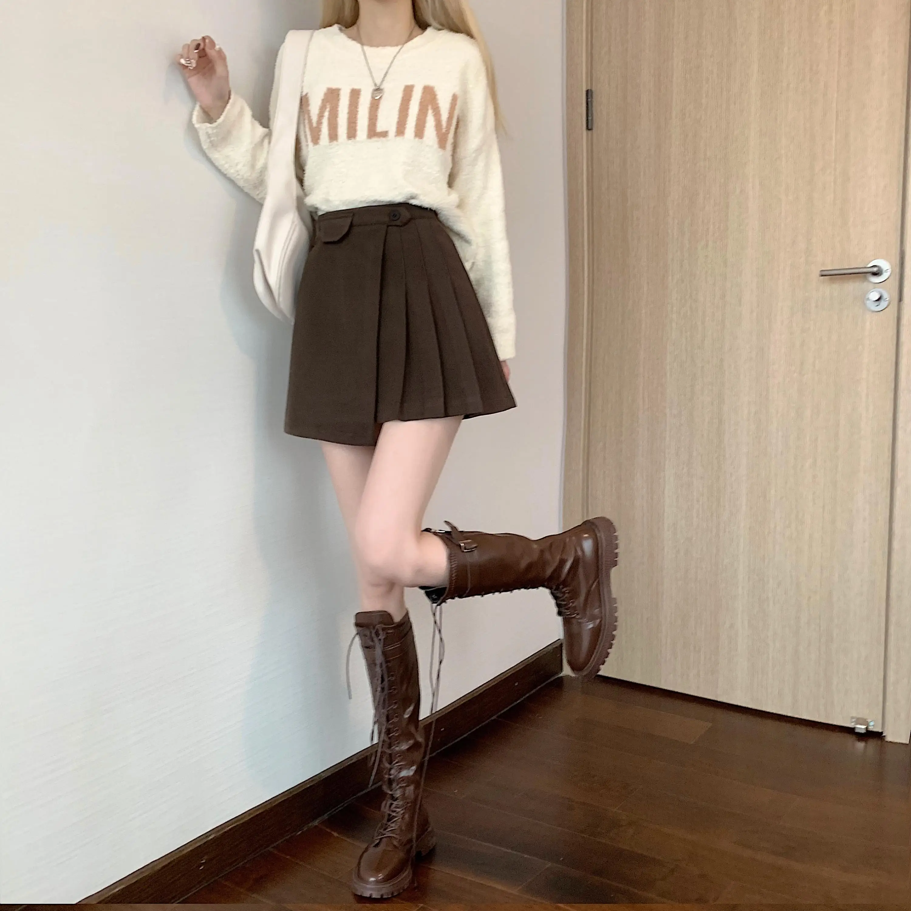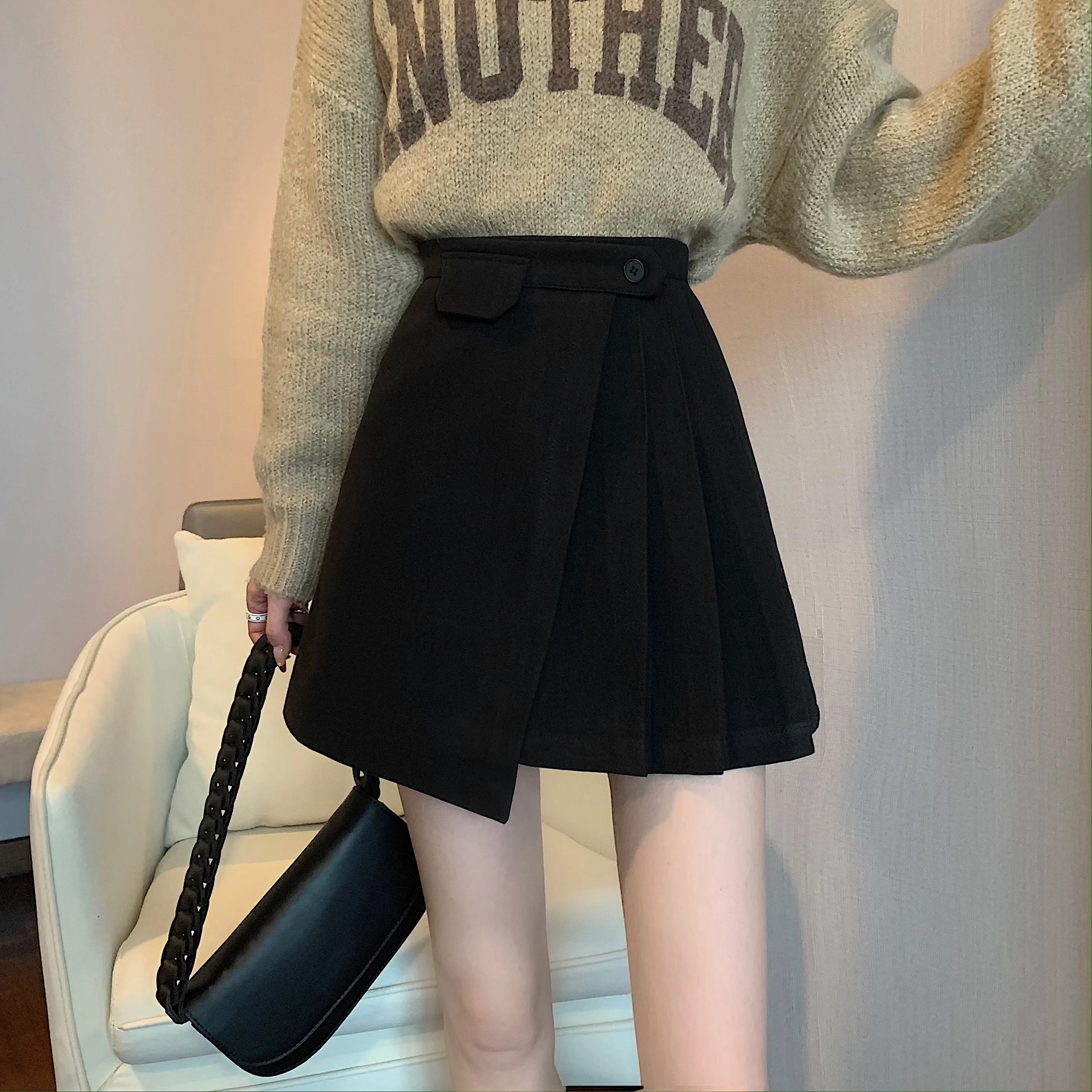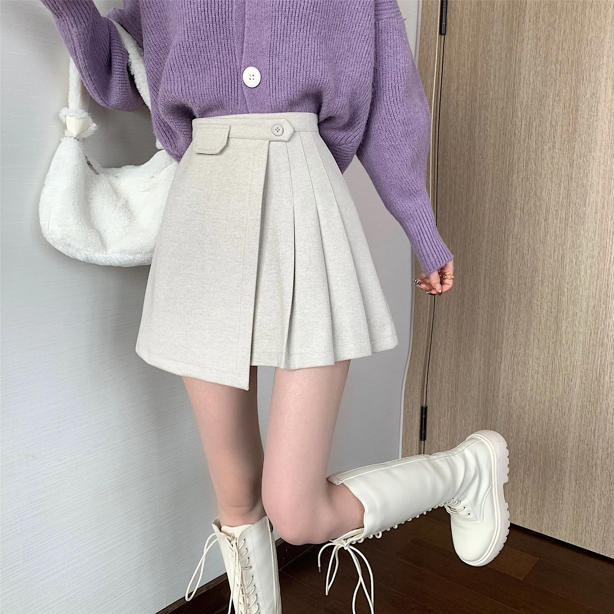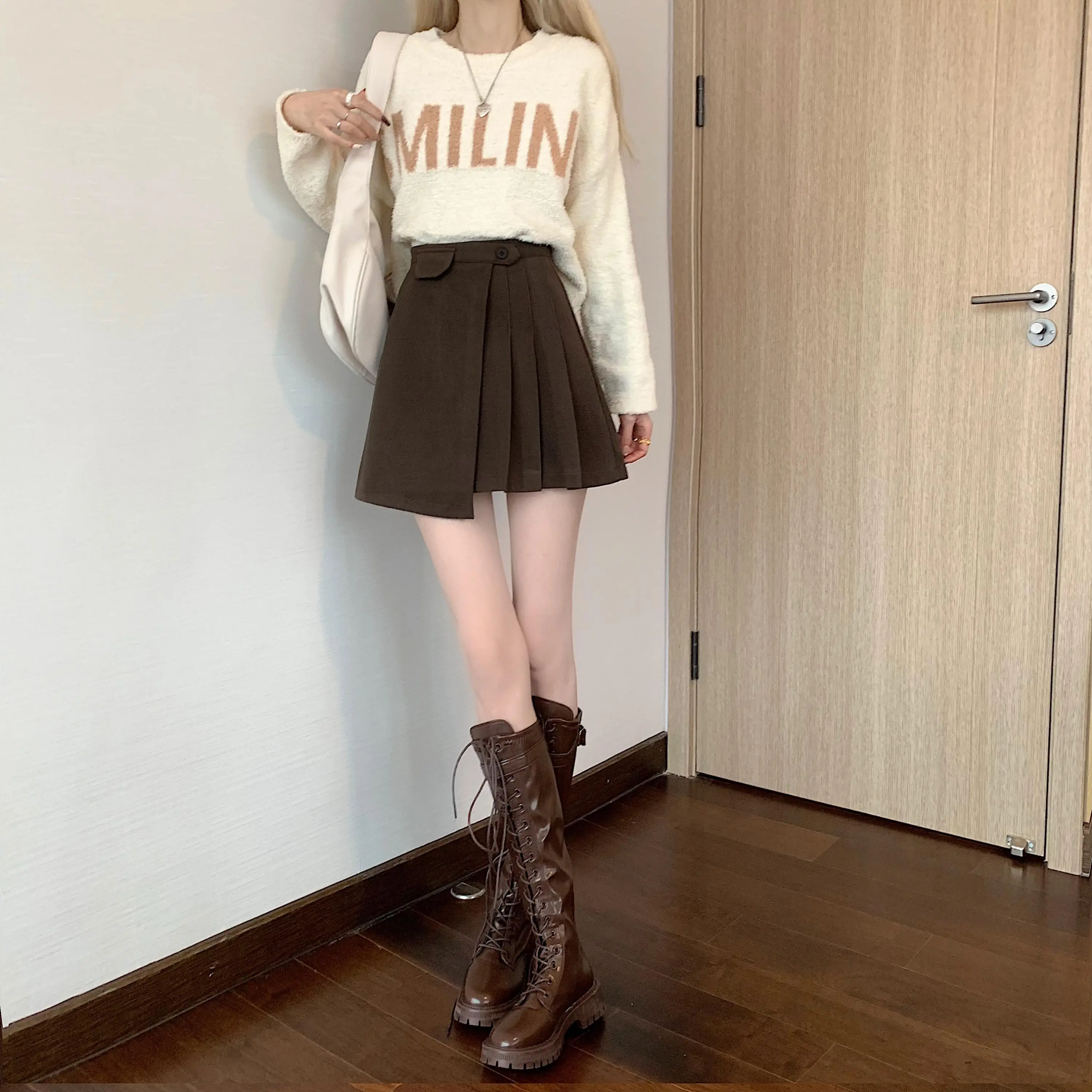 Yipinpay Autumn Winter Apricot Woolen Skirt Women High Waist Pleated Skirt