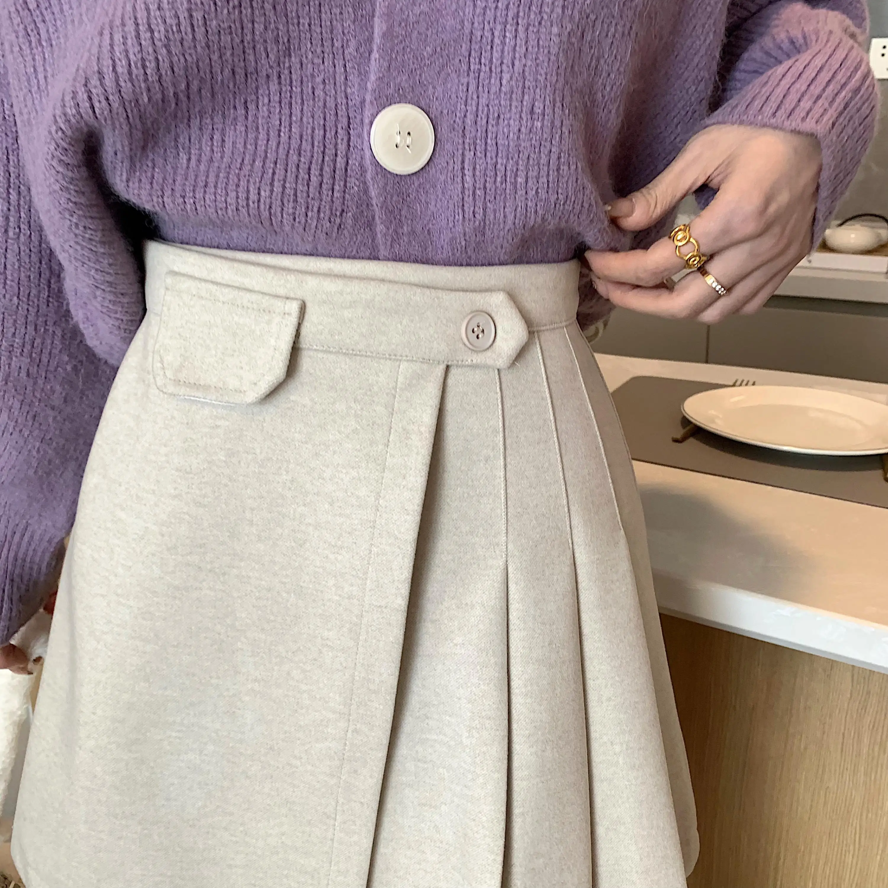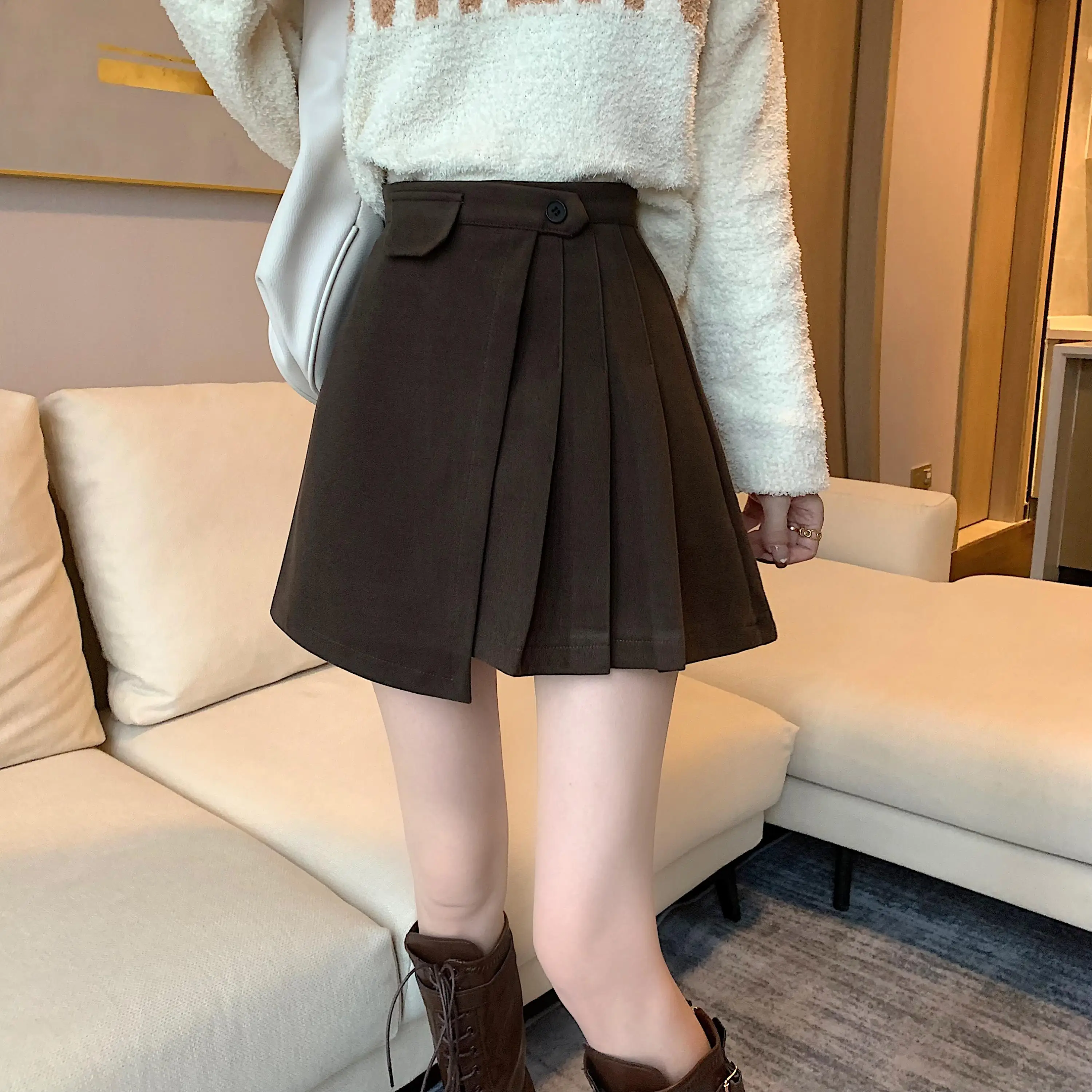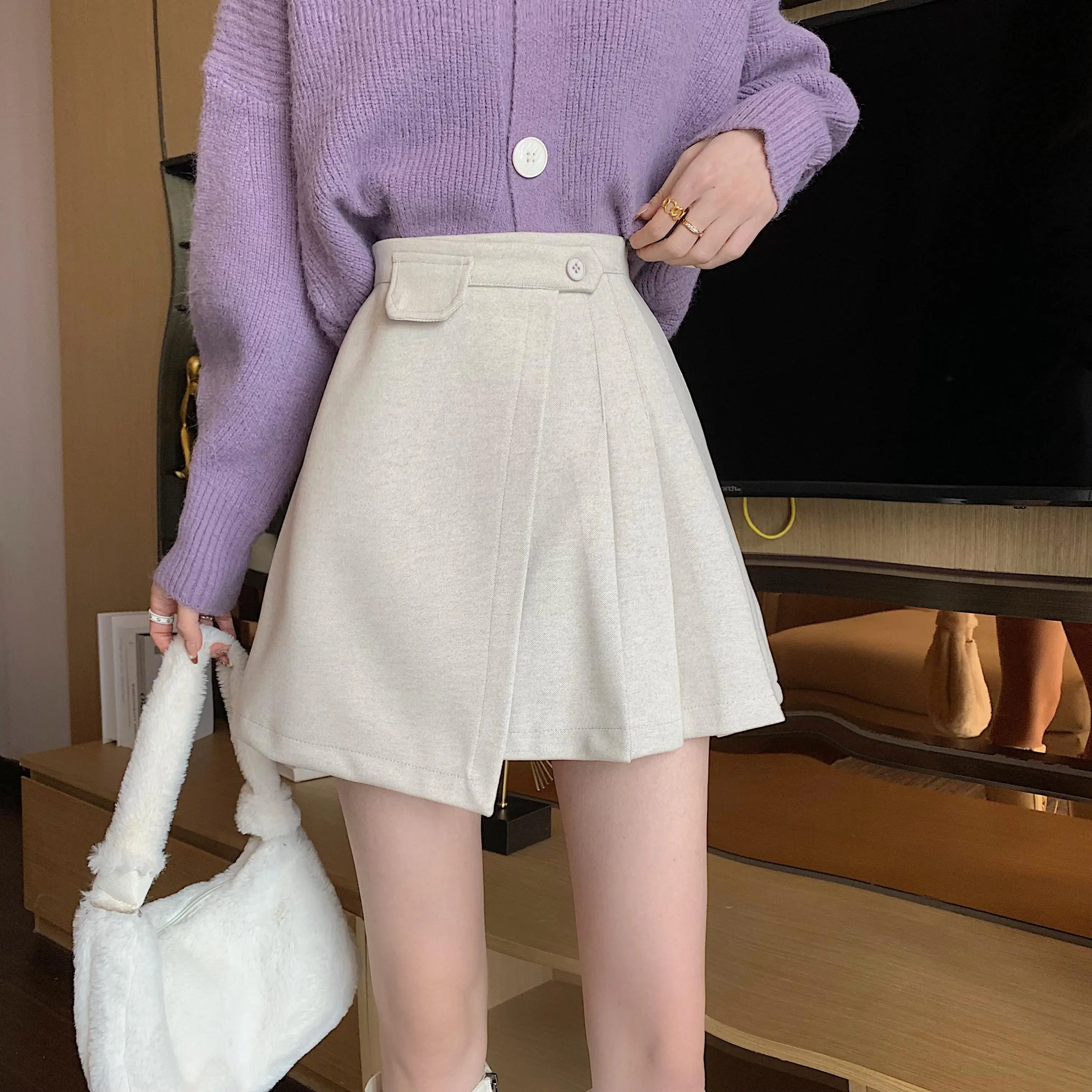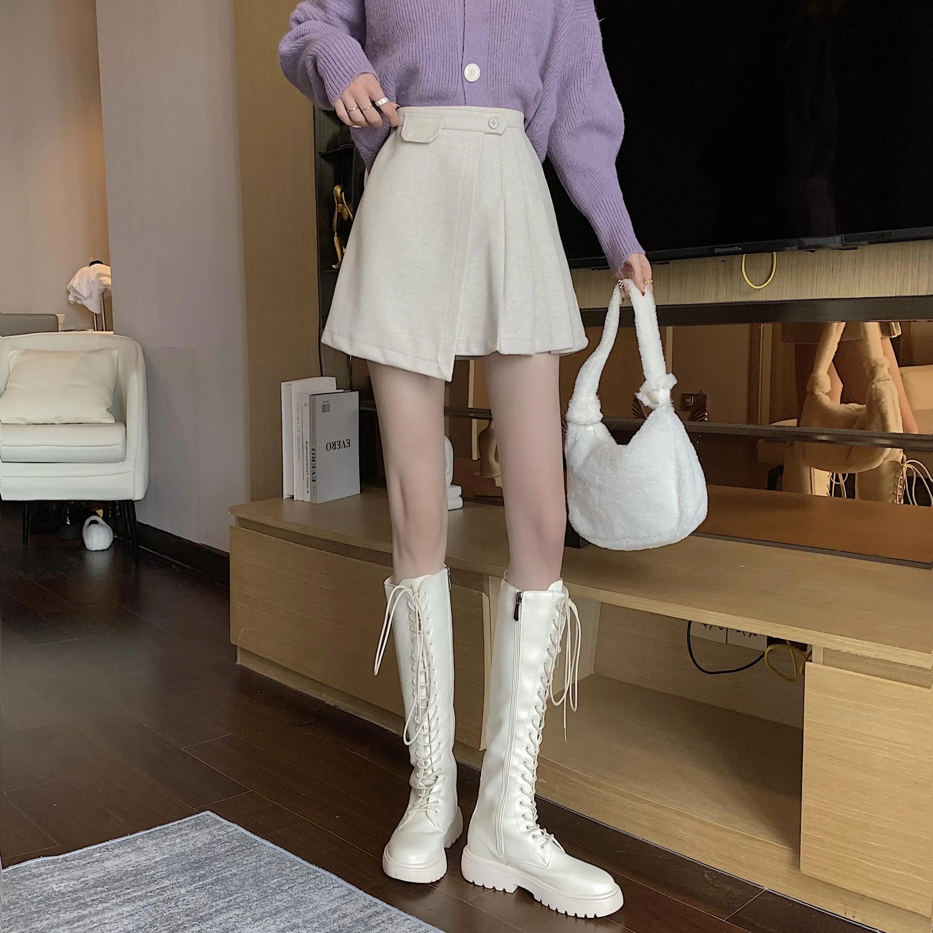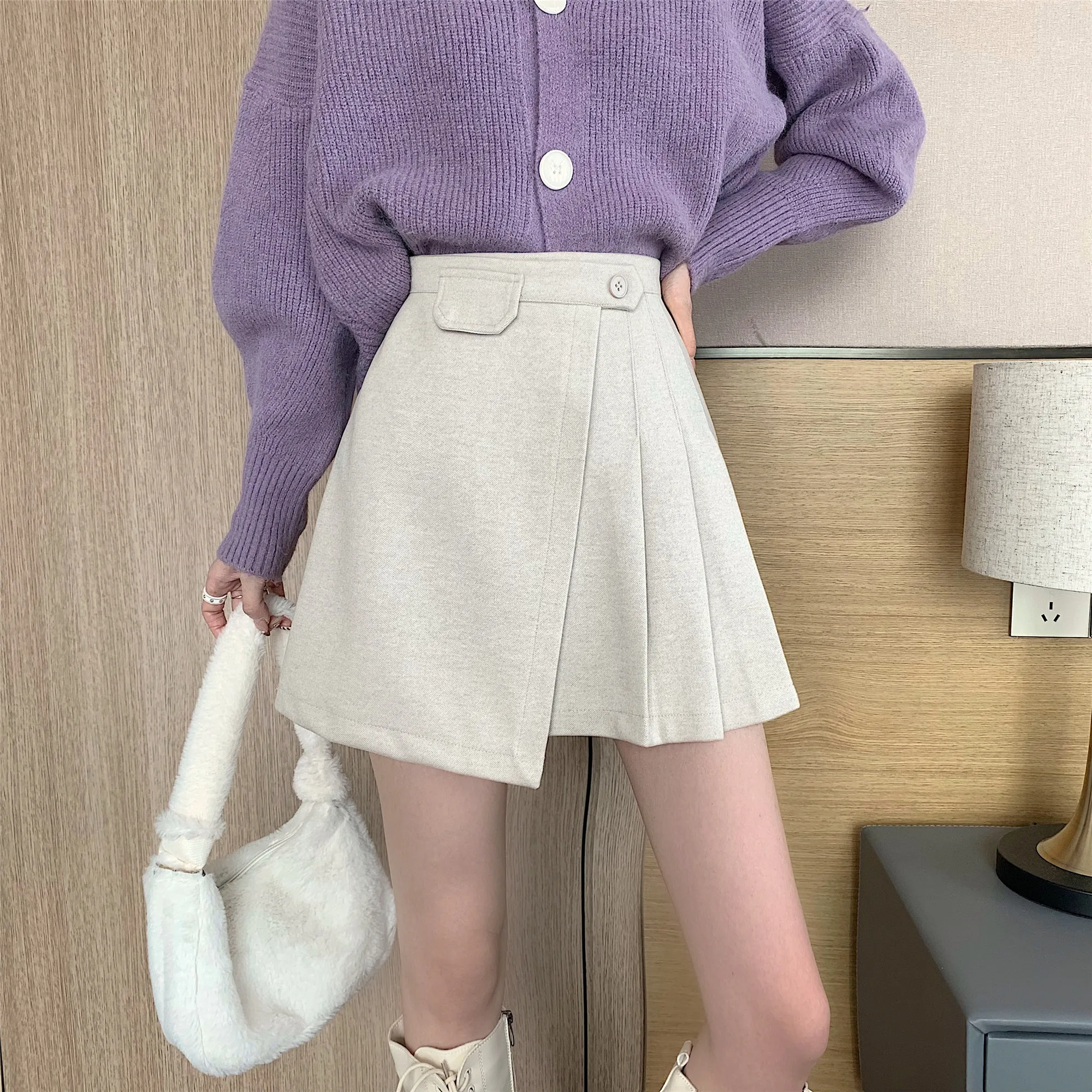 Yipinpay Autumn Winter Apricot Woolen Skirt Women High Waist Pleated Skirt
