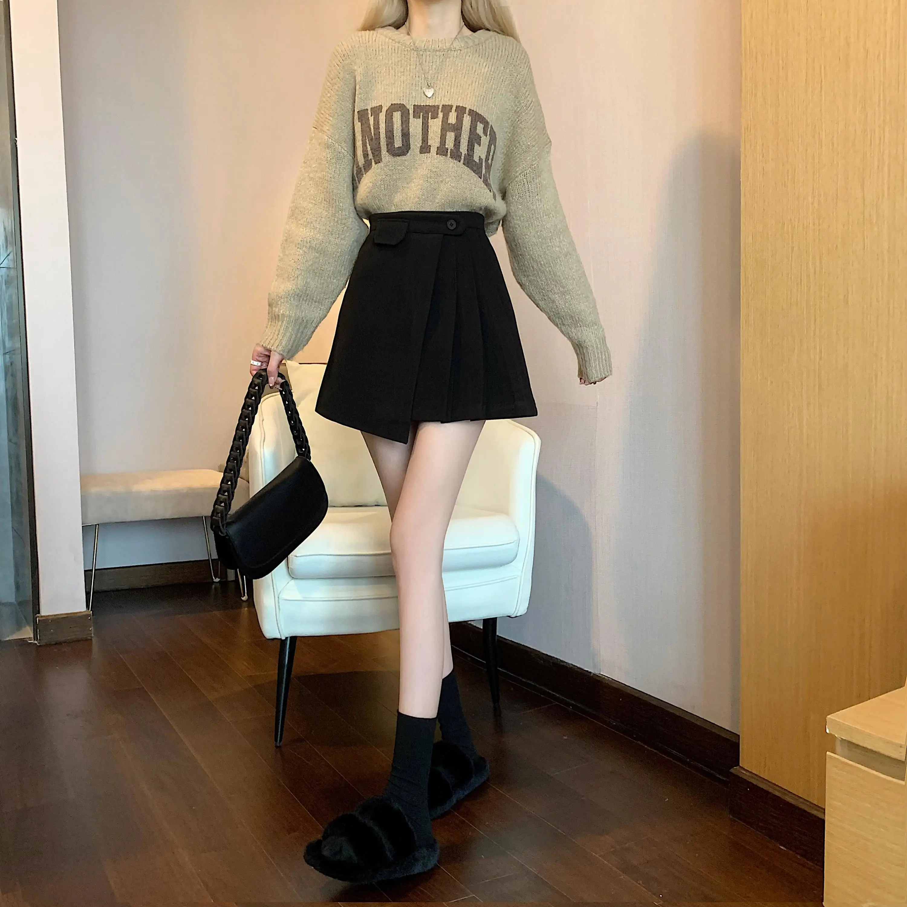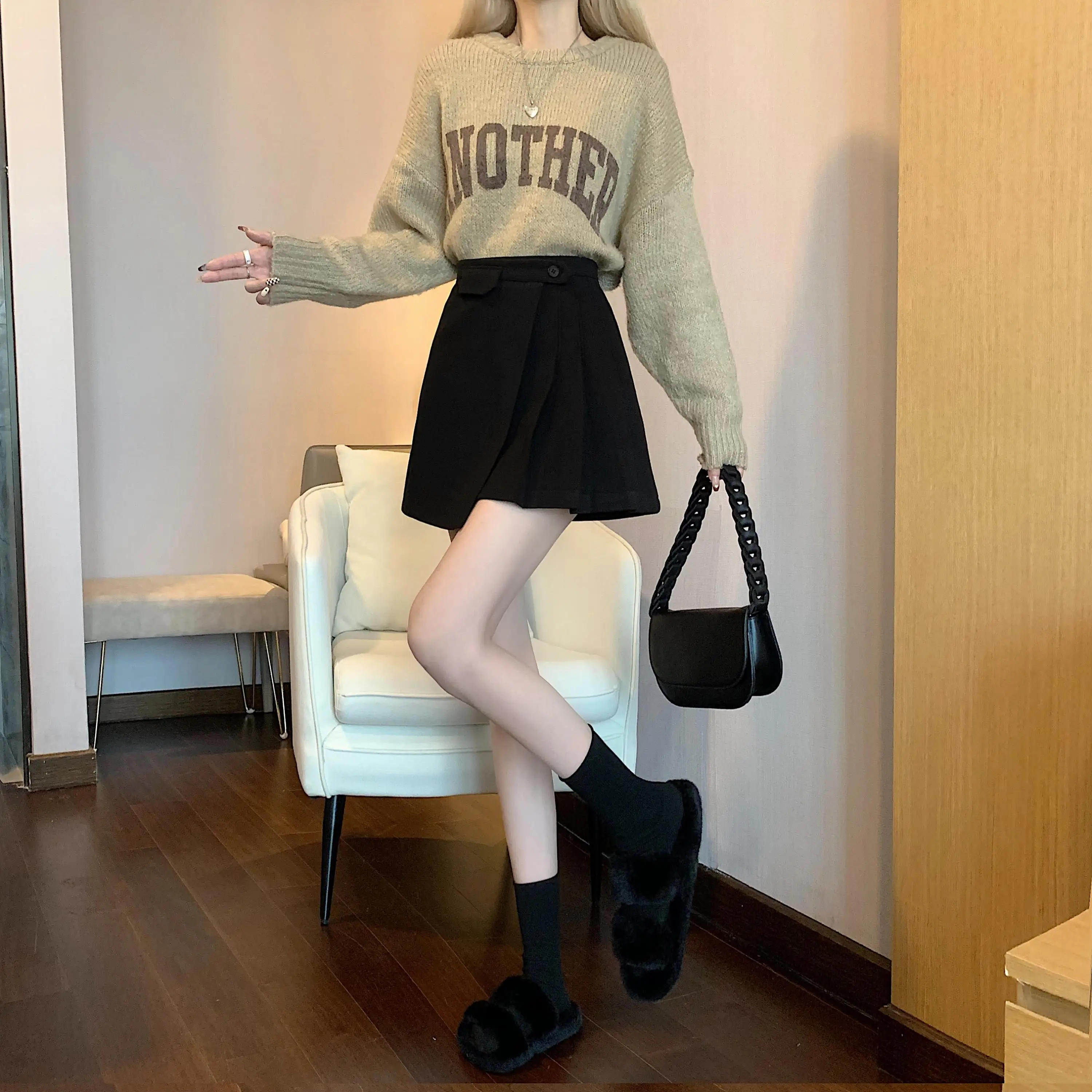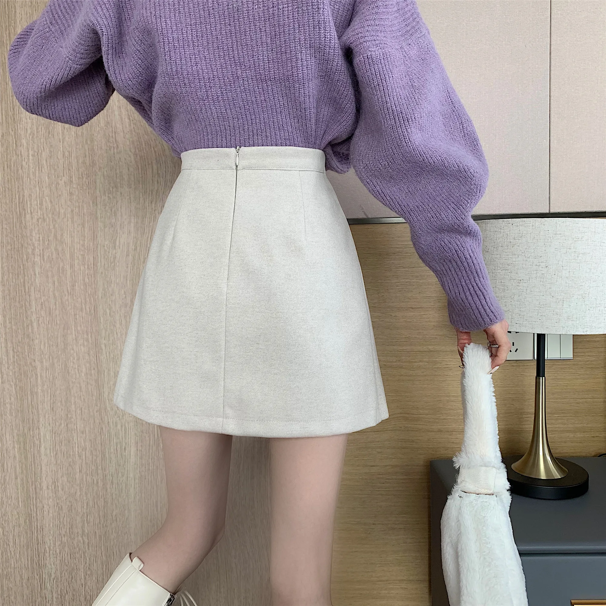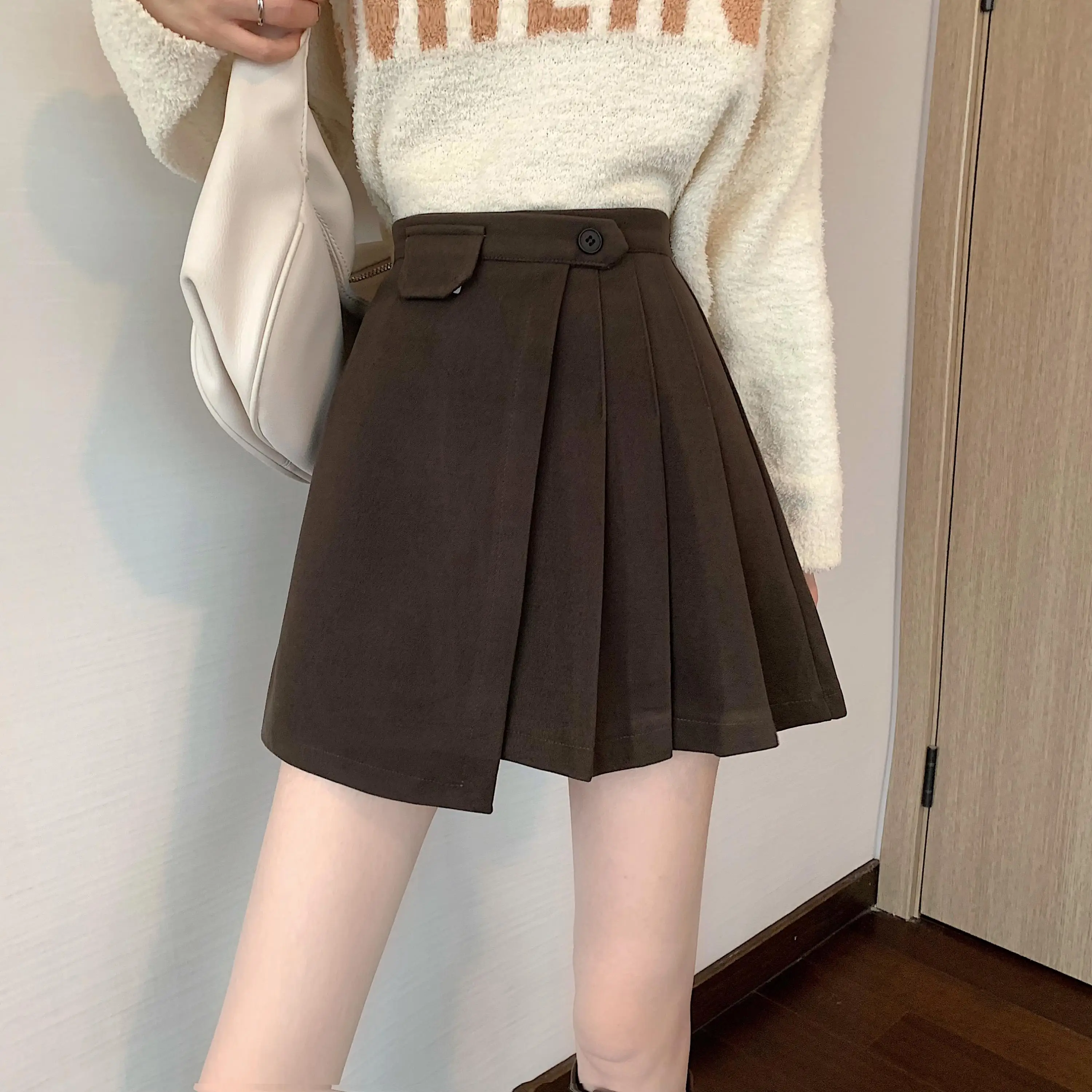 Yipinpay Autumn Winter Apricot Woolen Skirt Women High Waist Pleated Skirt