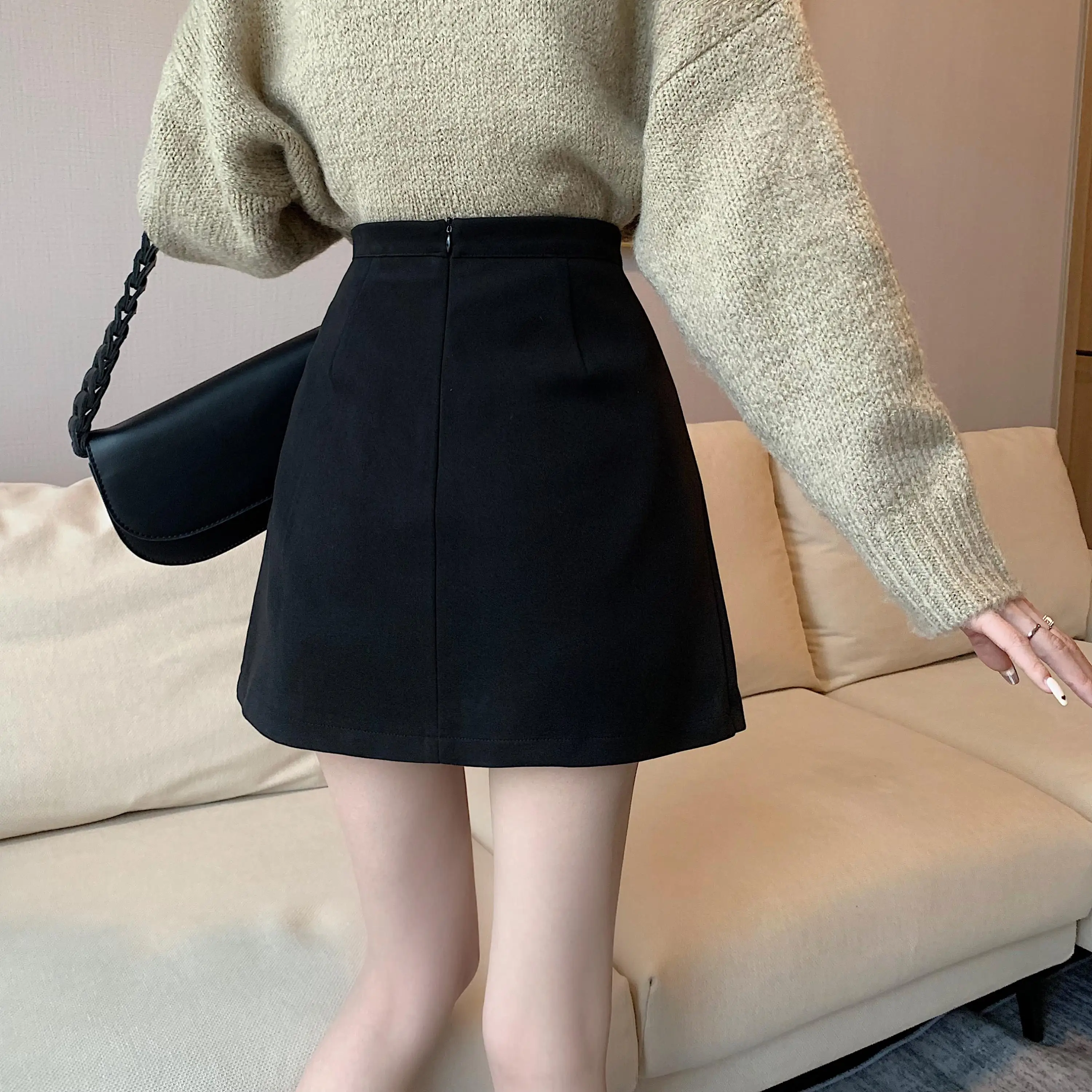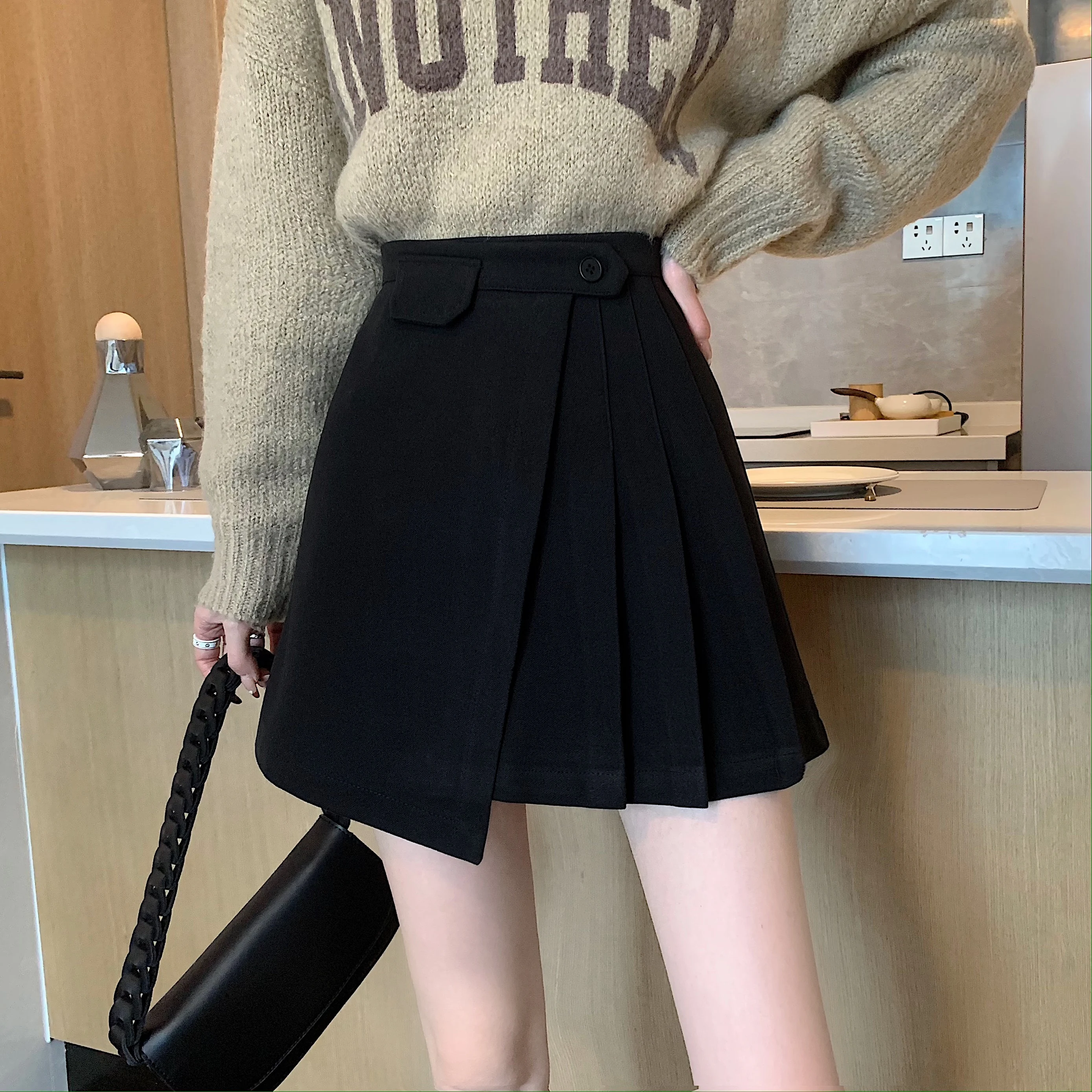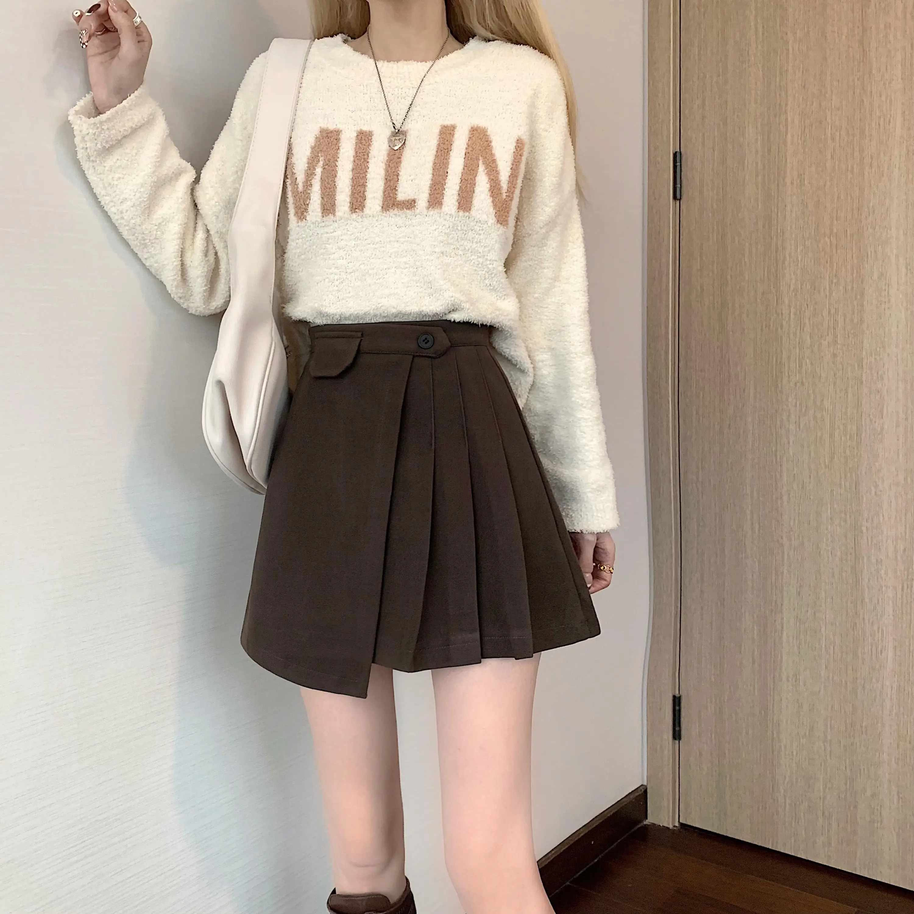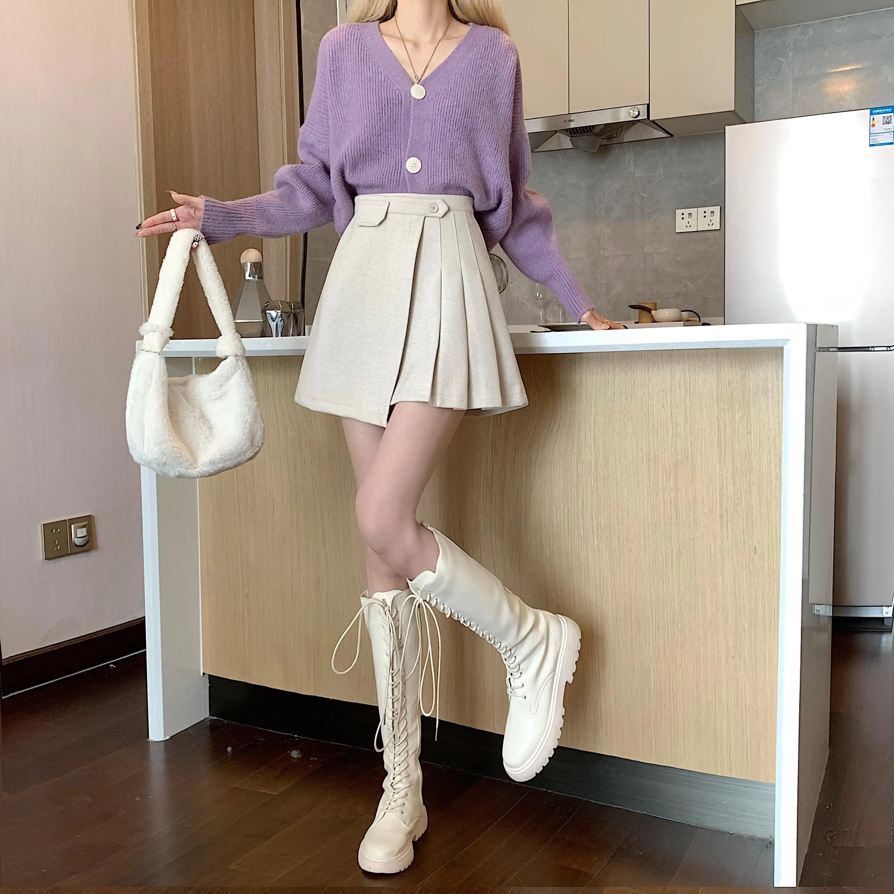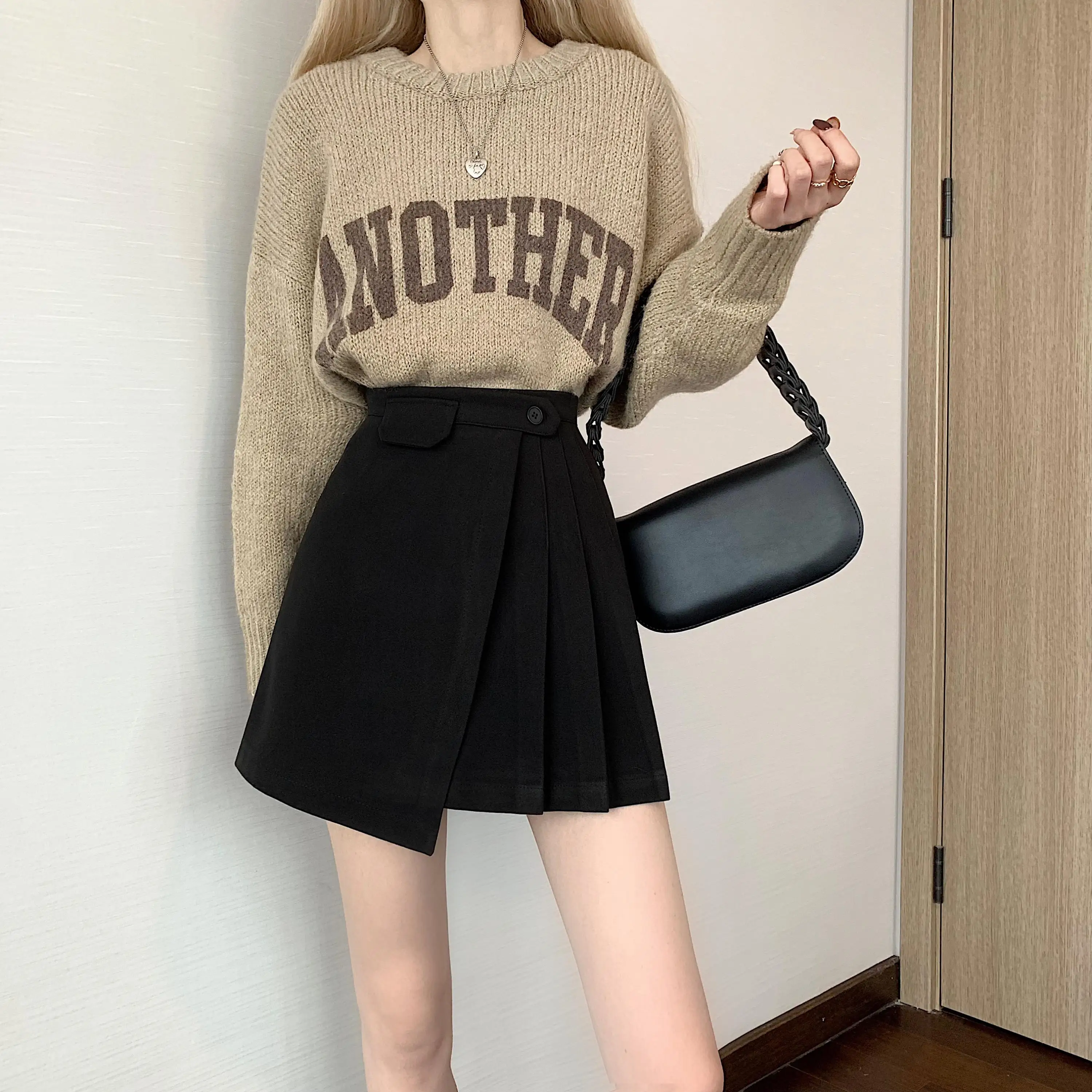 Yipinpay Autumn Winter Apricot Woolen Skirt Women High Waist Pleated Skirt
