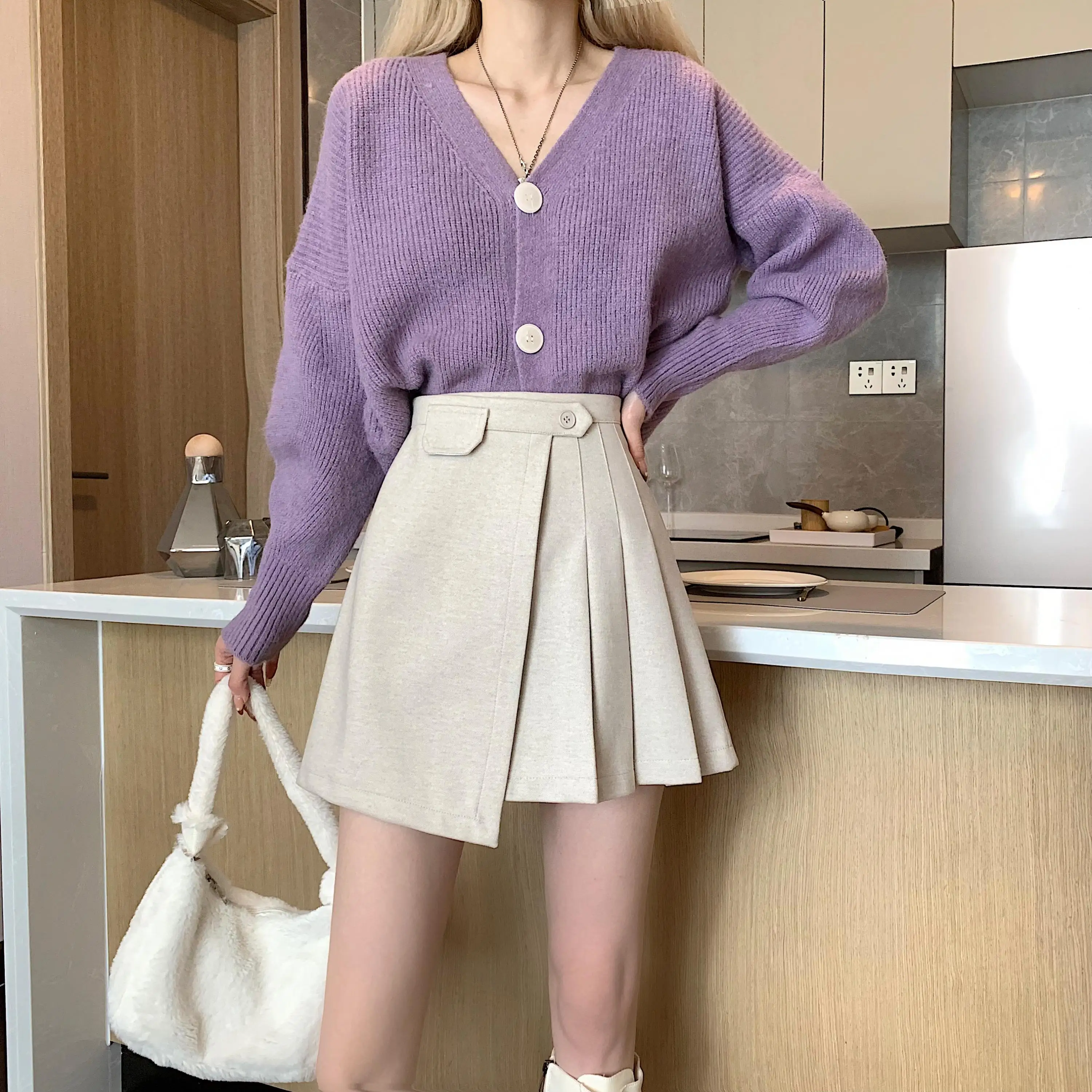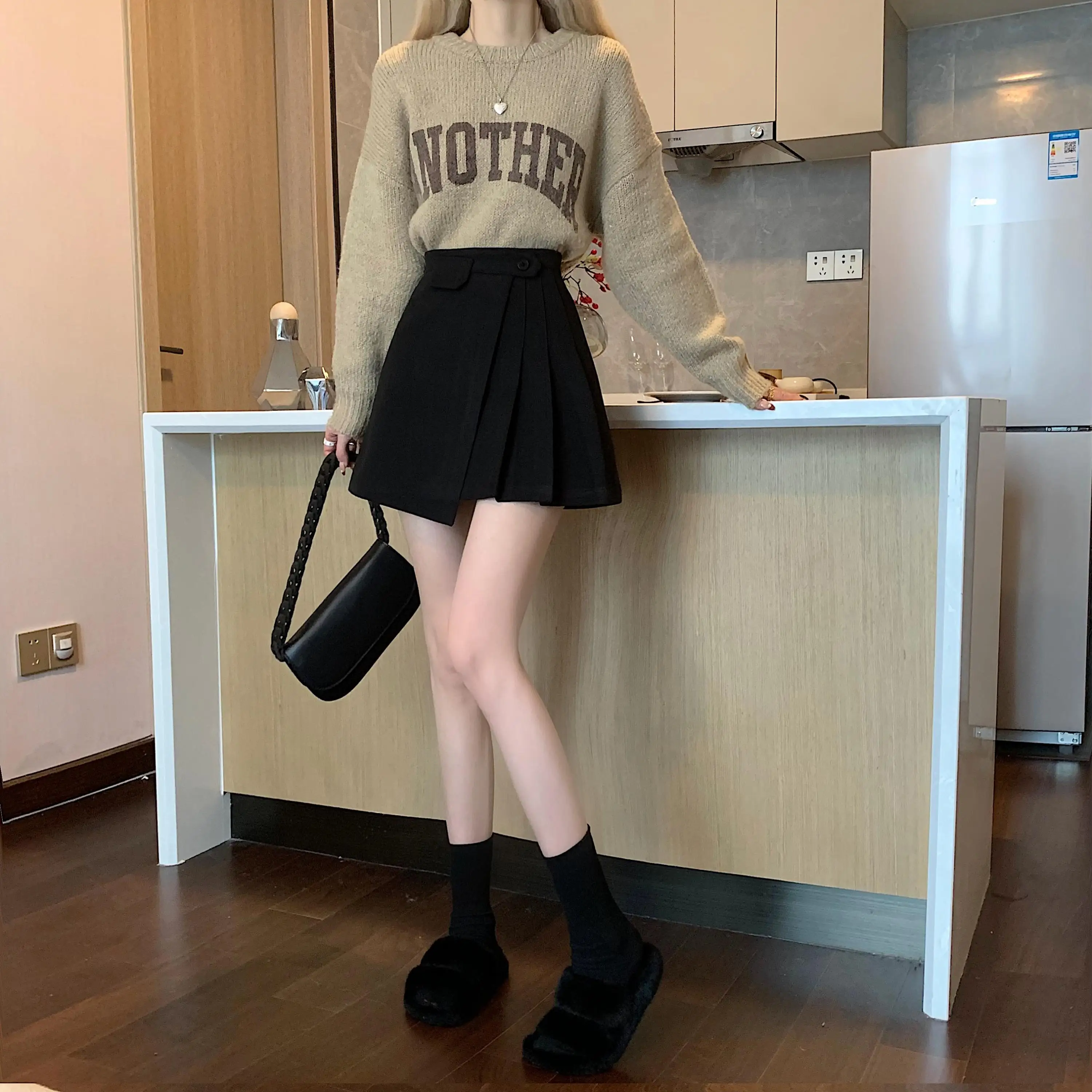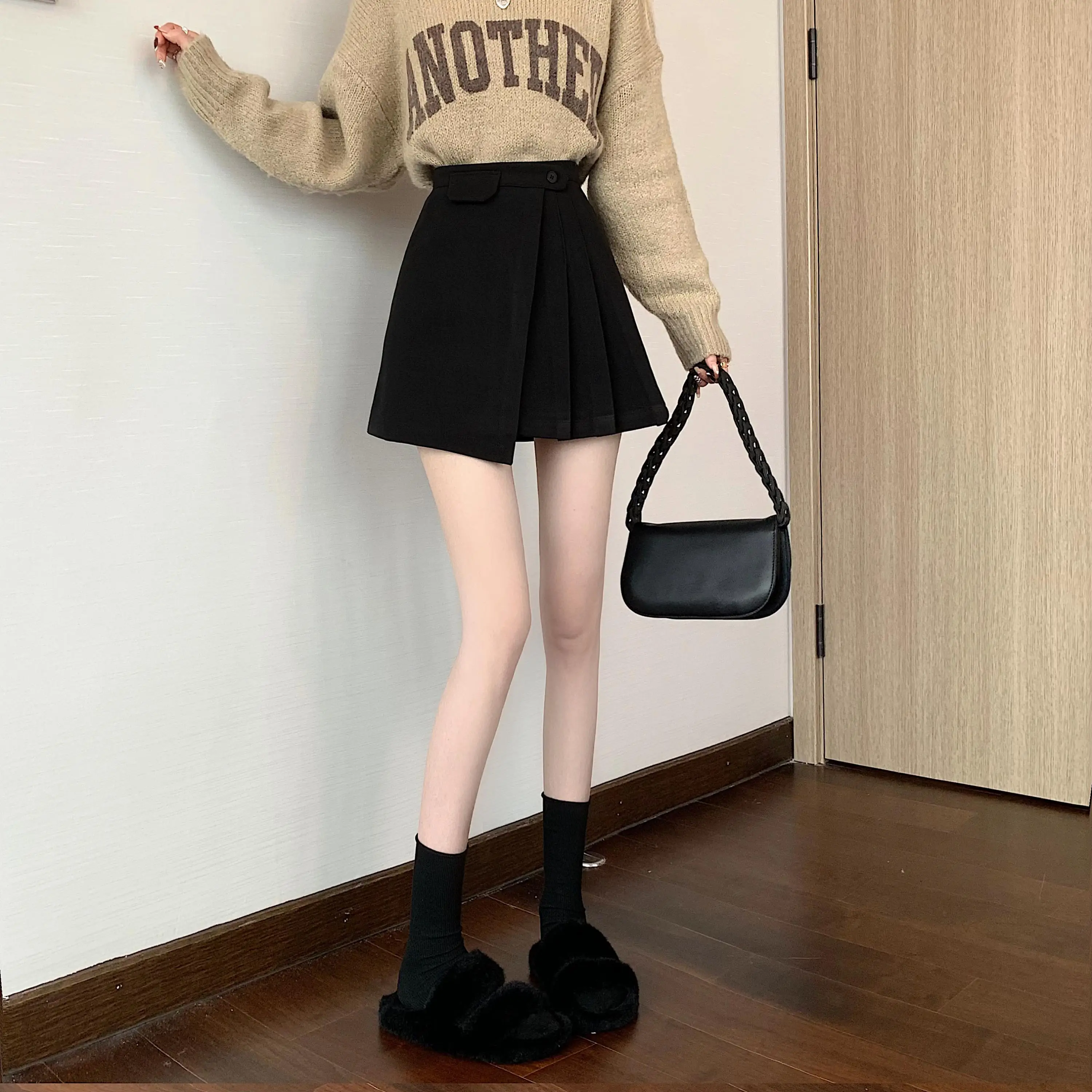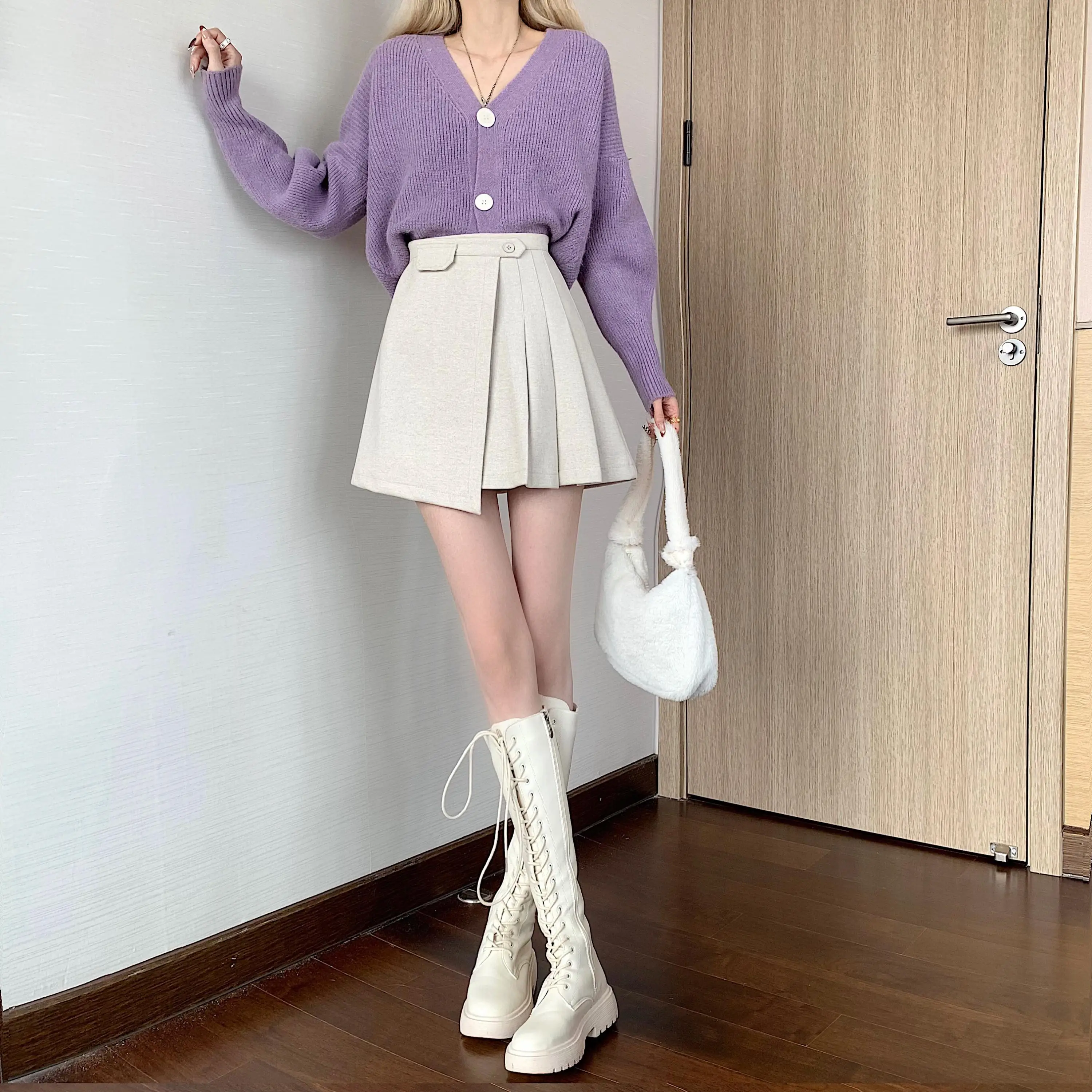 Yipinpay Autumn Winter Apricot Woolen Skirt Women High Waist Pleated Skirt