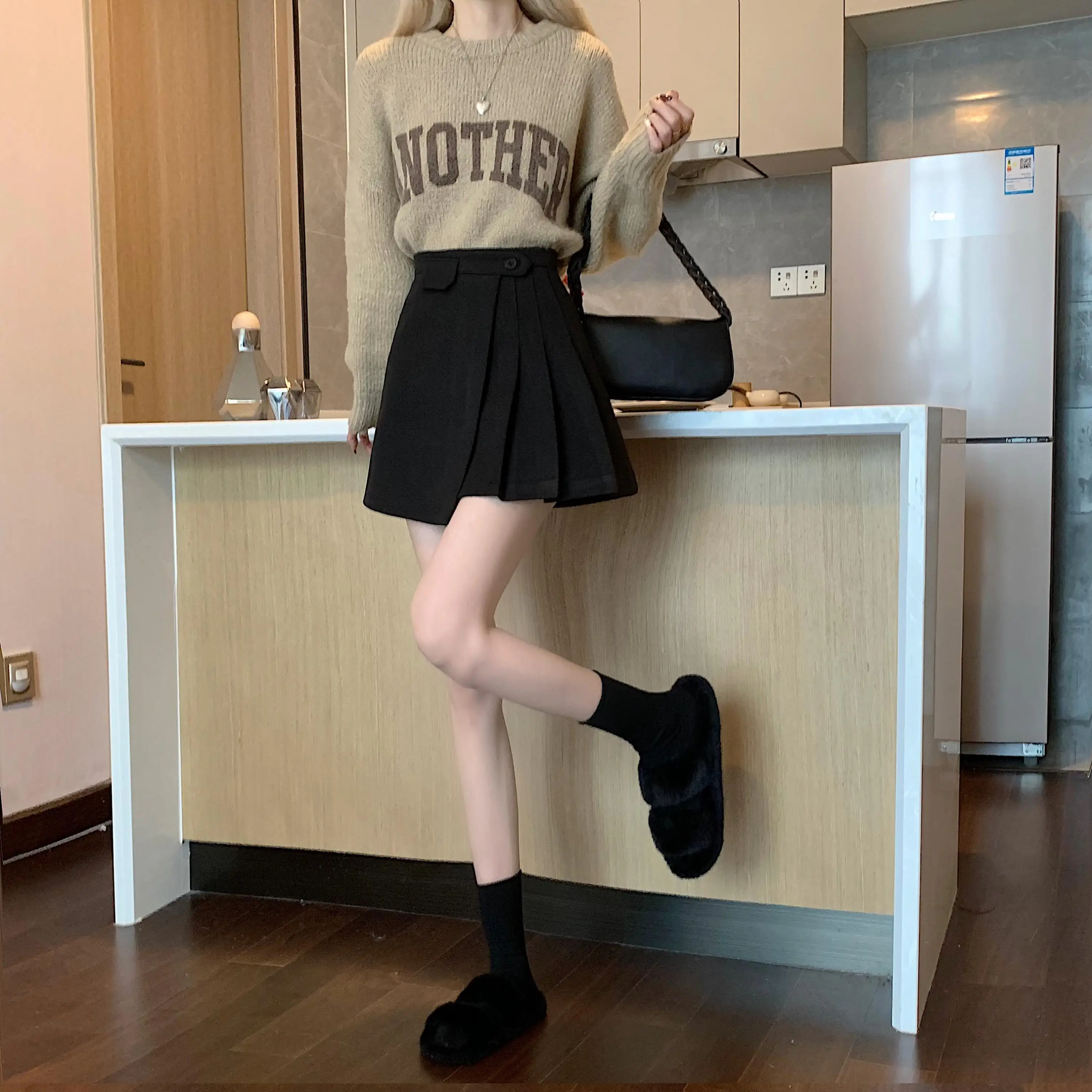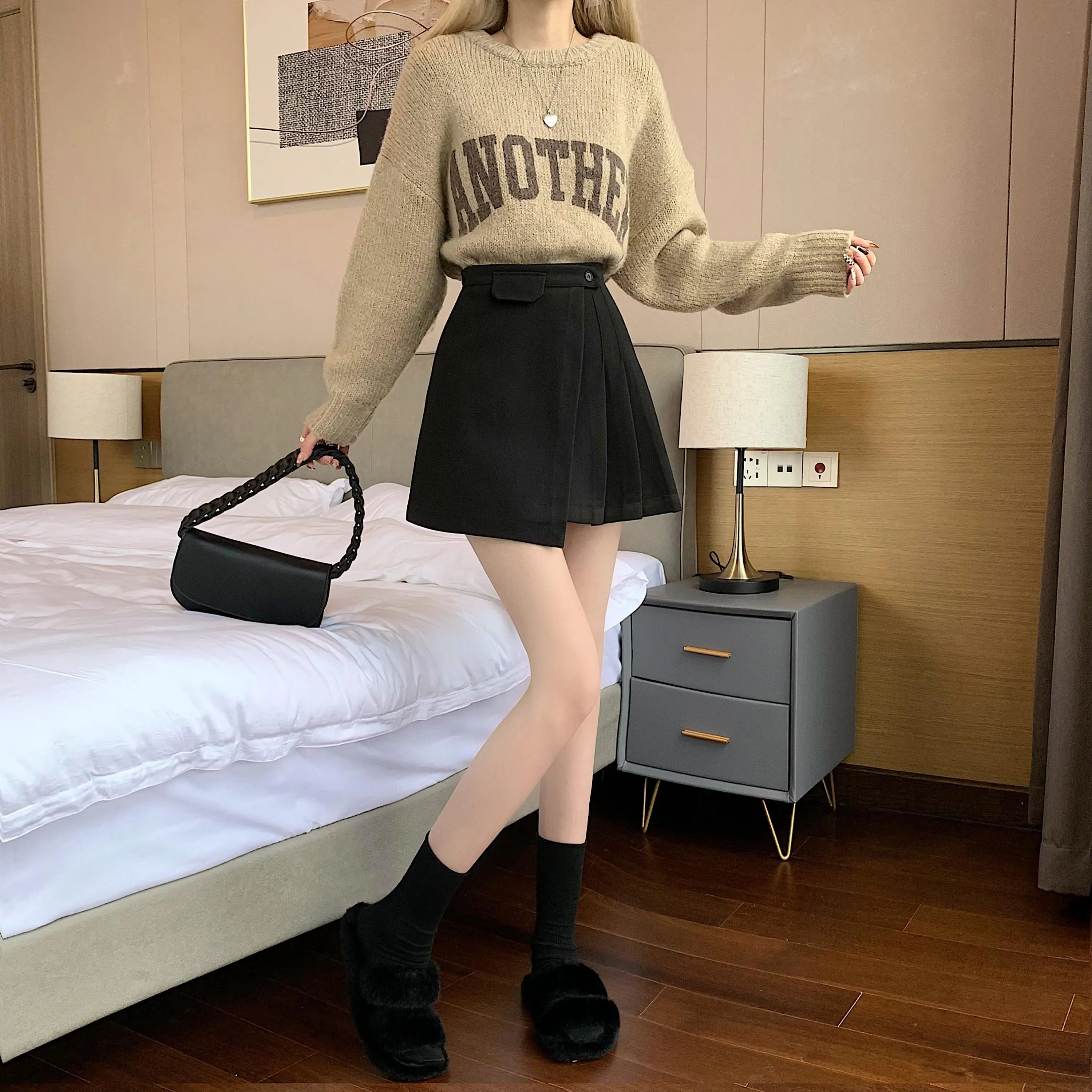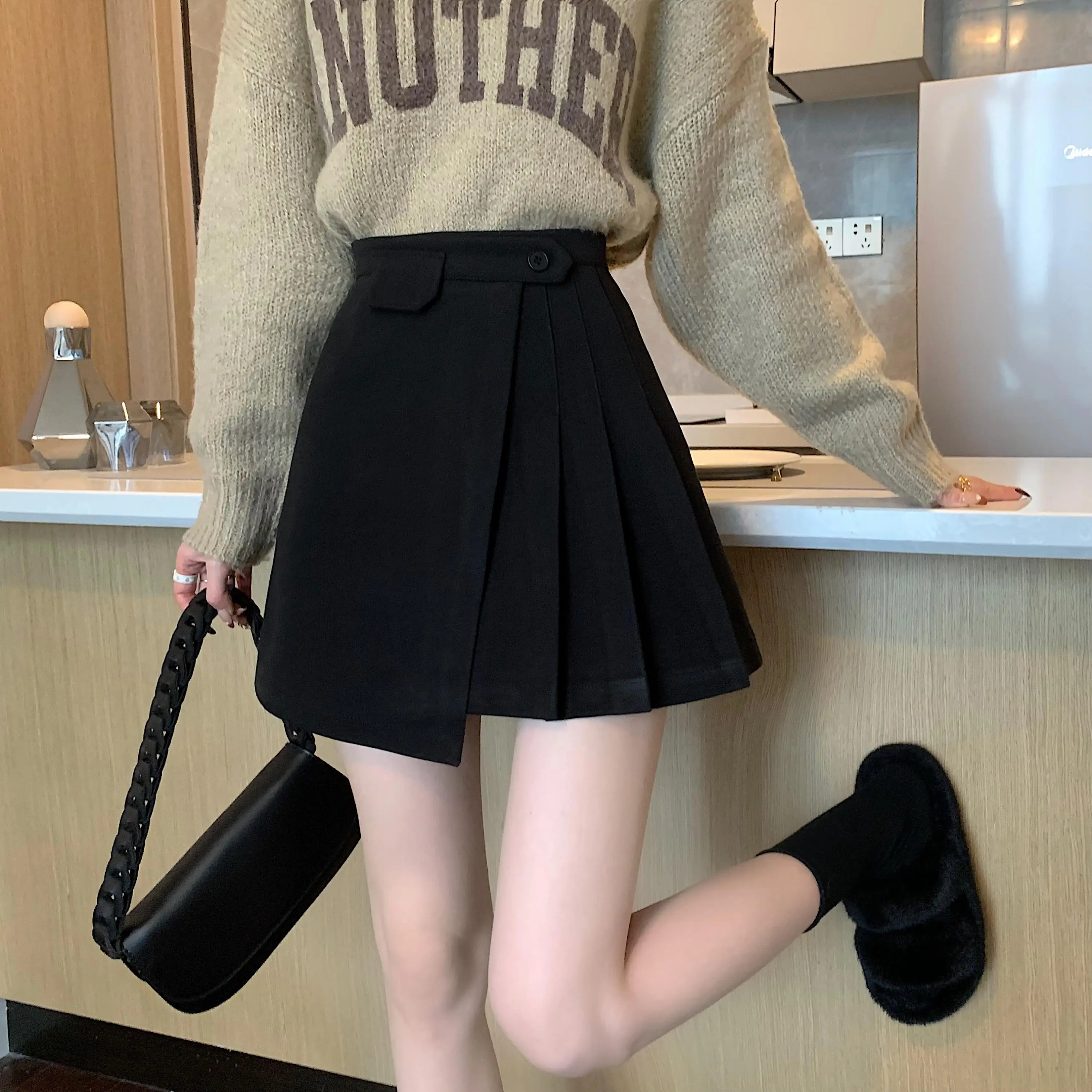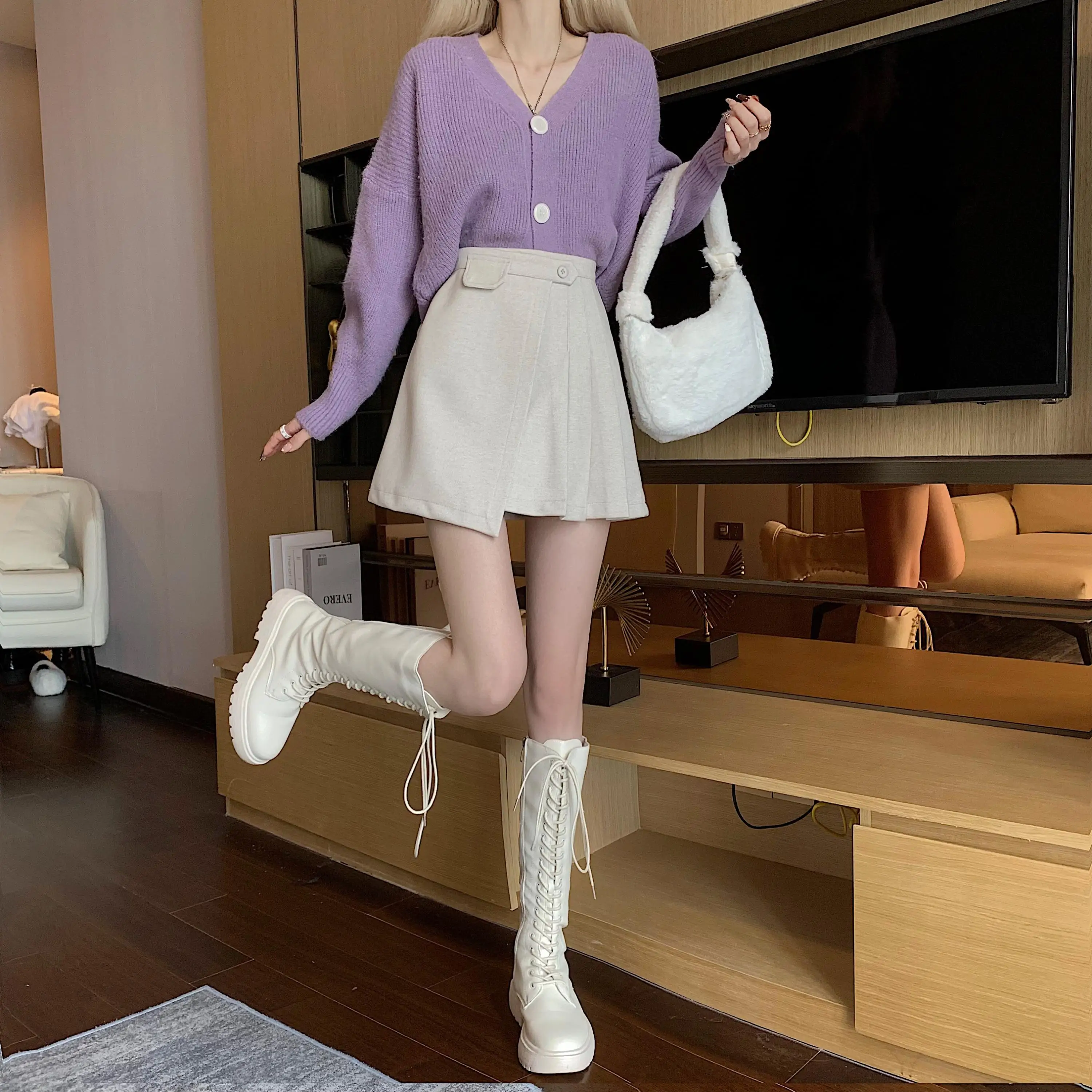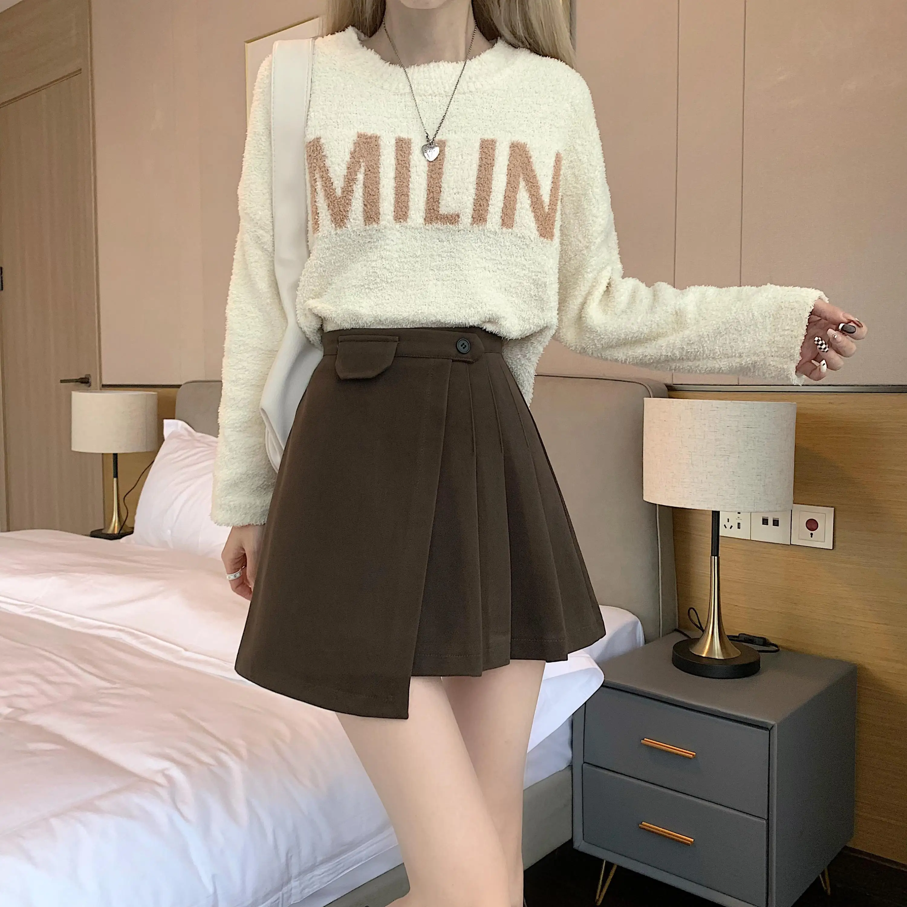 Yipinpay Autumn Winter Apricot Woolen Skirt Women High Waist Pleated Skirt