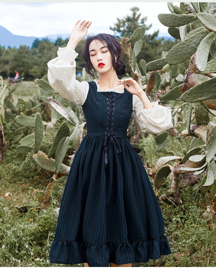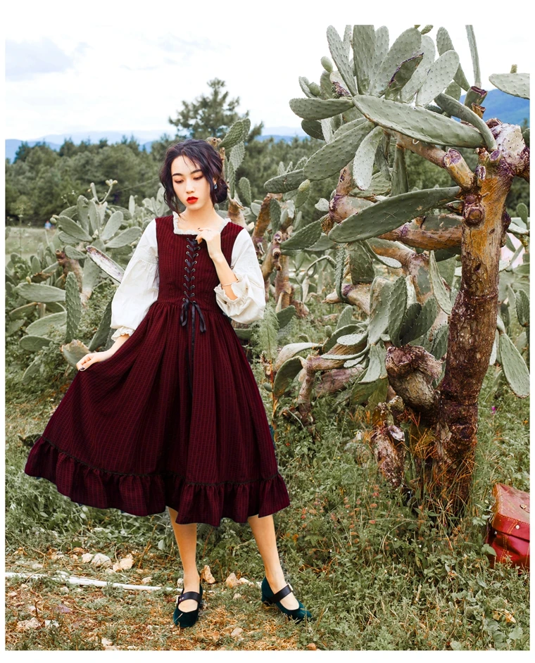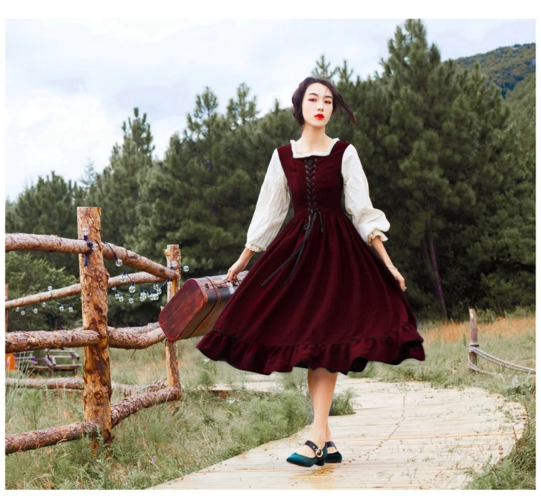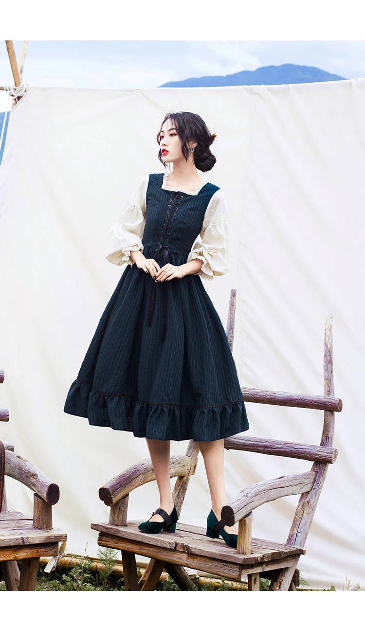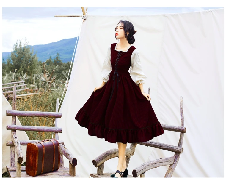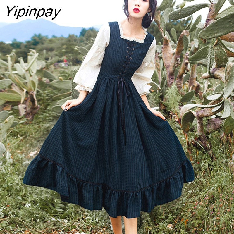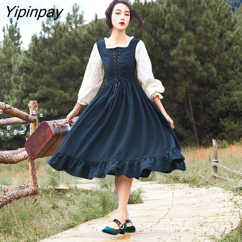 Yipinpay Autumn Winter Women Dress Vintage Lantern Sleeve Ruffles Tutu Dresses Sweet Lace-up High Waist Retro Female Bing