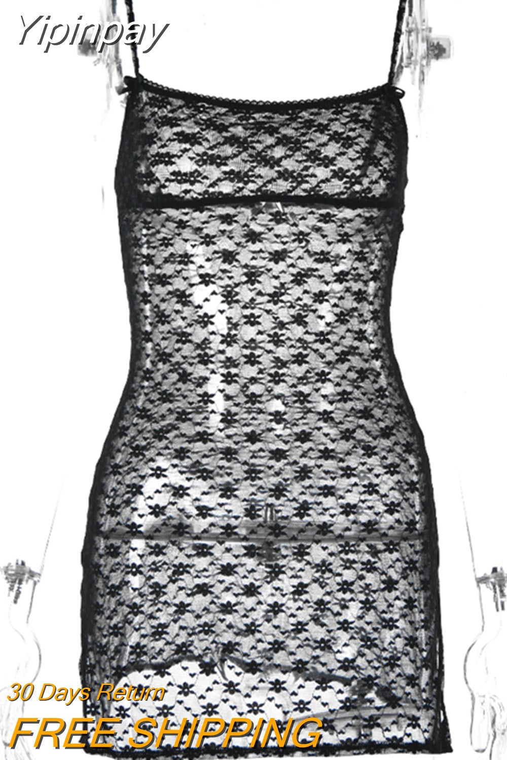 Yipinpay Backless Lace Transpanrent Slip Mini Dress for Girls Elegant Summer Y2K Fairy Grunge Sleeveless Slit Dresses