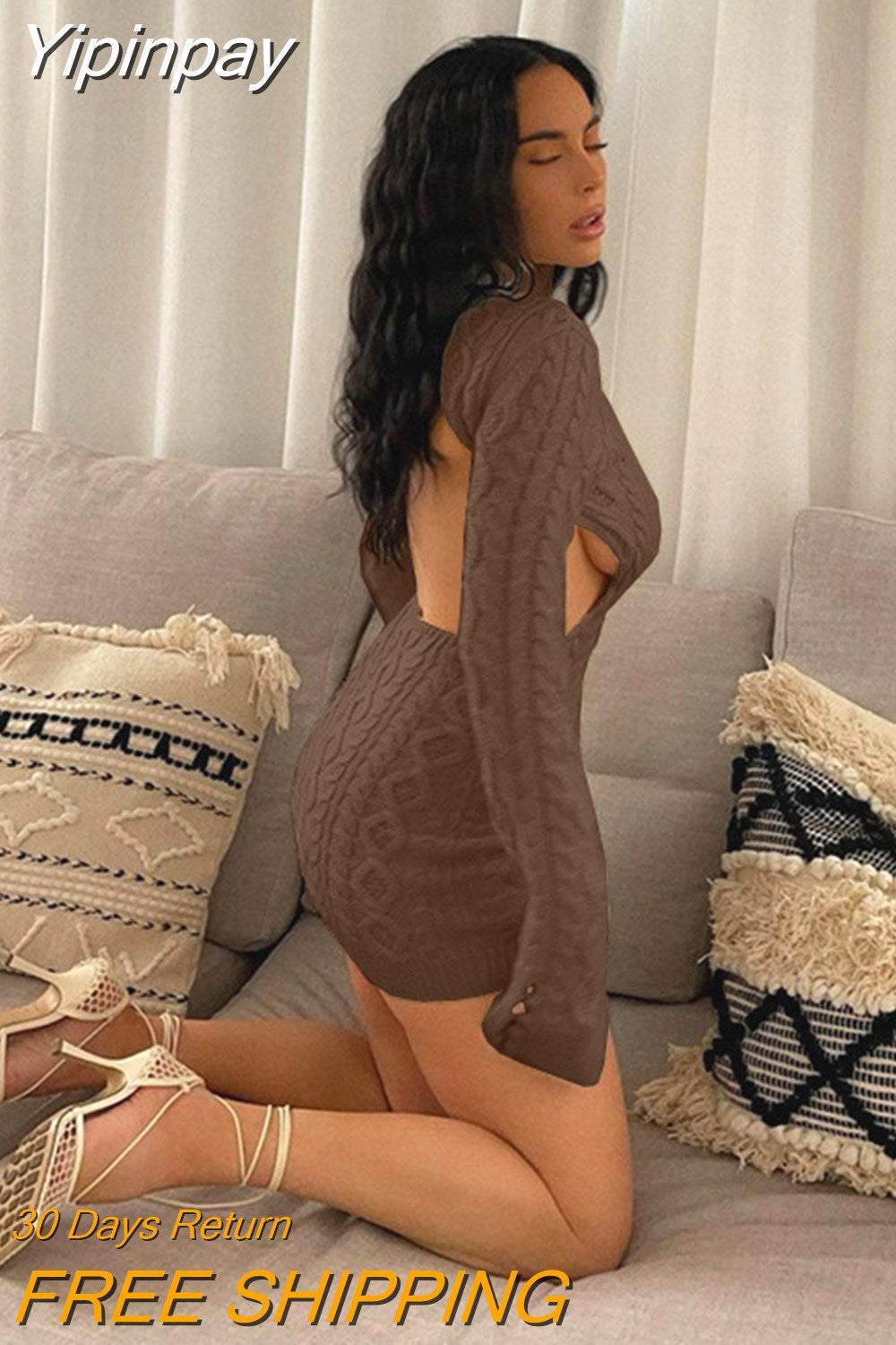 Yipinpay Backless Mini Knitted Dress Women Autumn Long Sleeve Top Hollow Out Pullovers Party Club Casual Bodycon Turtleneck Sweater