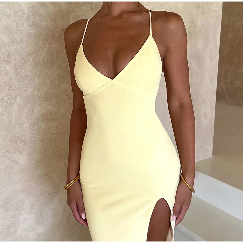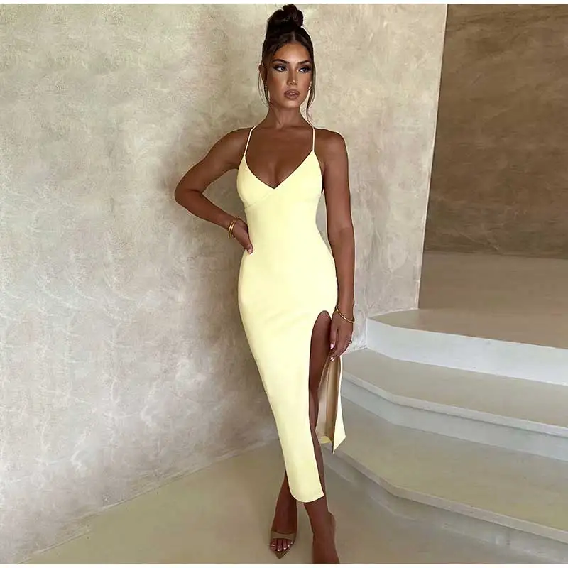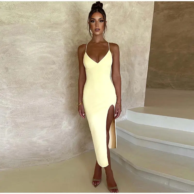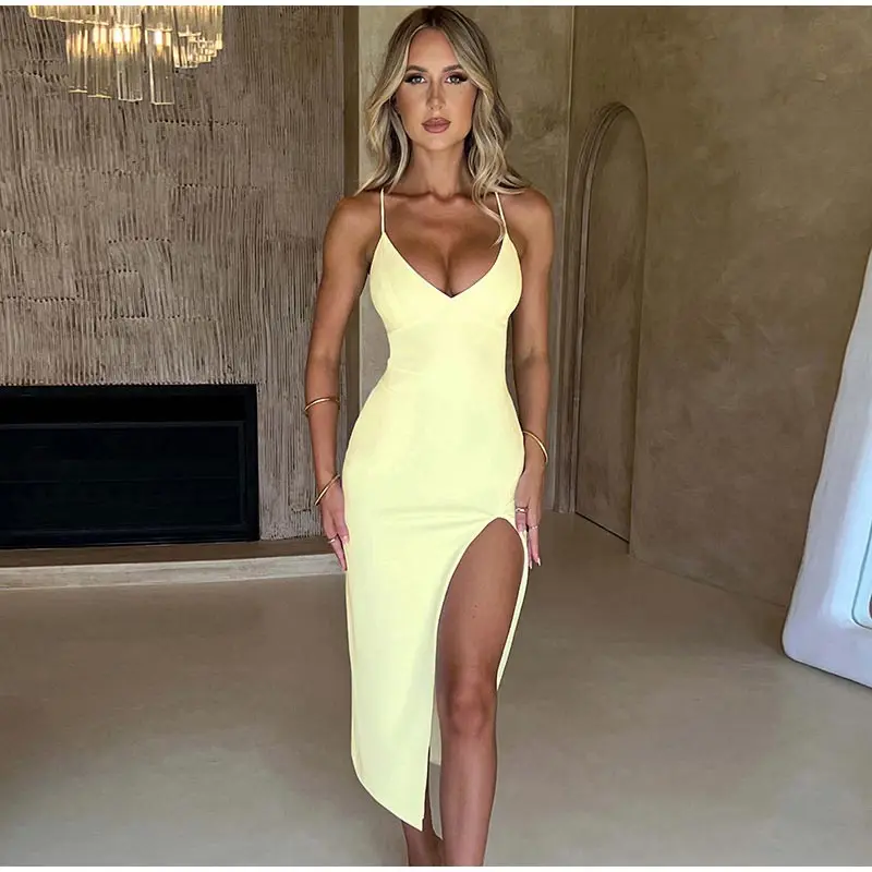 Yipinpay Backless Split Spaghetti Strap Maxi Dress 2023 Summer Women Chic V Neck Sleeveless Dress Casual Solid Vacation Lady Vestido