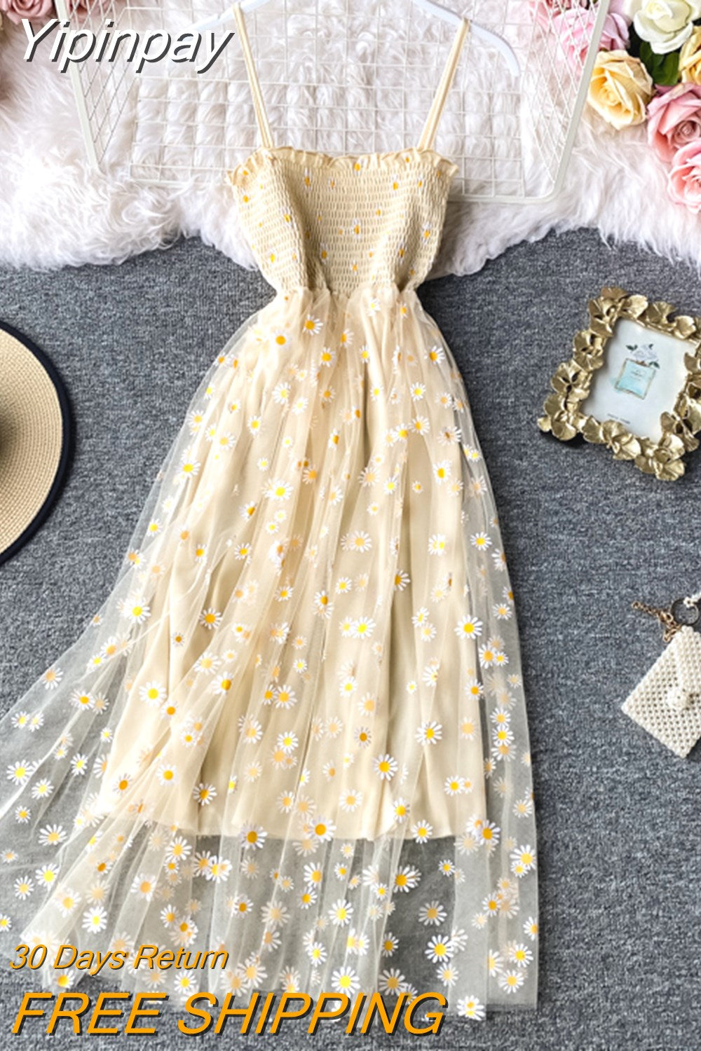 Yipinpay Beach Mesh Women Floral Dress Fashion Elegant Sexy Summer Sundress Strappy Dress Party Night Korean Kawaii Vestidos