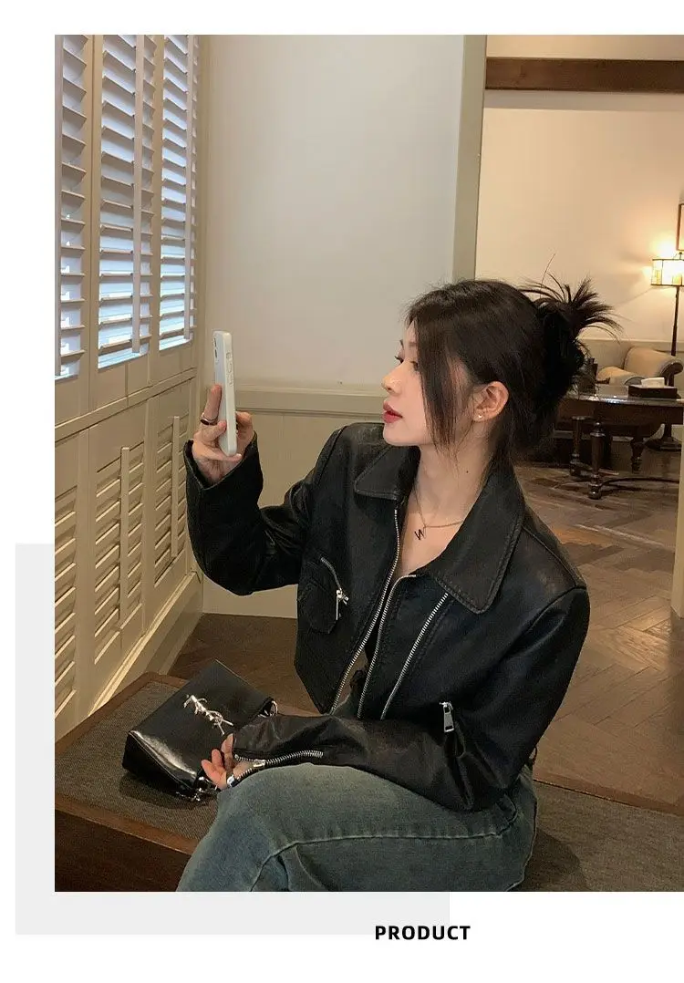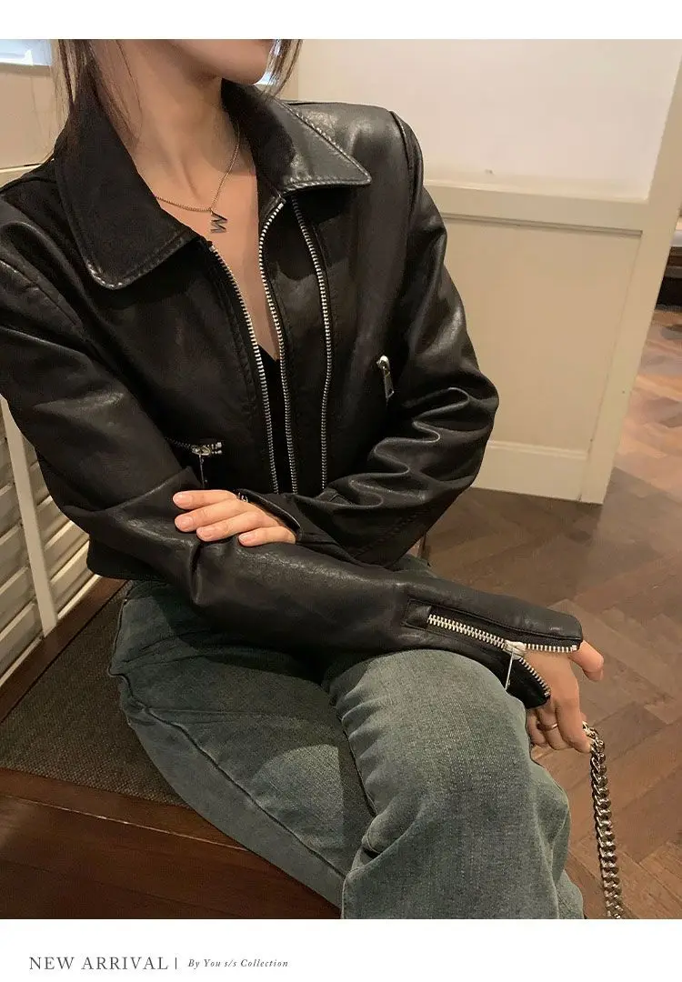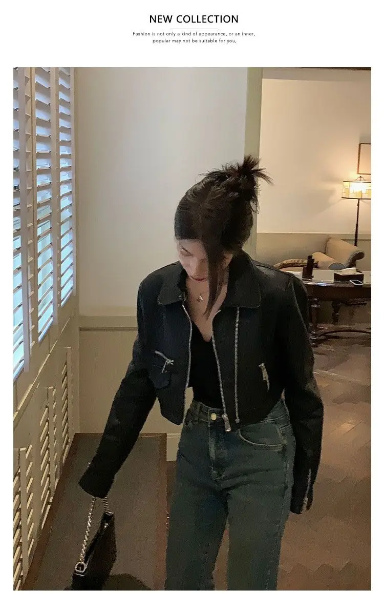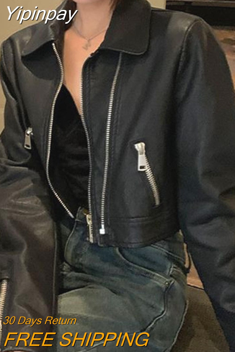 Yipinpay Black Cropped Leather Jacket Women Streetwear Zipper Moto Leather Jacket High Street Vintage Soft Faux Leather Coats 2023
