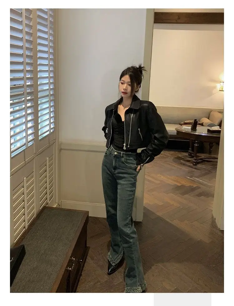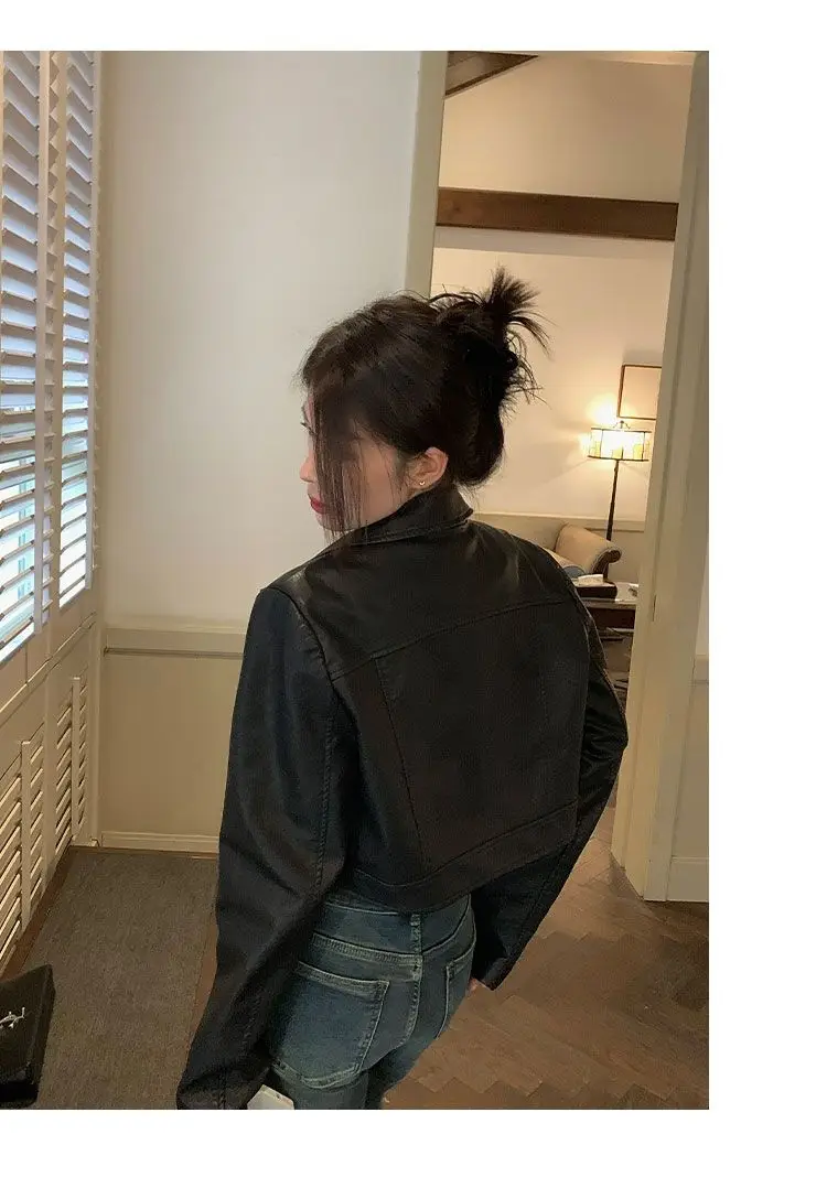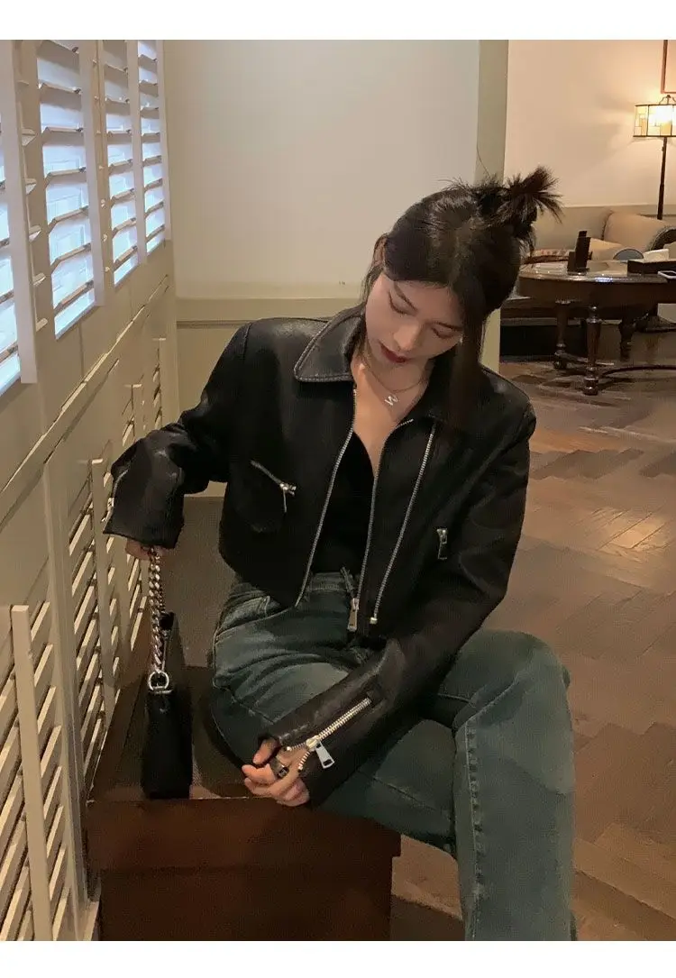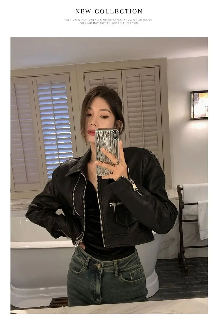 Yipinpay Black Cropped Leather Jacket Women Streetwear Zipper Moto Leather Jacket High Street Vintage Soft Faux Leather Coats 2023