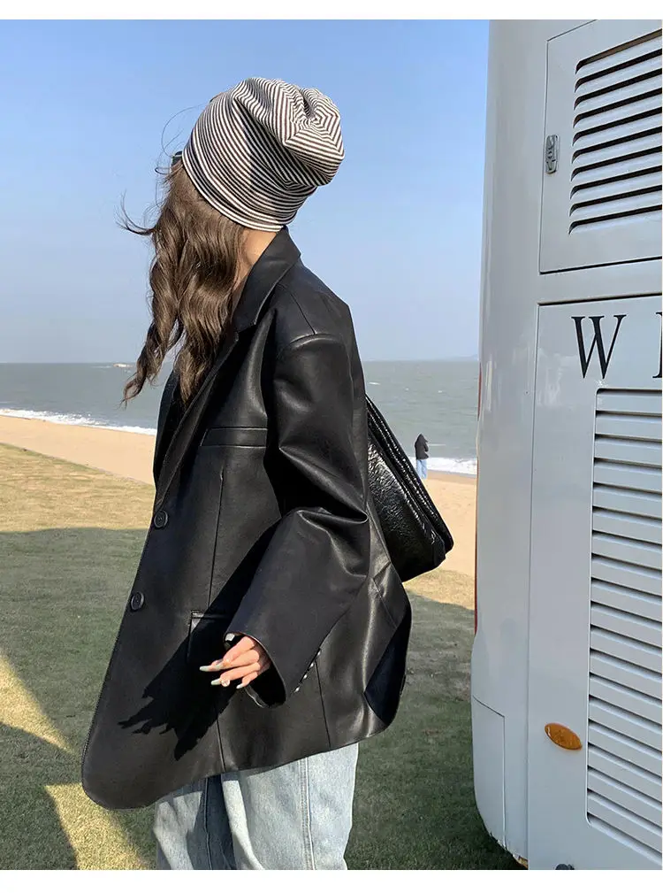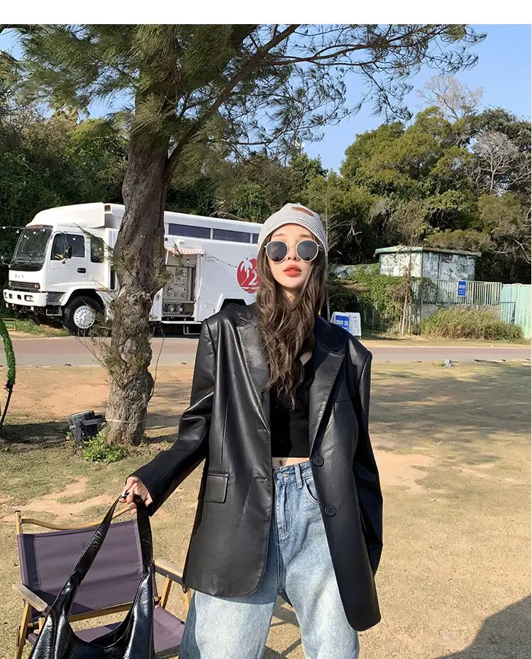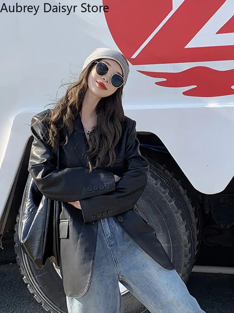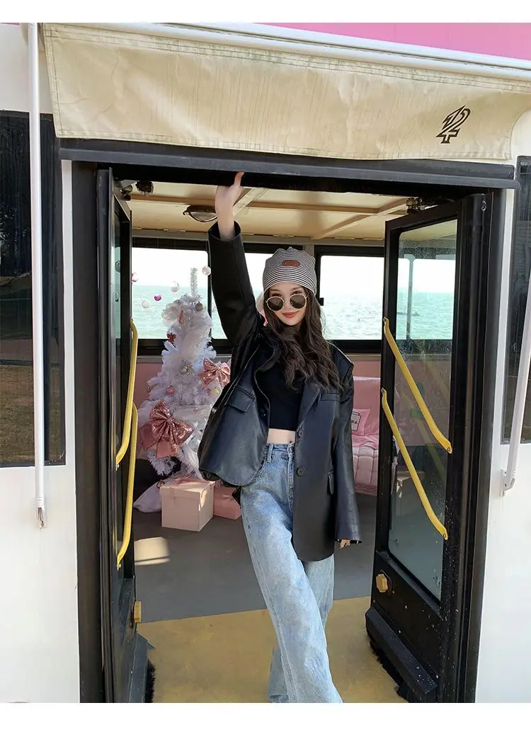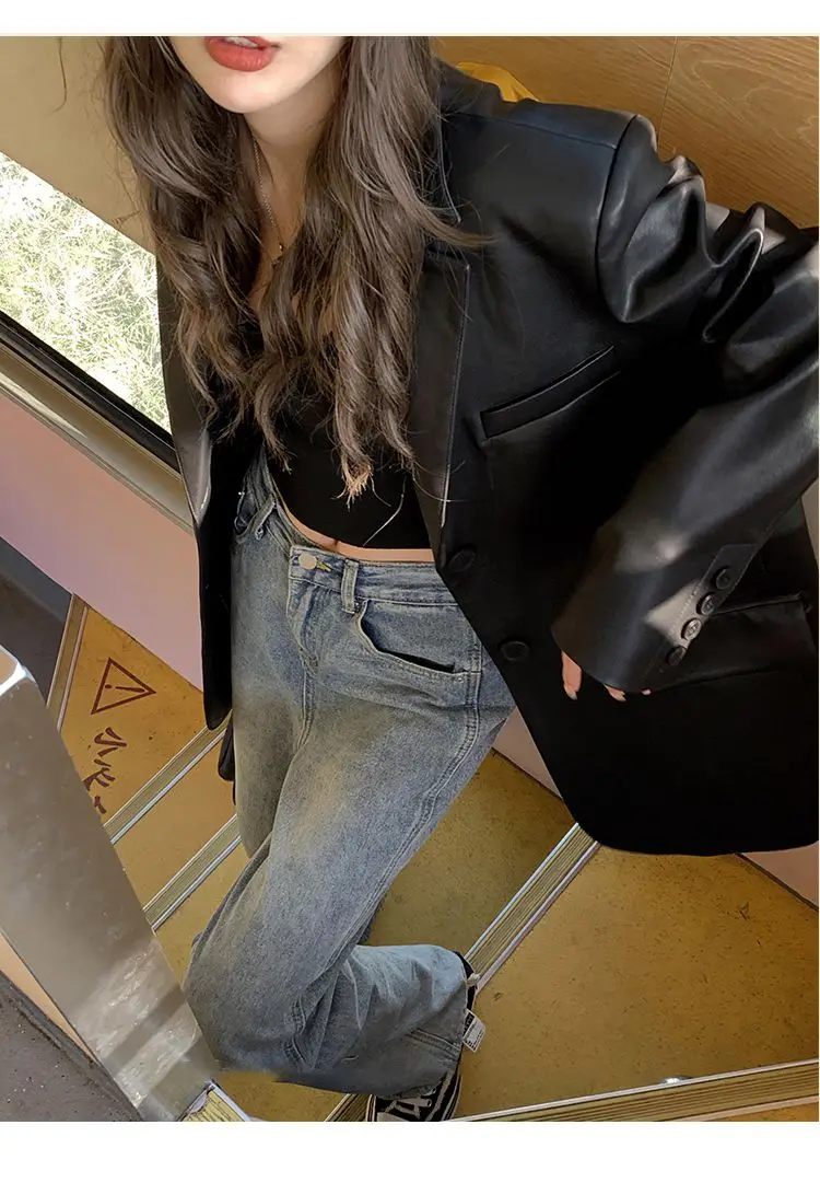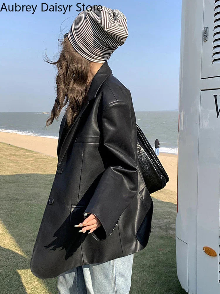 Yipinpay Black Leather Jacket Women Office Lady Pocket Faux Leather Blazers Vintage Casual Loose Single Breasted Winter Warm Coat