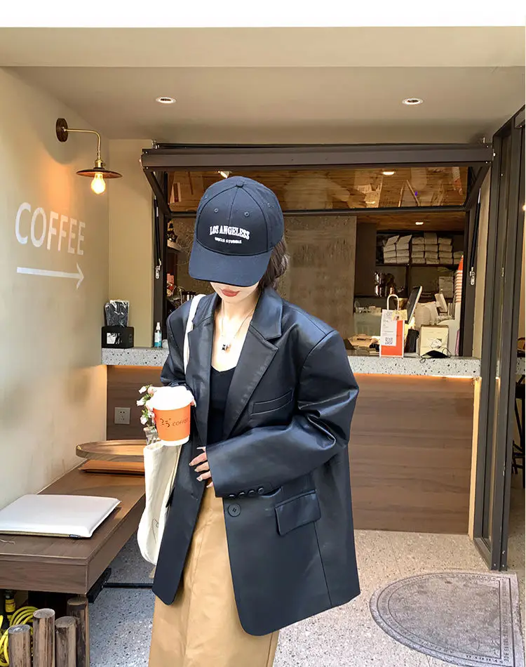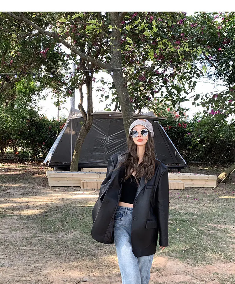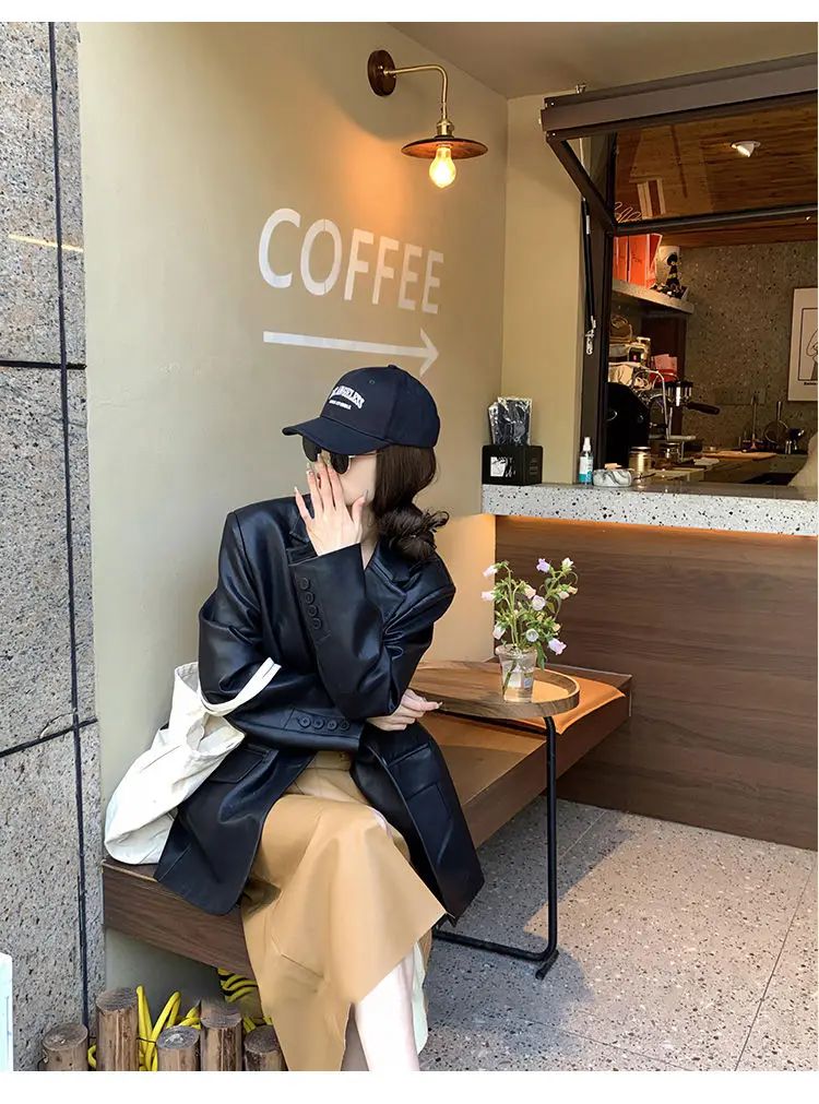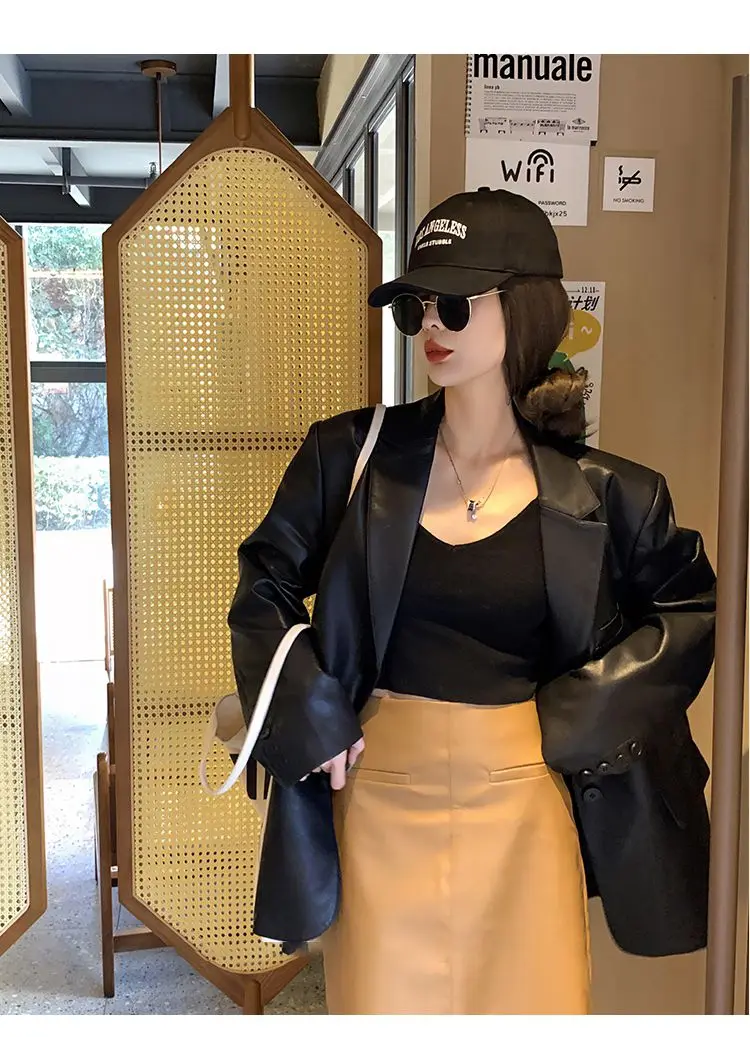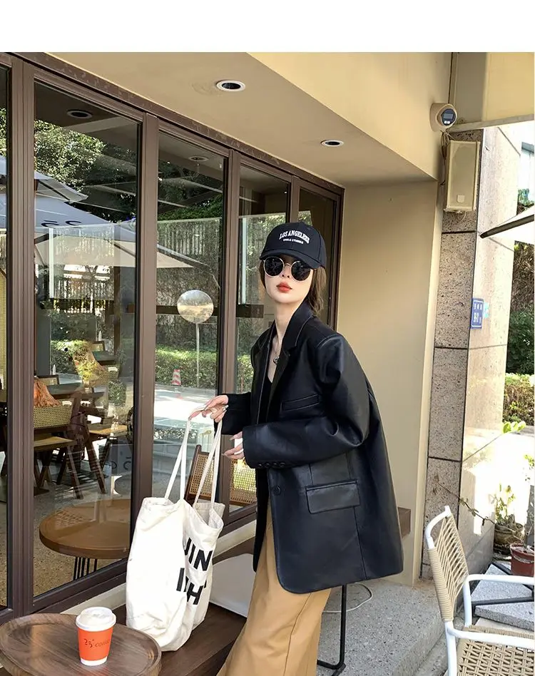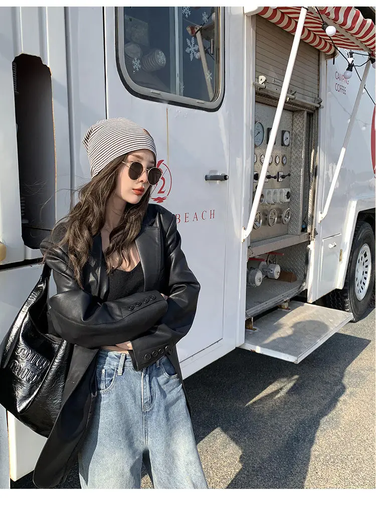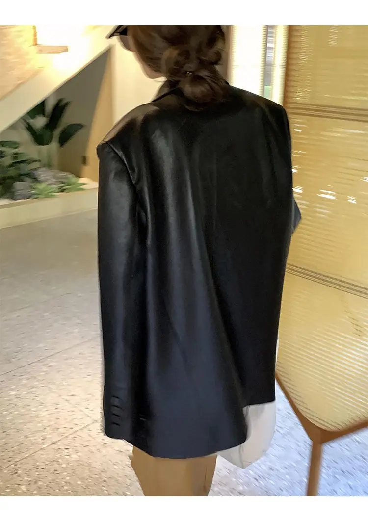 Yipinpay Black Leather Jacket Women Office Lady Pocket Faux Leather Blazers Vintage Casual Loose Single Breasted Winter Warm Coat
