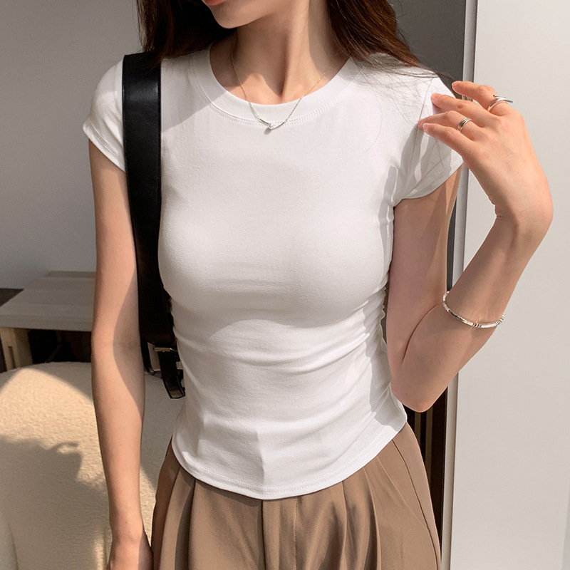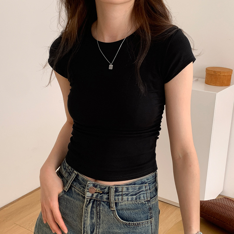 Yipinpay Black Round-Collar Short-Sleeved T-Shirt With A Black Round Neck Designed By European Designers Is A New Tight-Fitting, Skinny, Short-Style Blouse For Women In Spring And Summer.