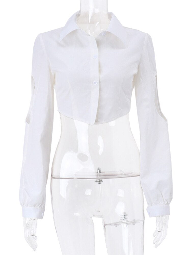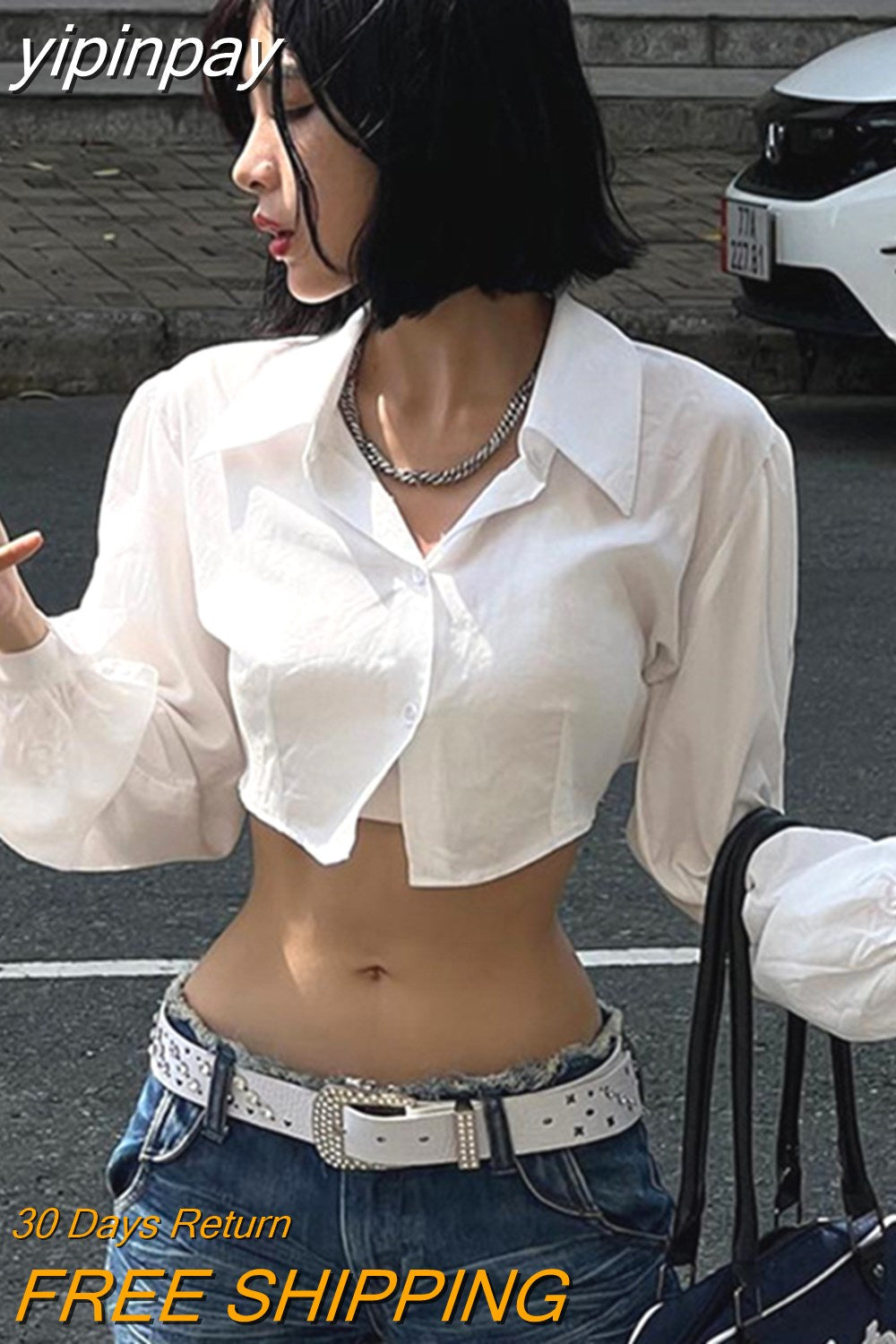 yipinpay Blouse Hollow Out Crop Top Y2K Clothes Long Sleeve Top Autumn Spring Solid Turn Down Collar Streetwear Button Up Shirt