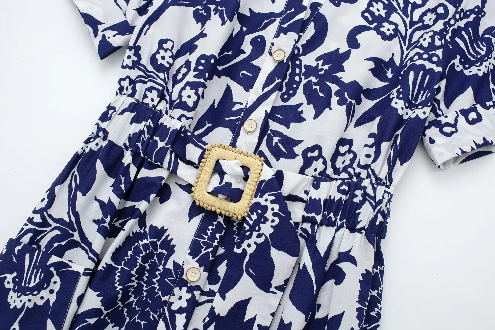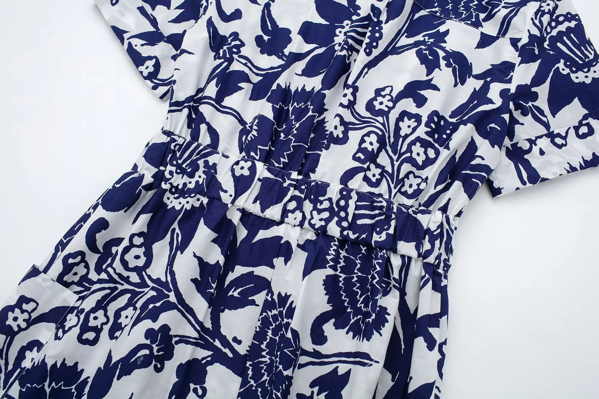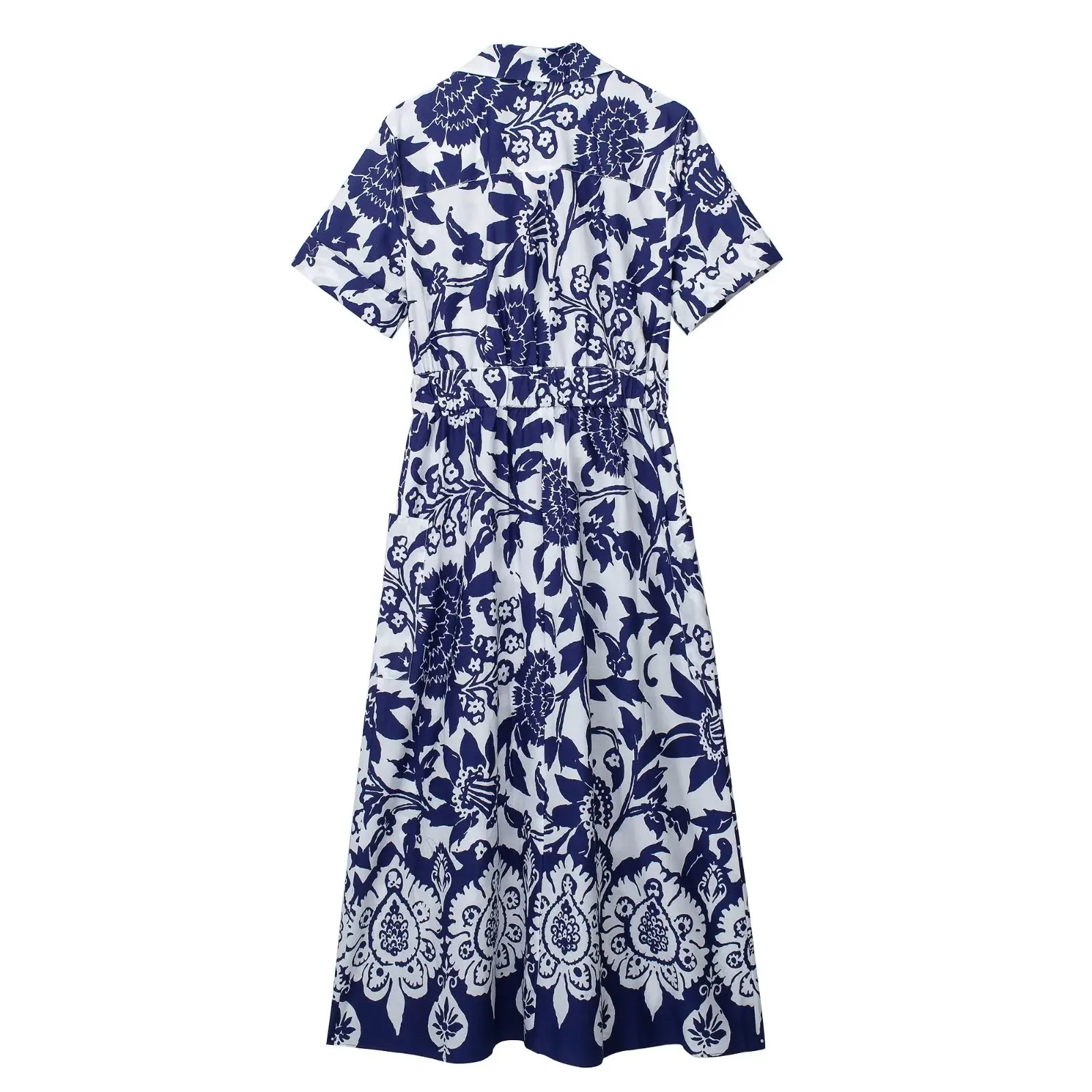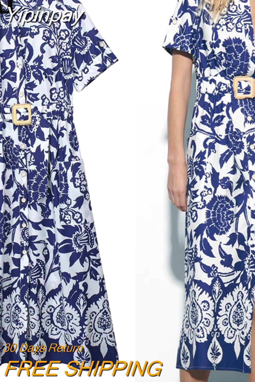 Yipinpay Blue Floral Shirt Dress Woman Vintage Print Long Dress Women Short Sleeve Elegant Chic Women Dresses Casual Summer Dresses