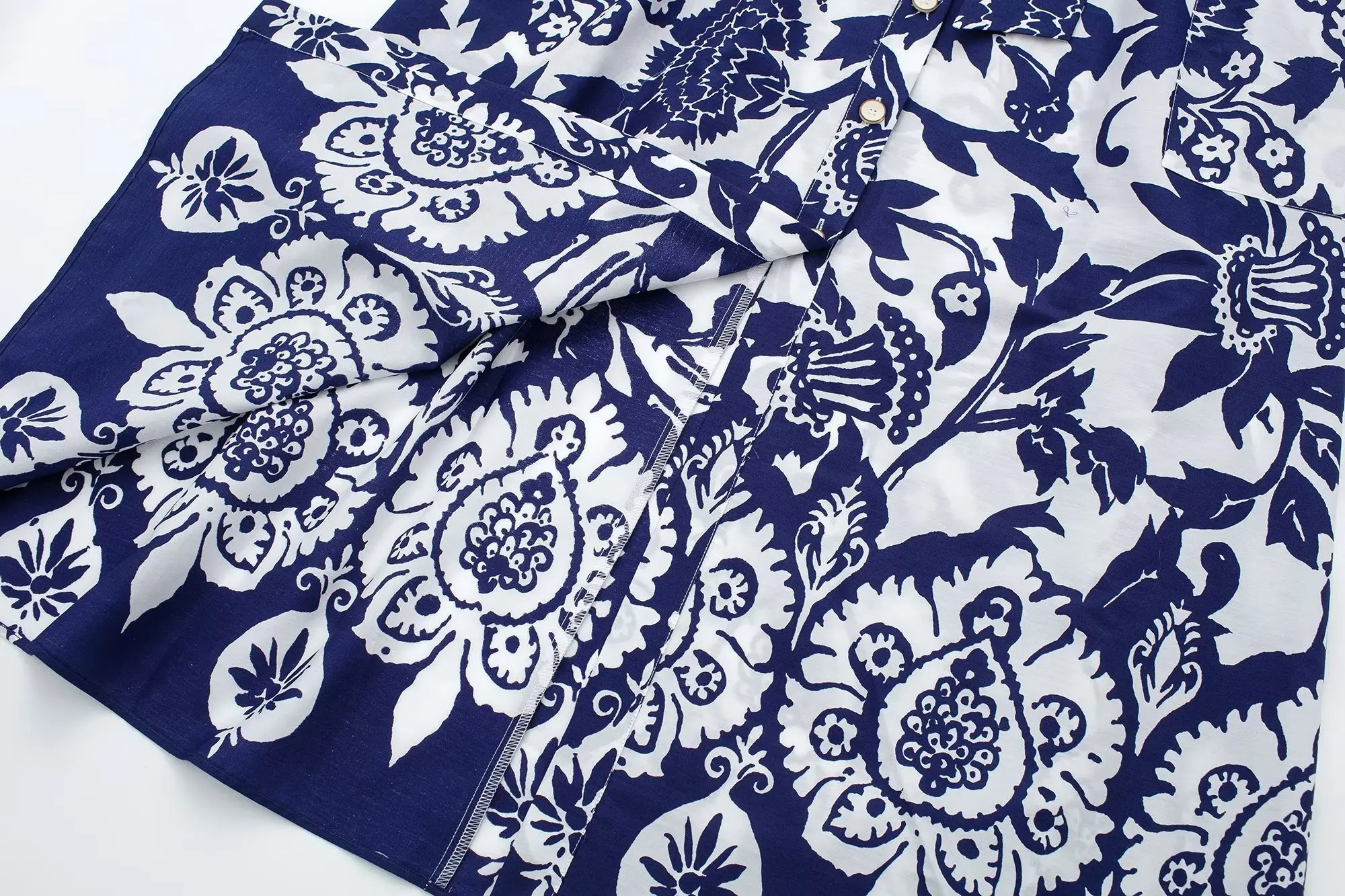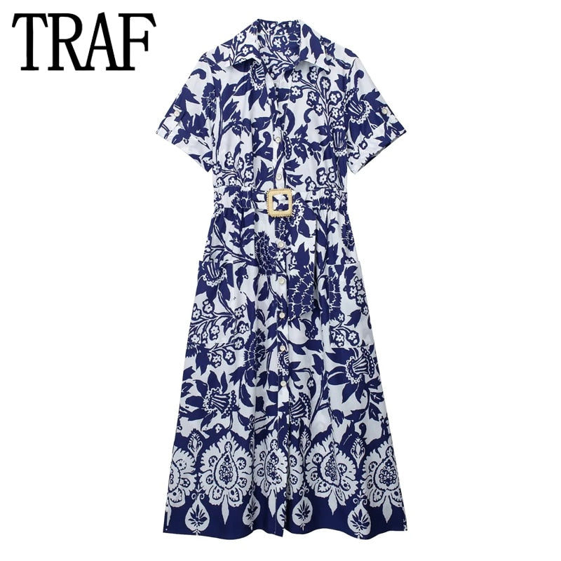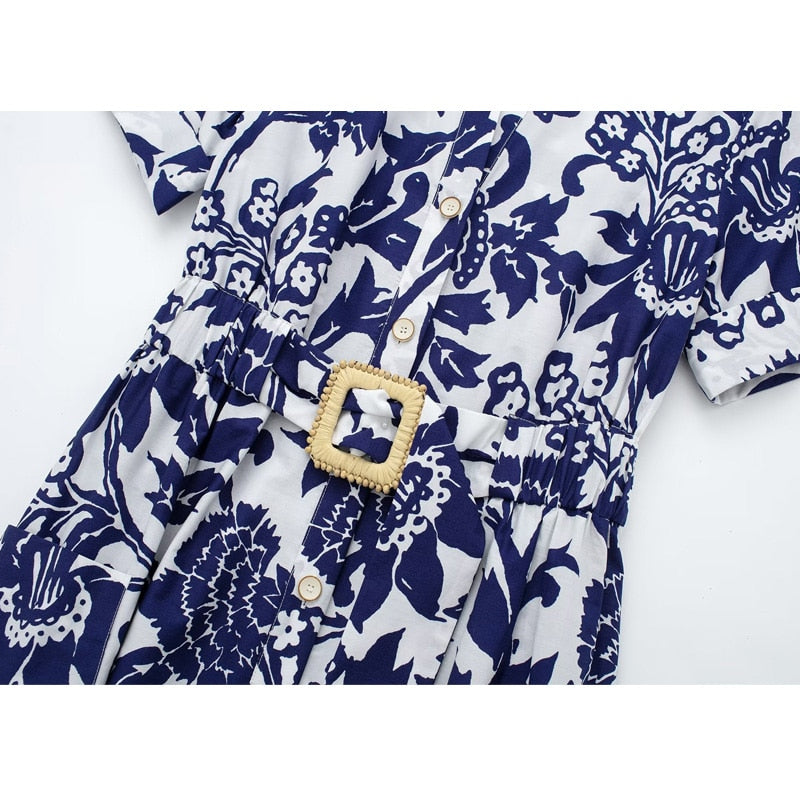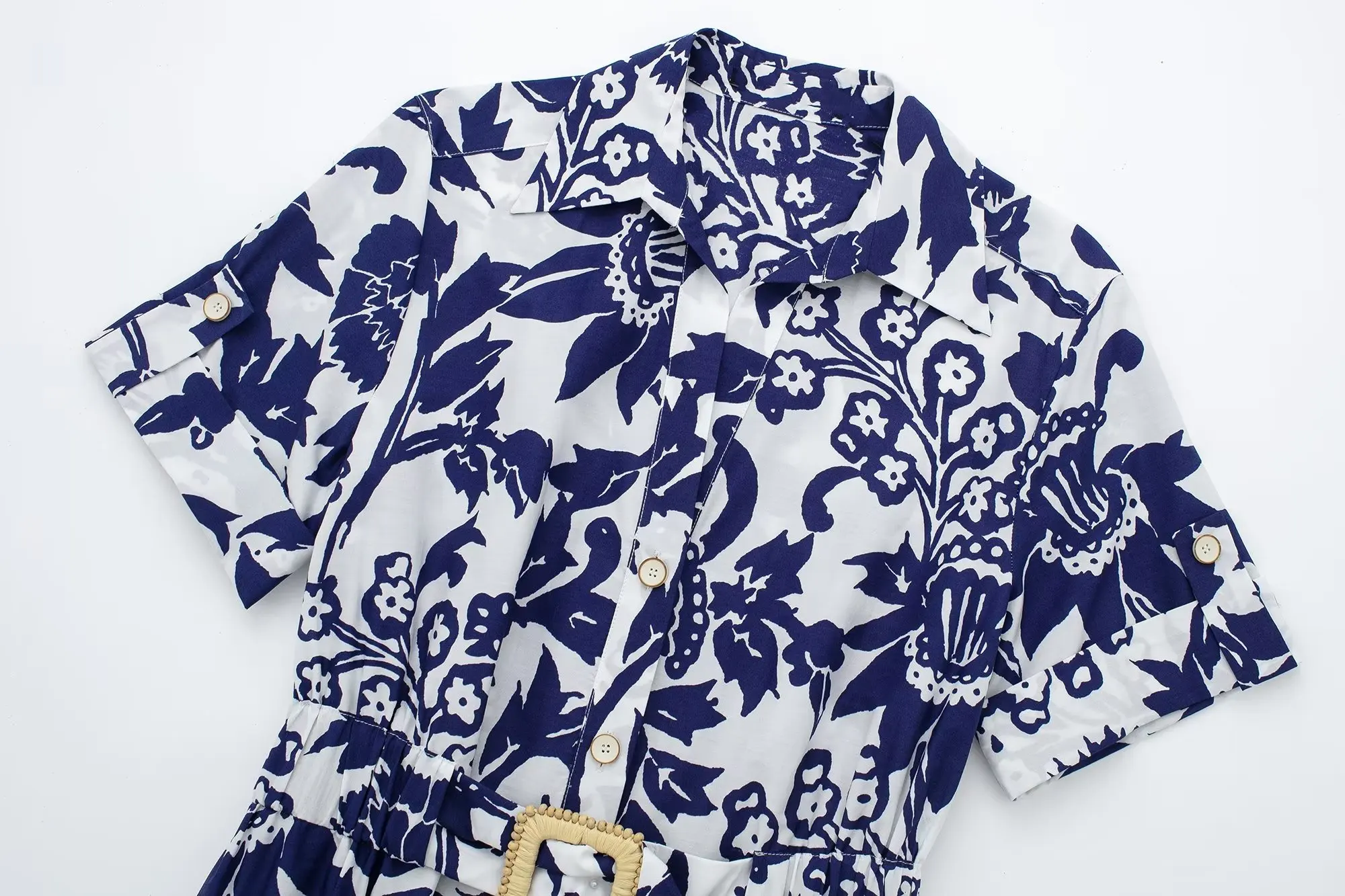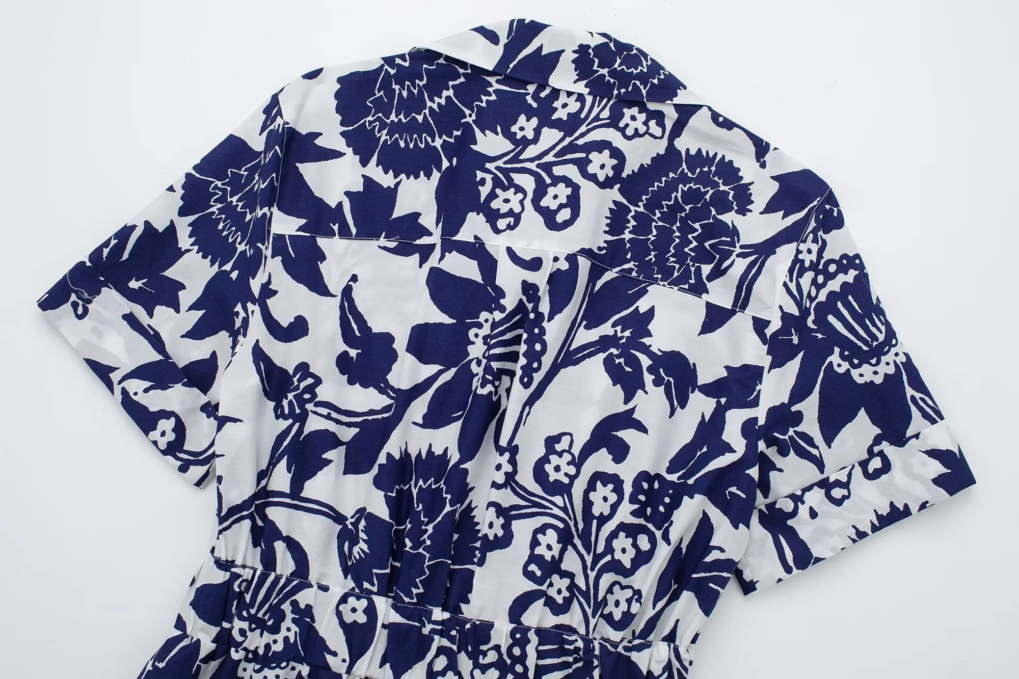 Yipinpay Blue Floral Shirt Dress Woman Vintage Print Long Dress Women Short Sleeve Elegant Chic Women Dresses Casual Summer Dresses