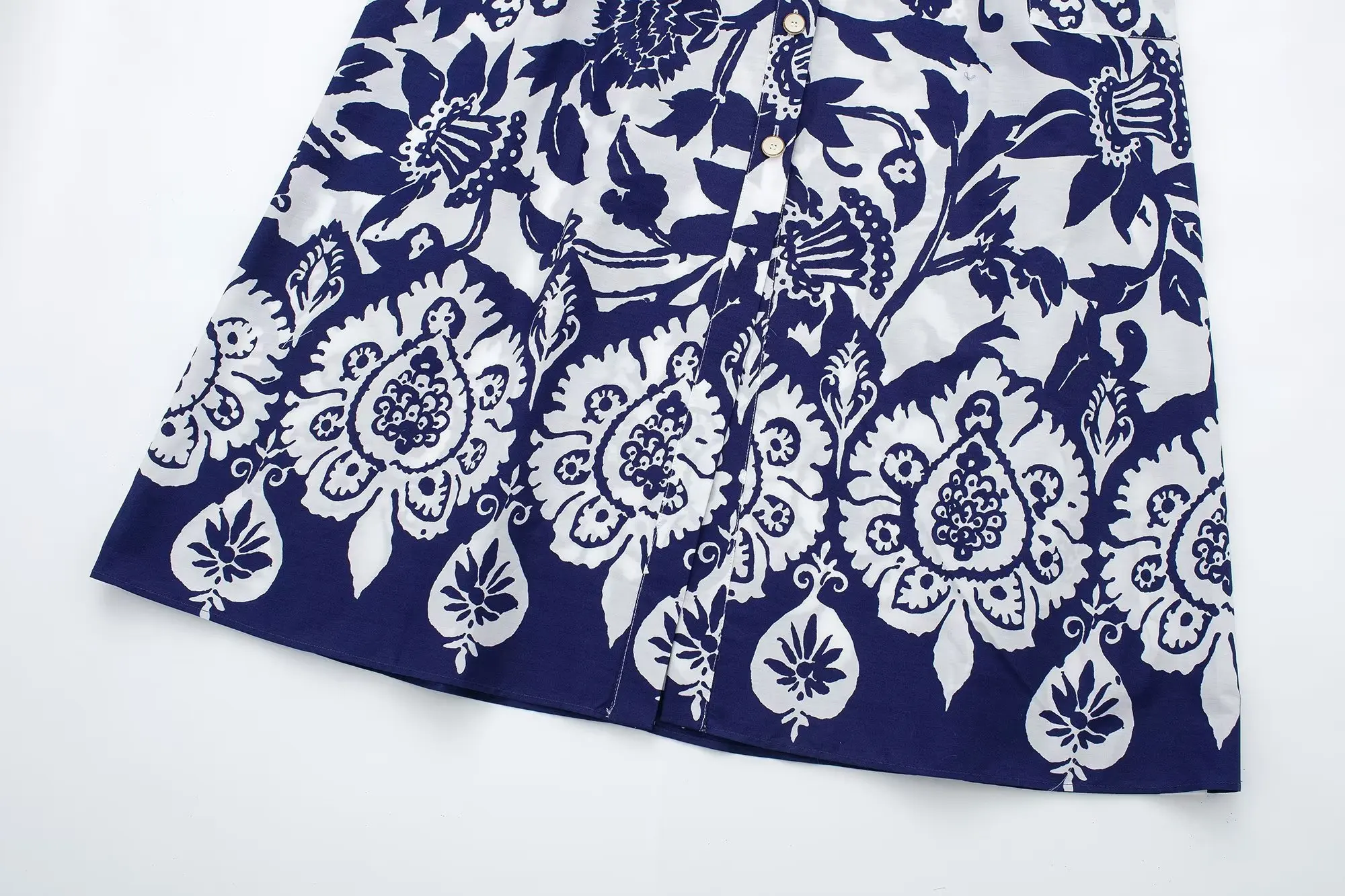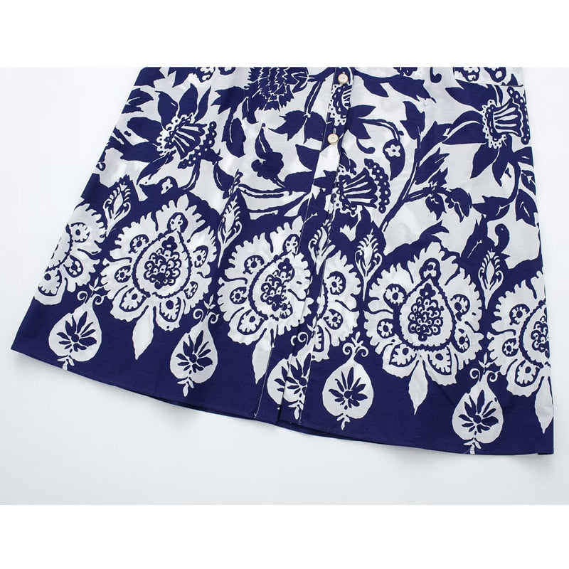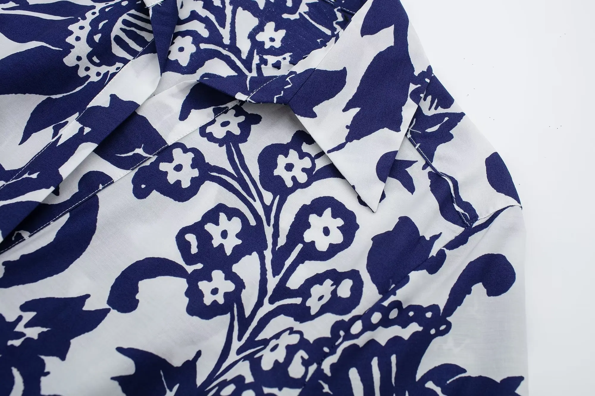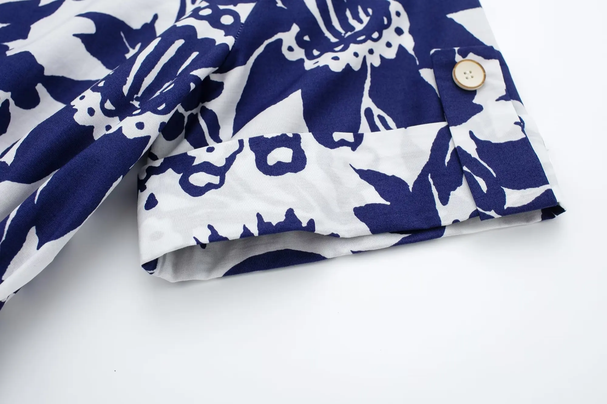 Yipinpay Blue Floral Shirt Dress Woman Vintage Print Long Dress Women Short Sleeve Elegant Chic Women Dresses Casual Summer Dresses