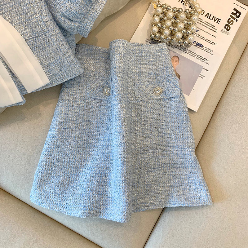 Yipinpay Blue Tweed Cardigan Elegant Crop Top Summer Shirt Beach Outfits for Women Blazers Sets Mini Plaid Skirts Faldas Korean