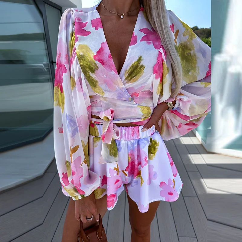 Model Number: Sexy Boho Floral Print Lantern Sleeve Crop Top Suit