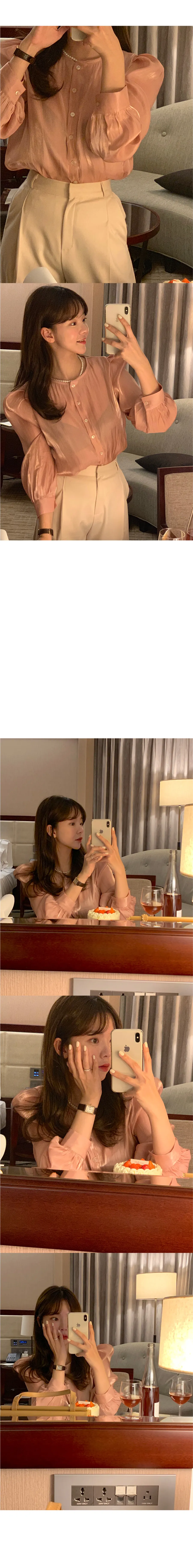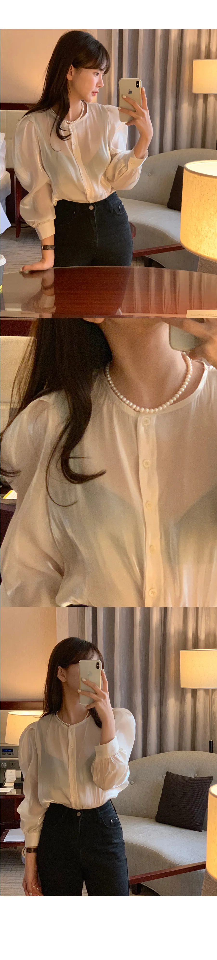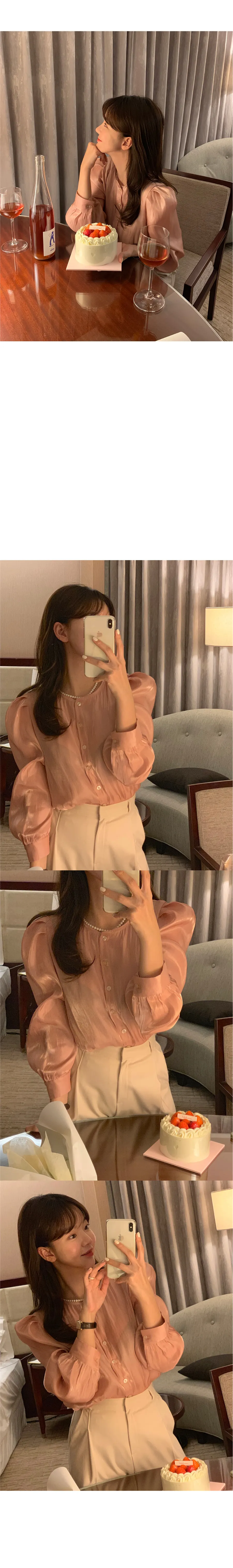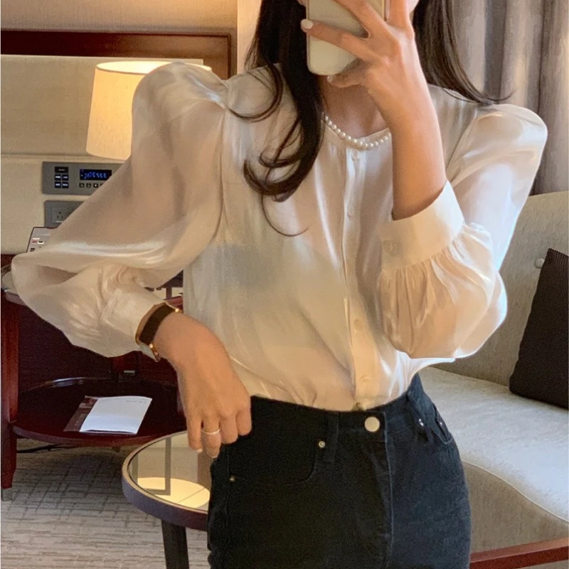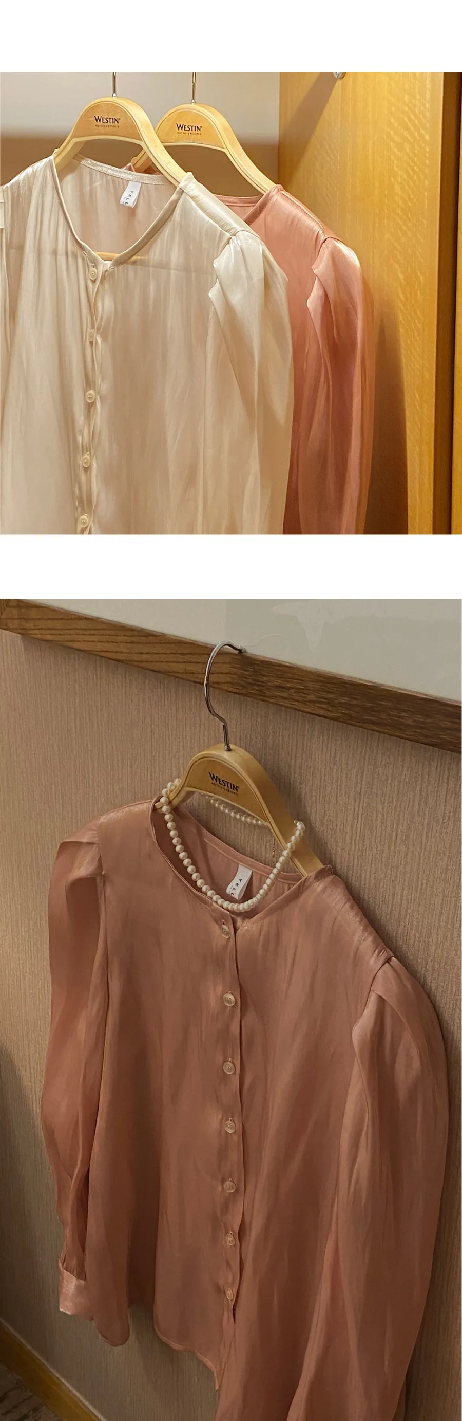 Yipinpay Button Puff Sleeve Shirt O-Neck Pink Pearly Silky 2023 Spring Shirt Summer Korean Women's Top