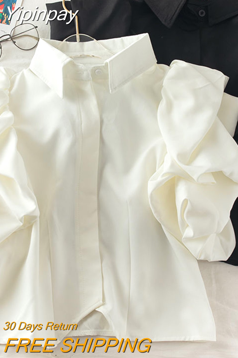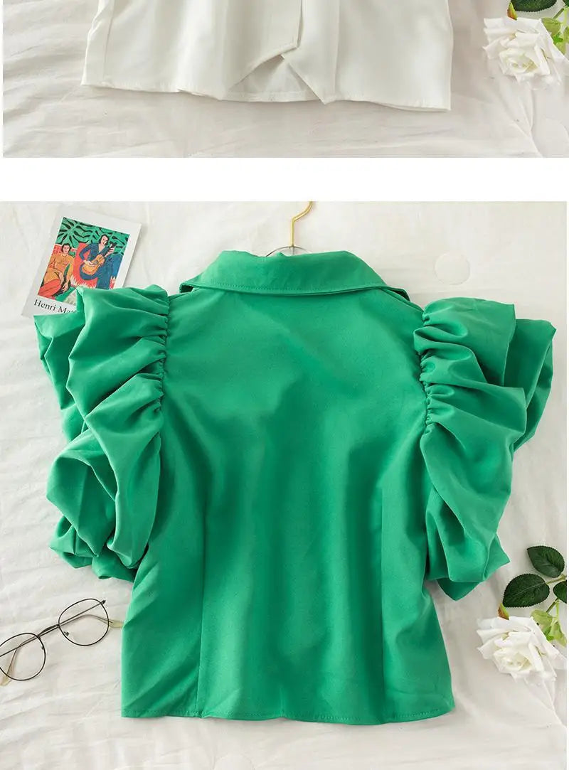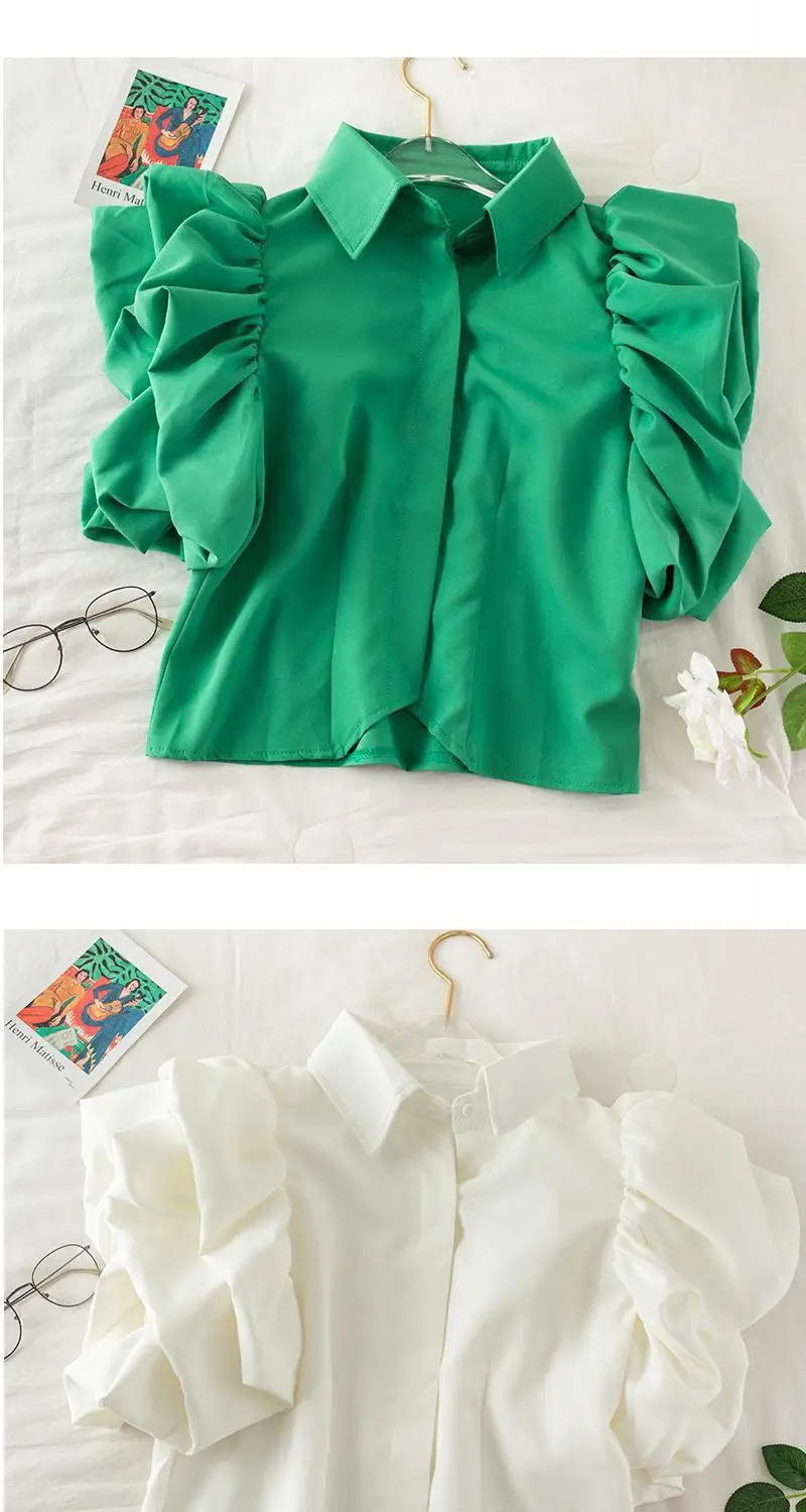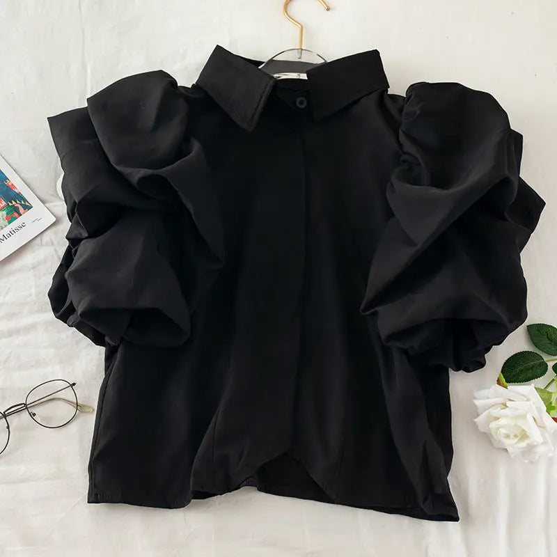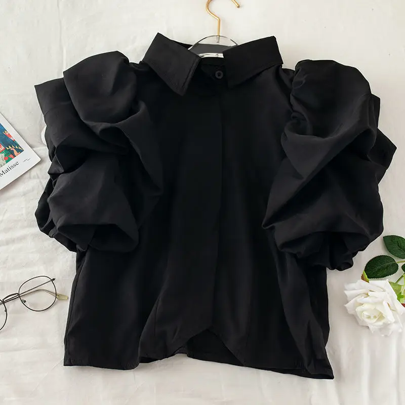 Yipinpay Camisas Tops Mujer 2023 Shirts for Women Lantern Short Sleeve Blouse Black White Roupas Femininas Blusas Pleated Ruffled