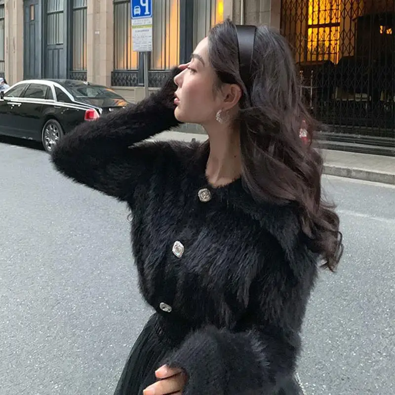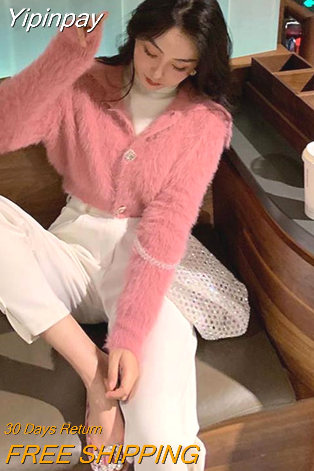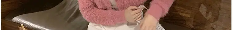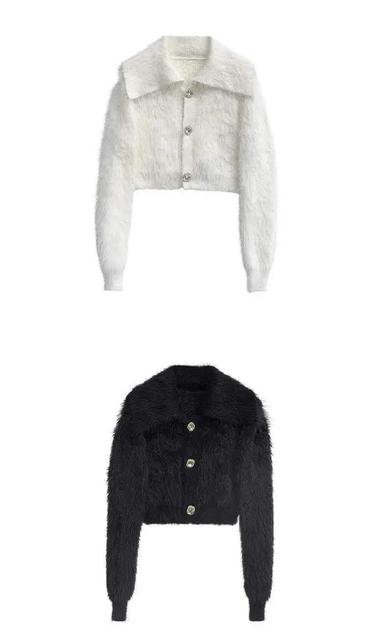 Yipinpay Cashmere Sweaters Turn Down Collar Crop Tops Fleece Short White Cardigan Mohair Coat Knit Pull Korean Fashion Sueters