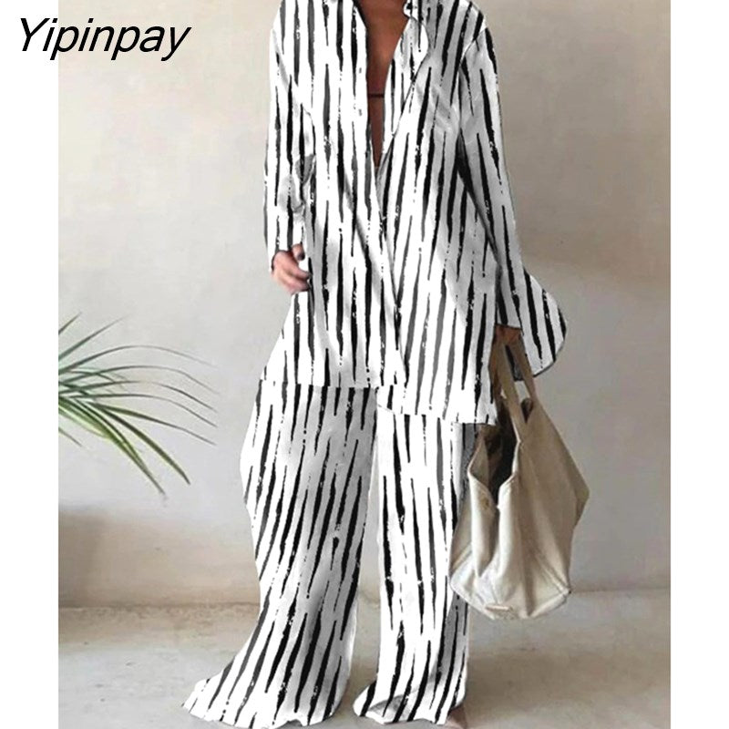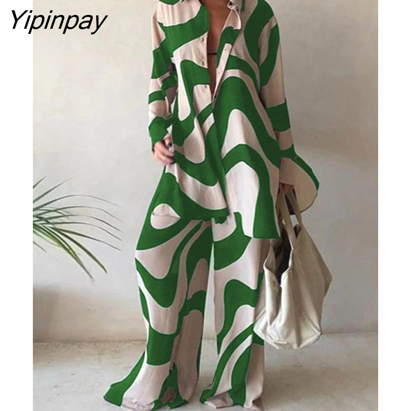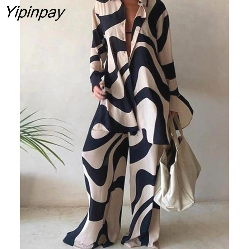 Yipinpay Casual Printed Long Sleeve Shirt Two Pieces Set 2023 Summer Loose High Waist Straight Trouser Suits Female Fashion Outfits