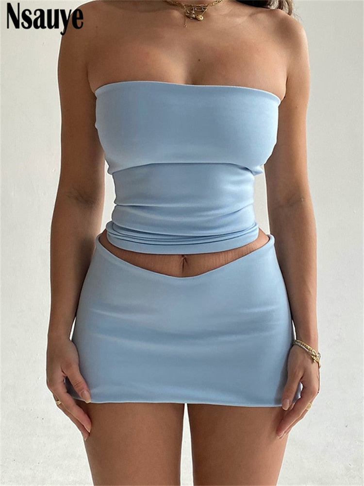 yipinpay Casual Summer 2023 Khaki Basic Club Skirt Women Set Off Shoulder Crop T Shirt Tops And Short Wrap Sexy Skirt Two Piec Set