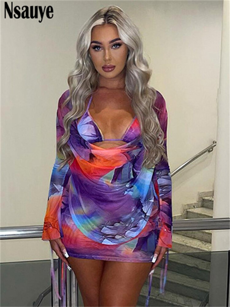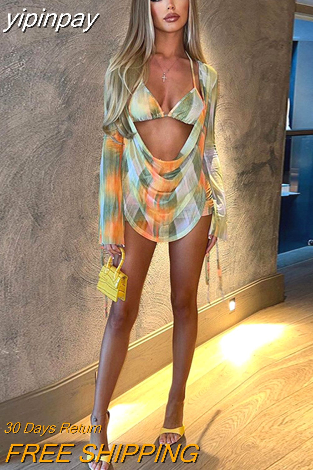 yipinpay Casual Summer Beach Holiday Tie Dye Women Skirt Suit Long Sleeve Crop Tops Mini Ruched Wrap Skirt Sexy Club Two Piece Set