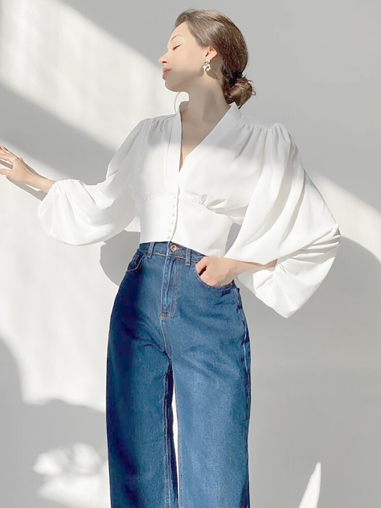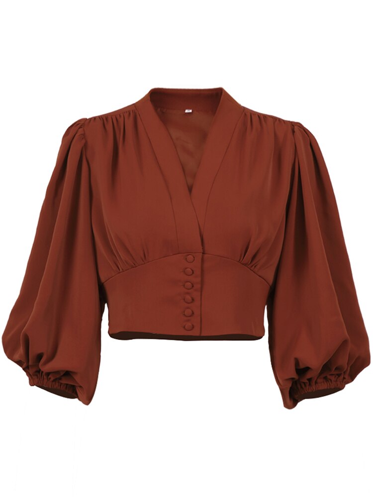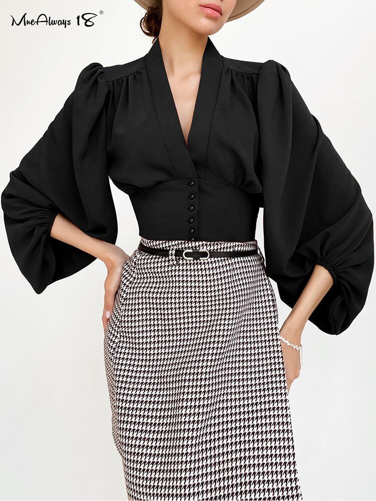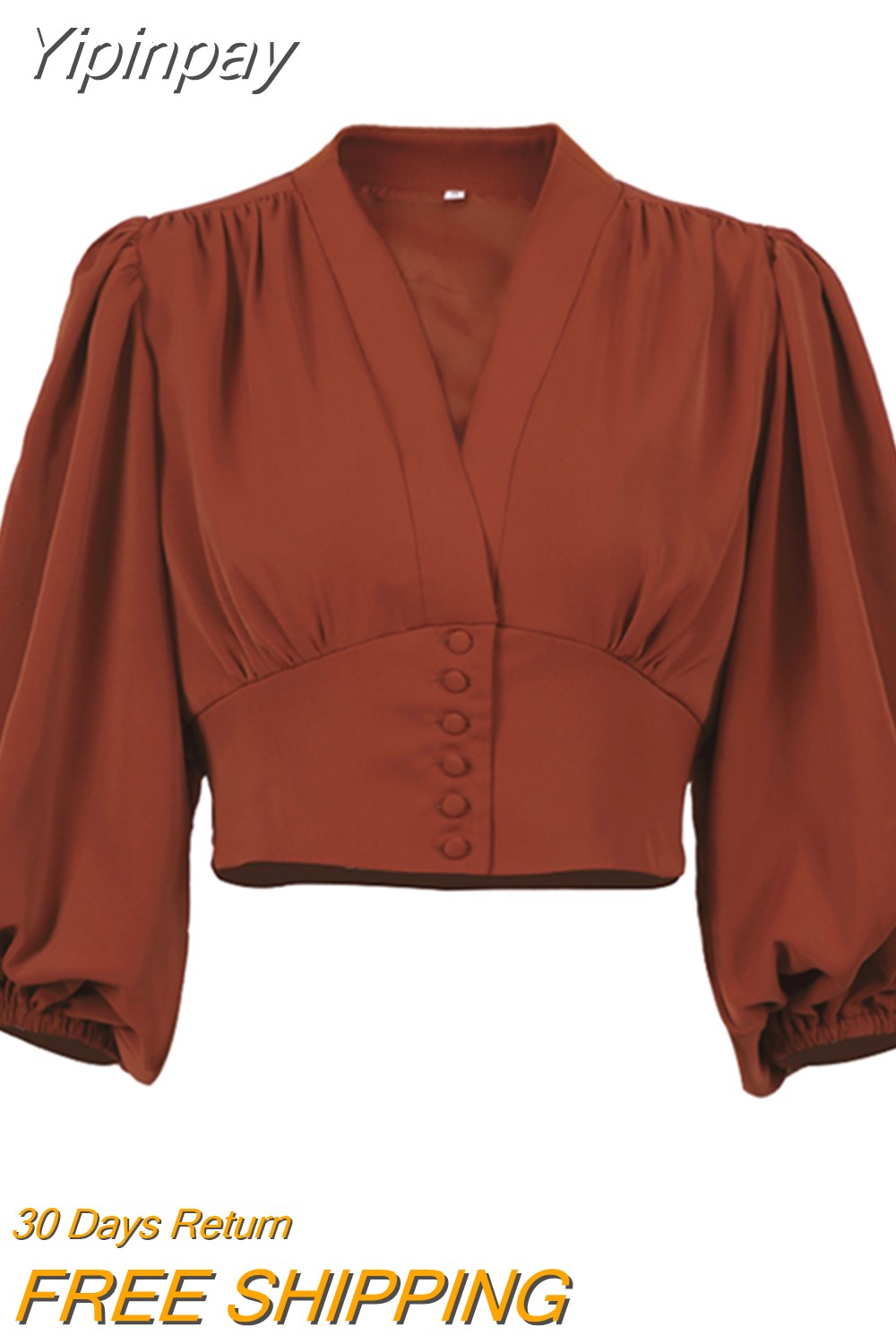 Yipinpay Chic Lantern Sleeve Women Crop Blouse Vintage Black Office Top Female Short Bodycon Shirt V-Neck Breasted Draped Top
