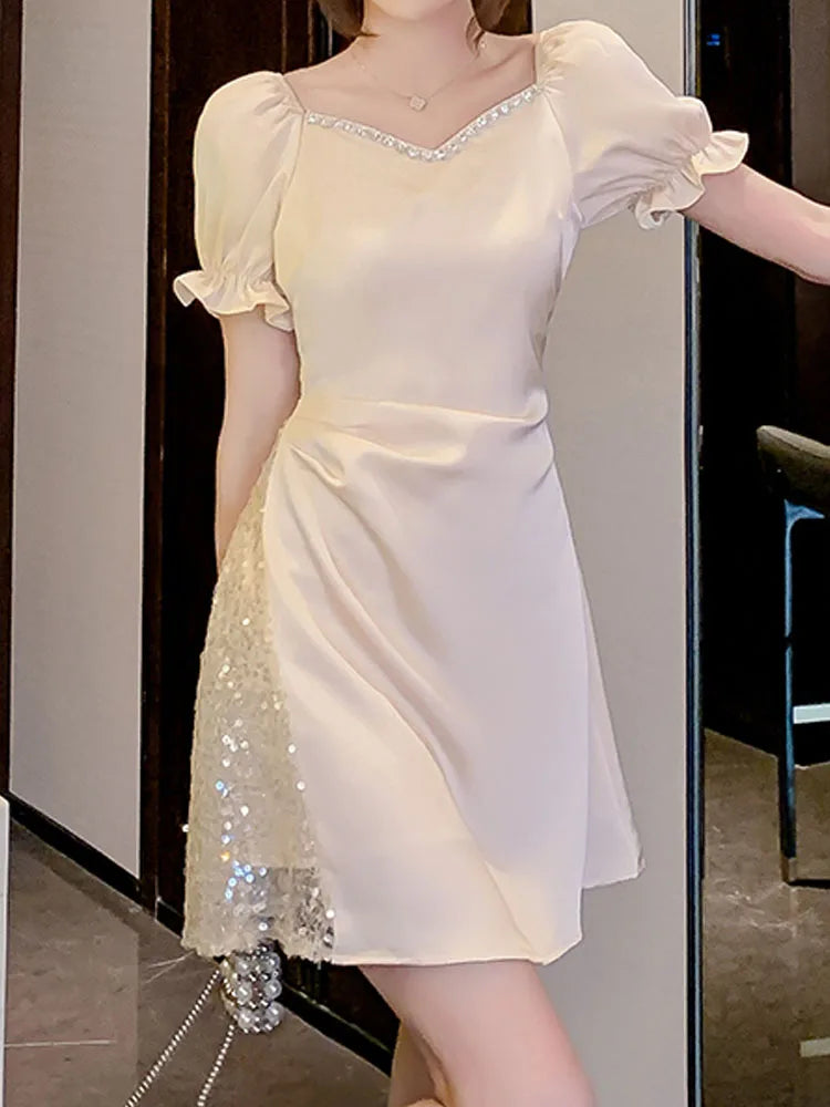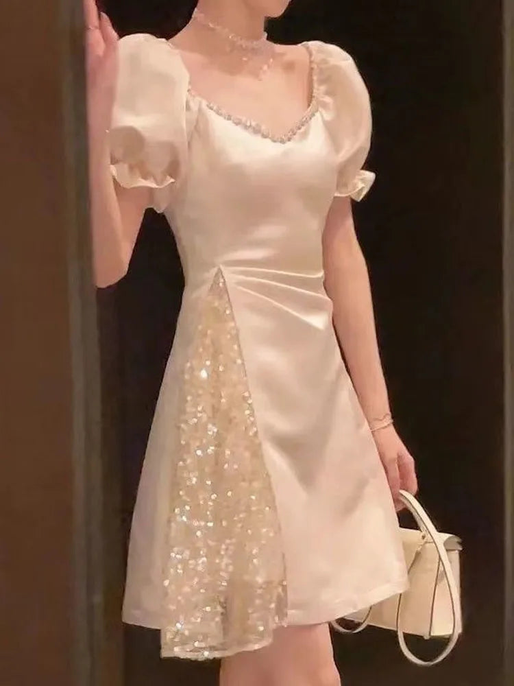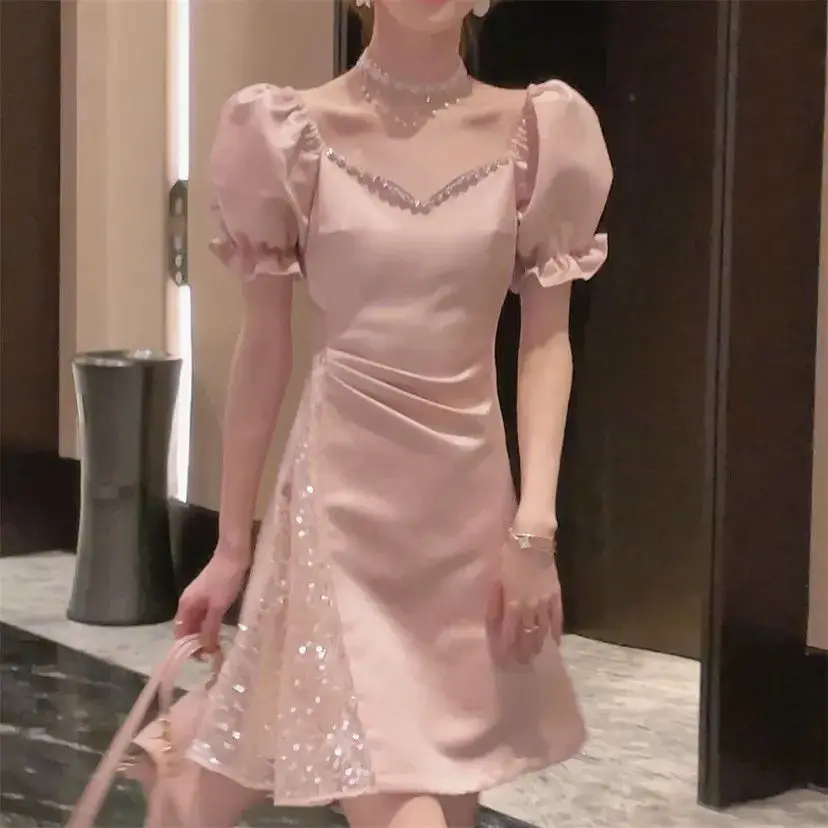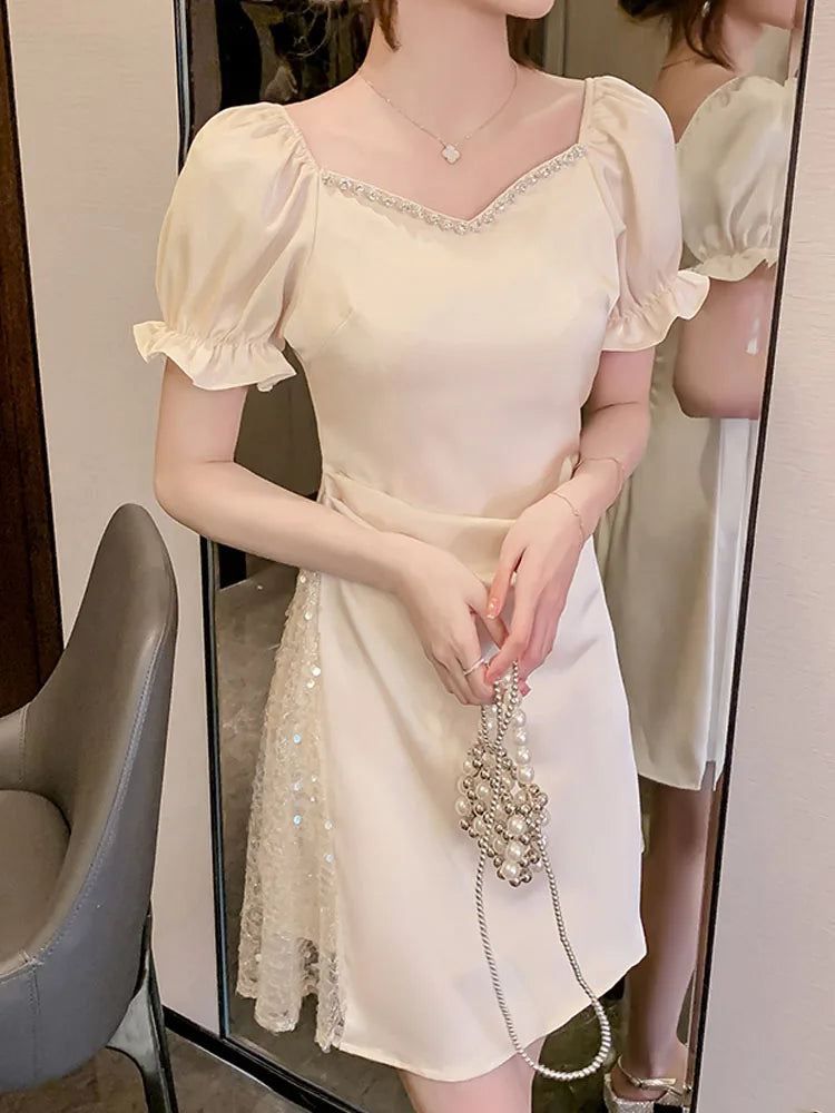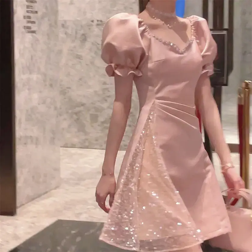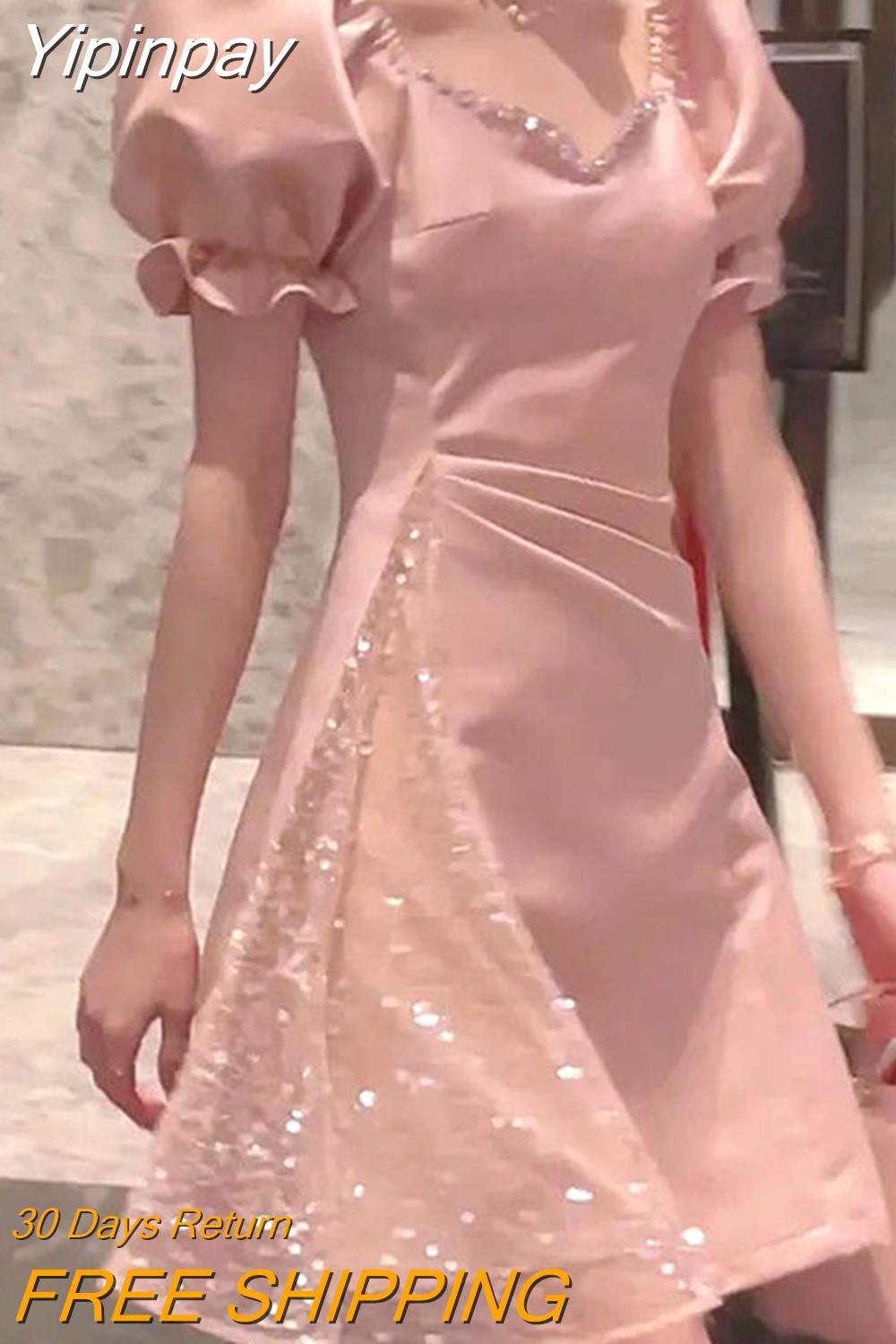 Yipinpay Chic Mini Sequin Dress Women Vintage V-neck Luxury Evening Dress Female Elegant Lace Patchwork Prom Party Dress 2023