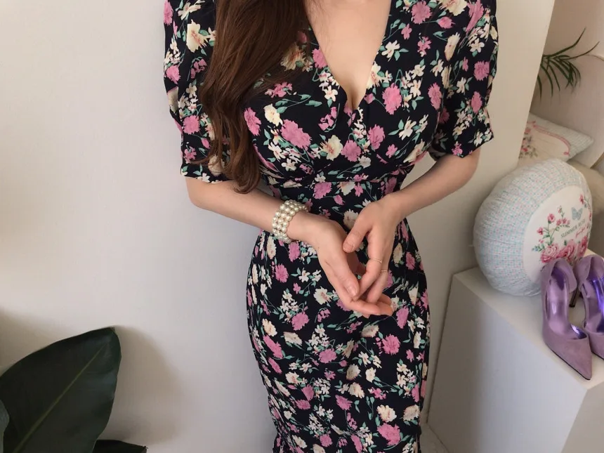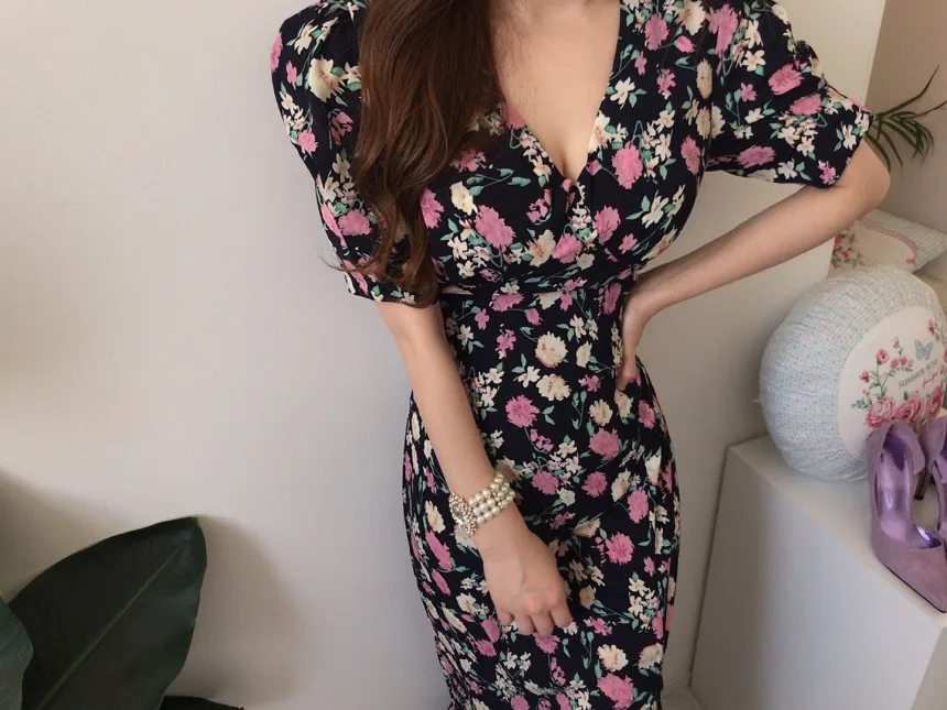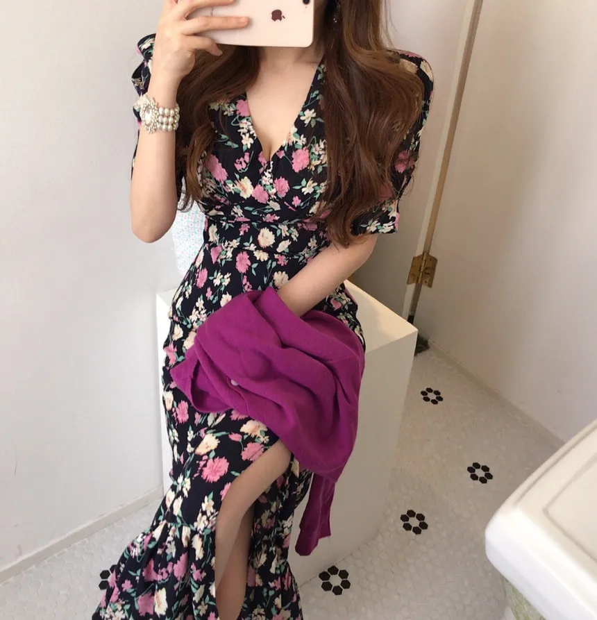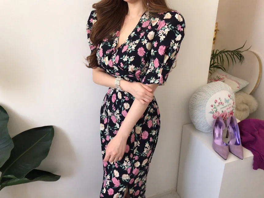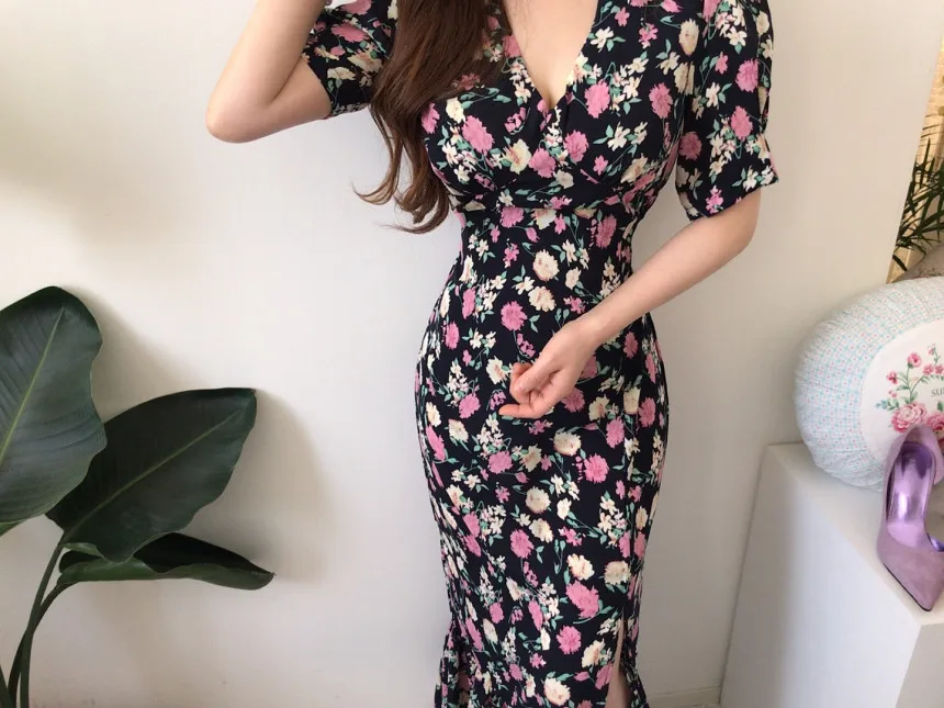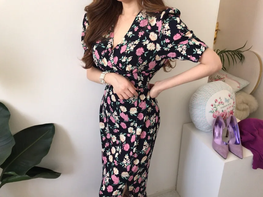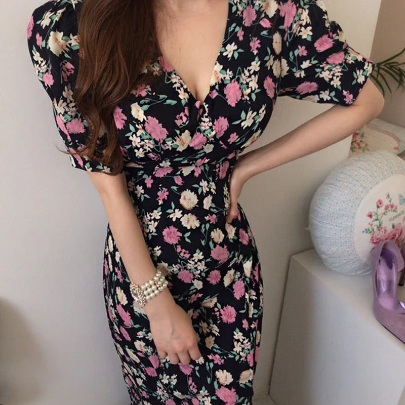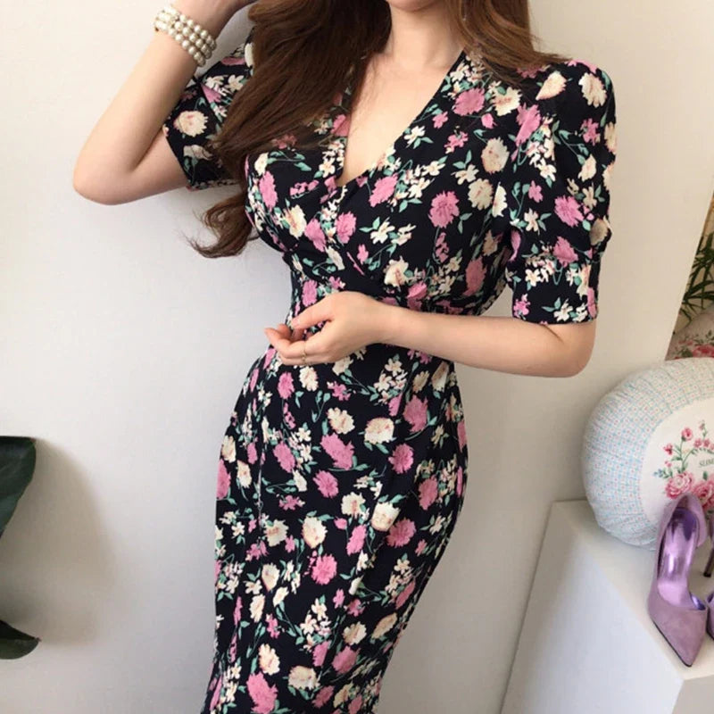 Yipinpay Chic Retro Elegant Wrap Hip V Floral Print Short Sleeve Chiffon Dress Women Summer 2023 Robe Femme Vestidos Mujer