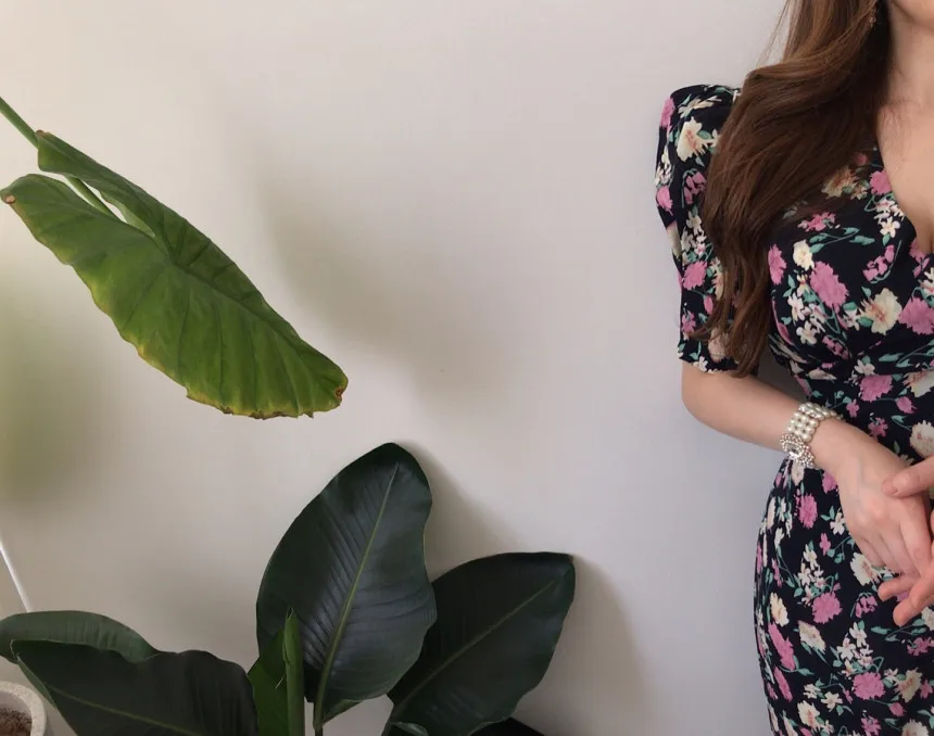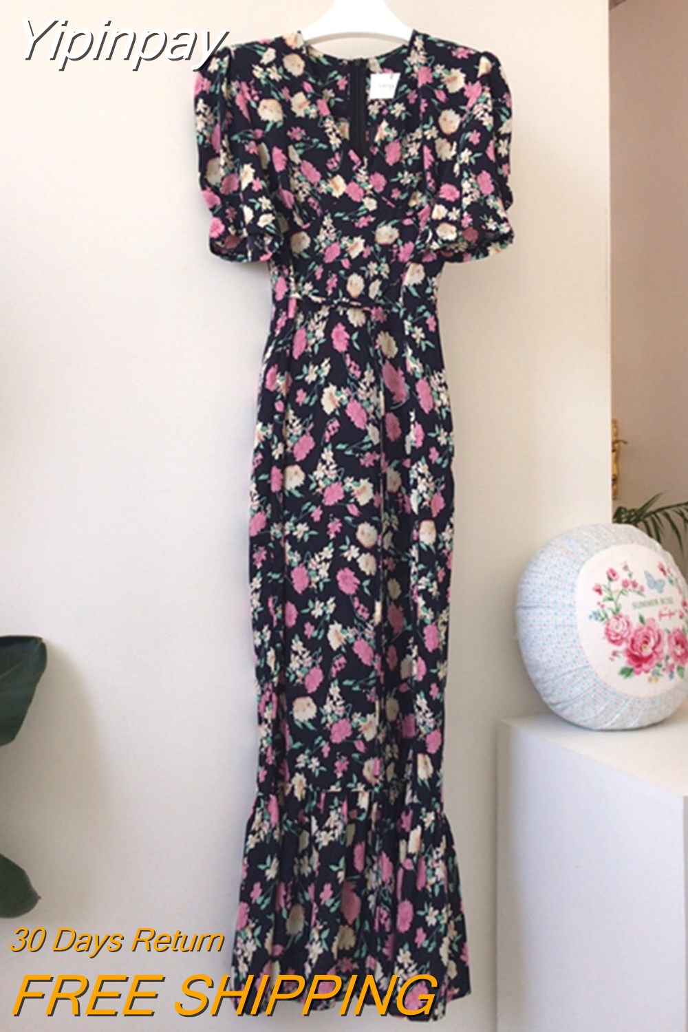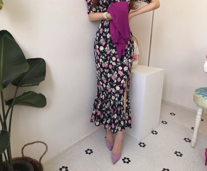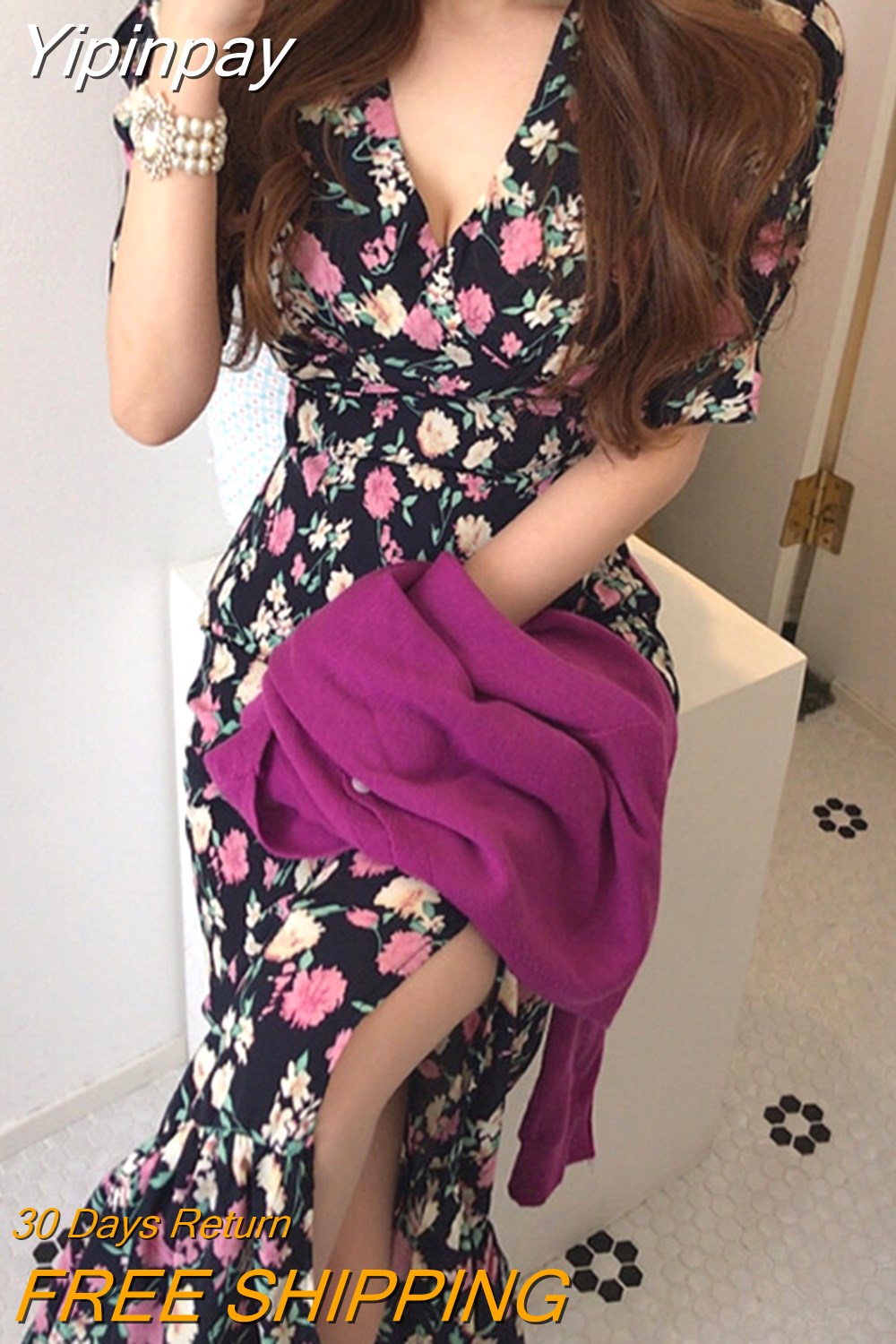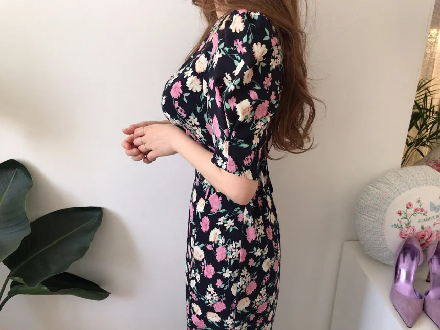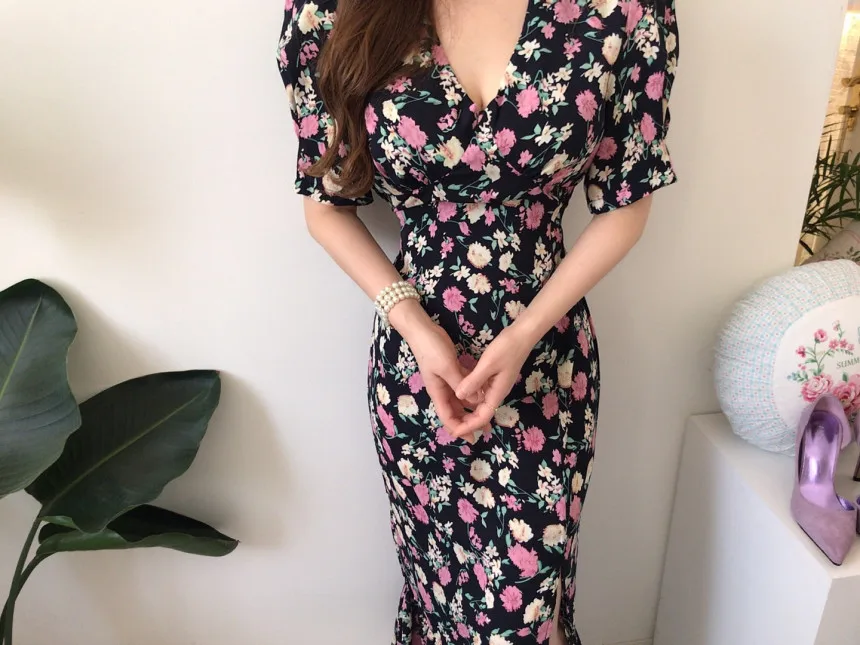 Yipinpay Chic Retro Elegant Wrap Hip V Floral Print Short Sleeve Chiffon Dress Women Summer 2023 Robe Femme Vestidos Mujer
