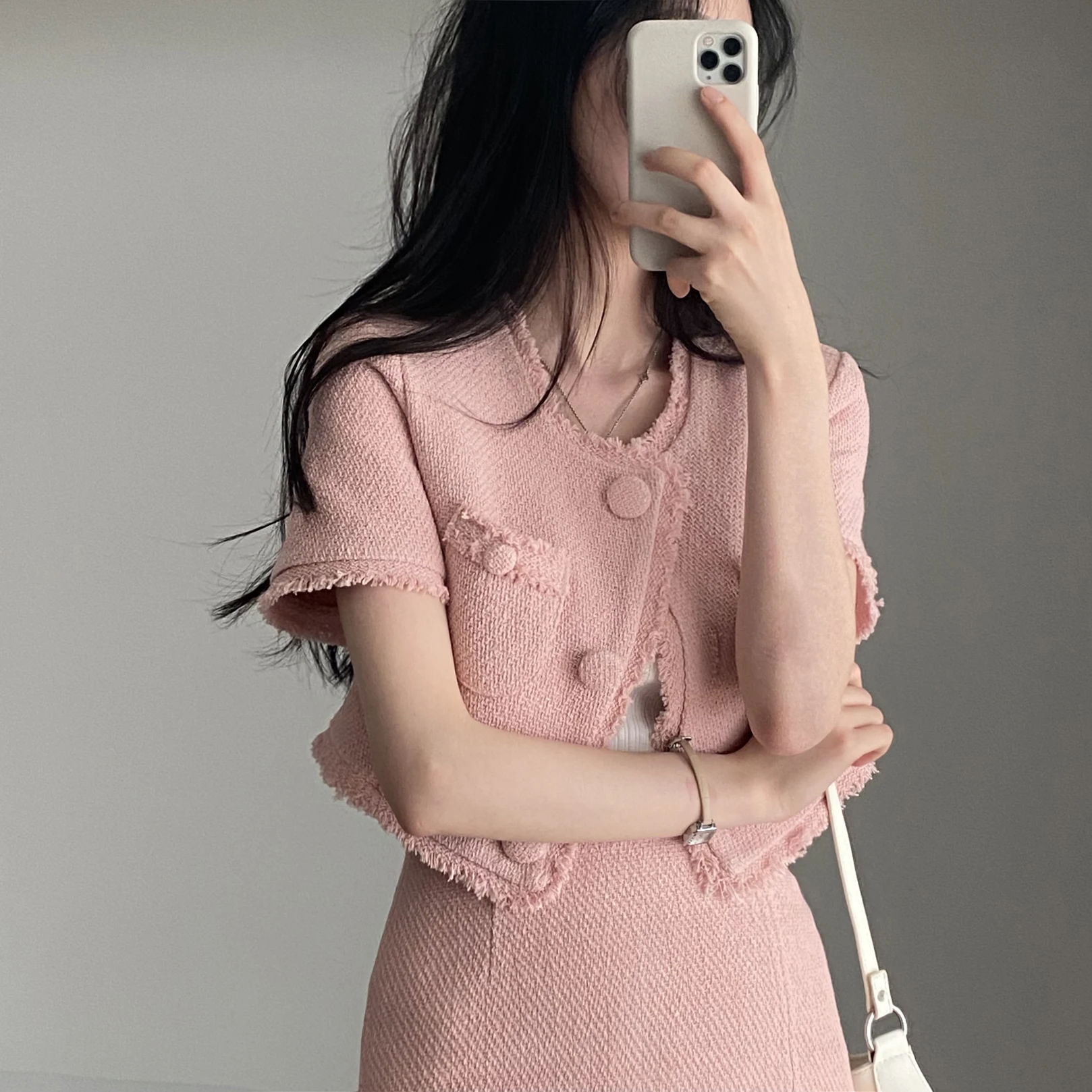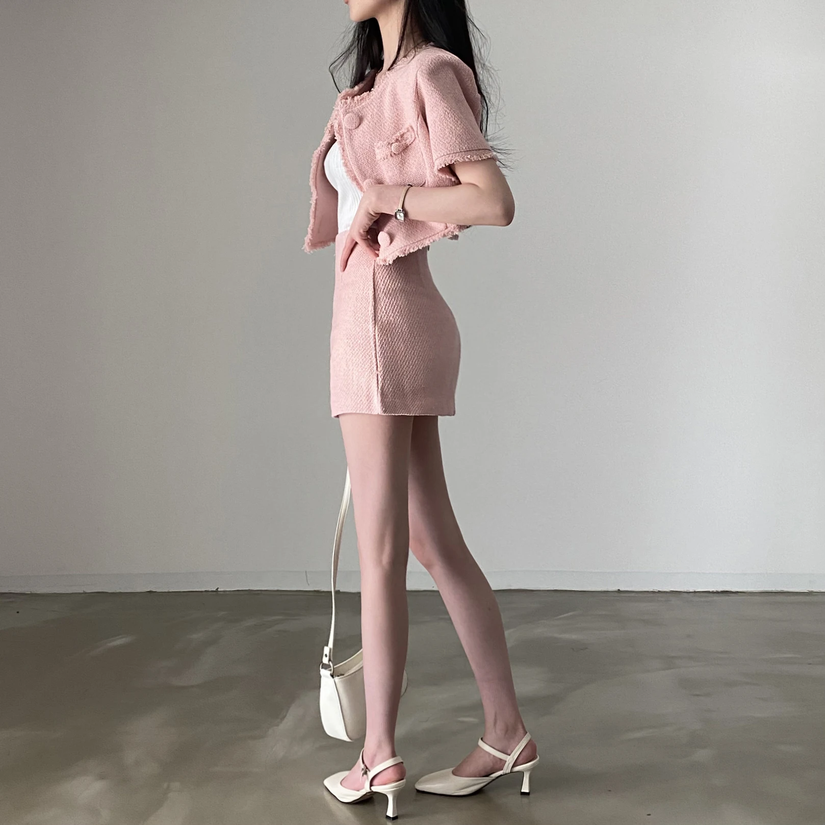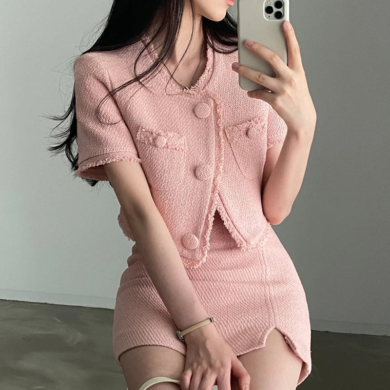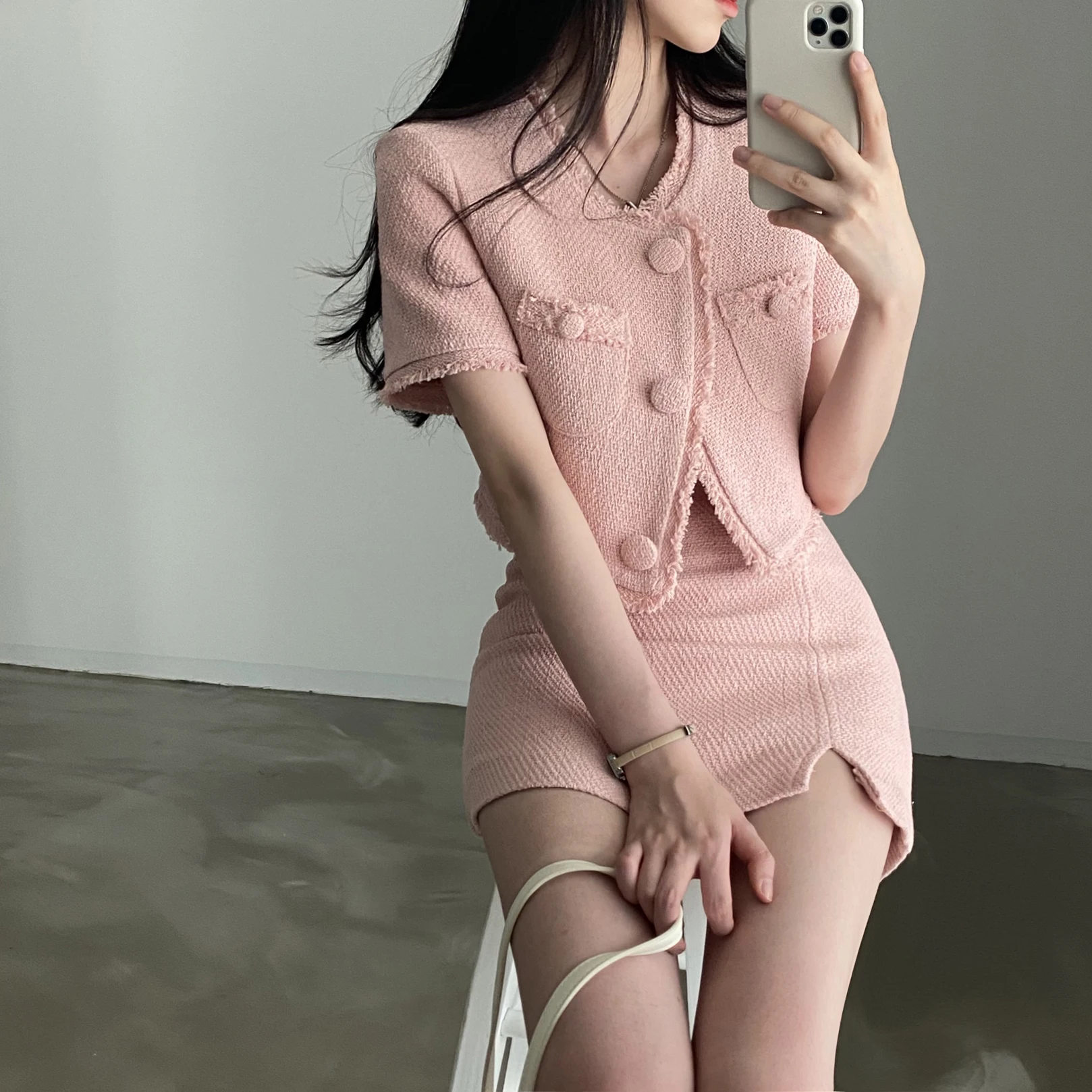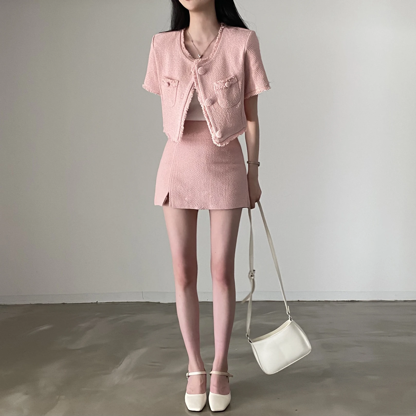 Yipinpay Chic Summer Elegant Round Short Sleeve Pink Tweed Jacket Short Tassel Shirt Mini Skirt Sets 2023 Fashion