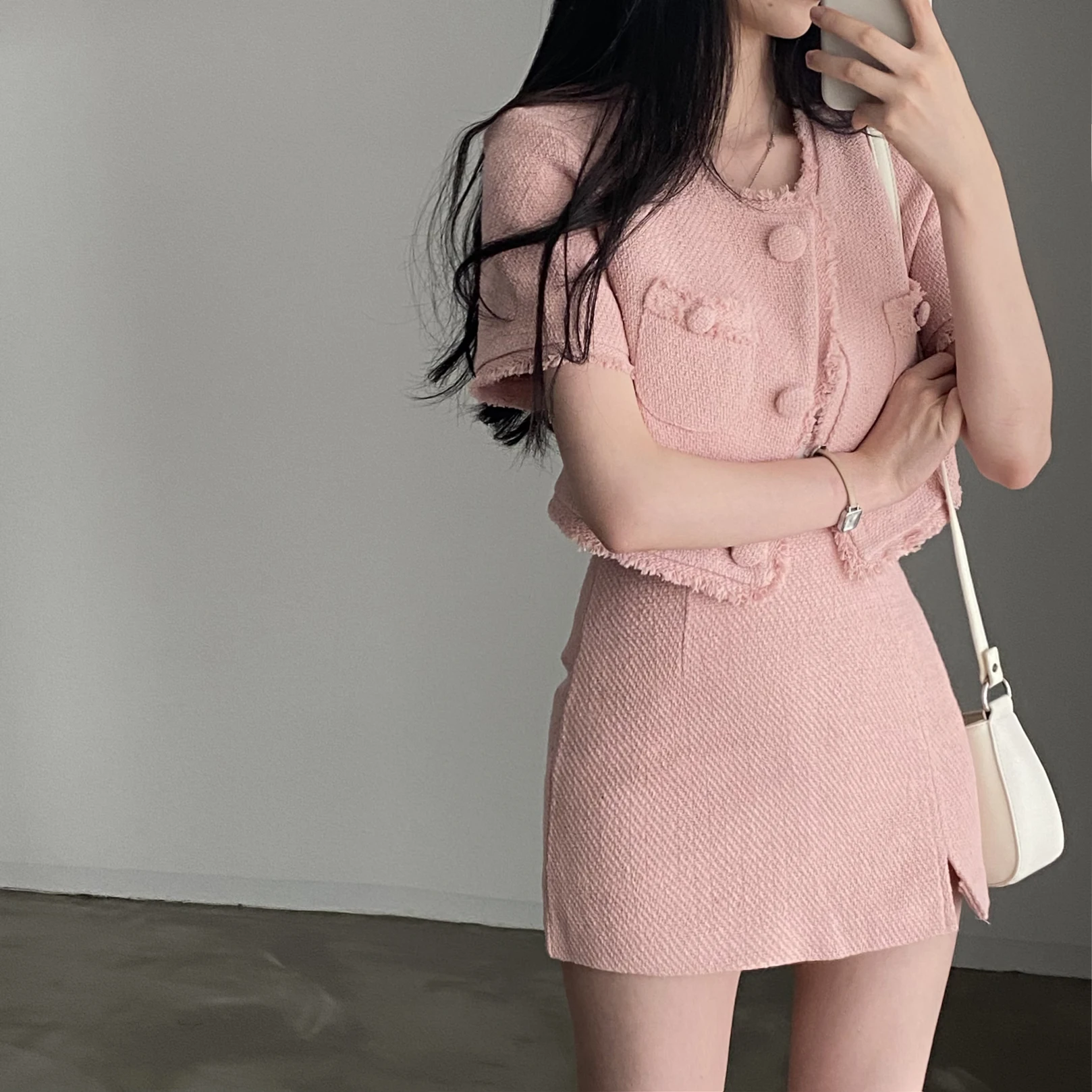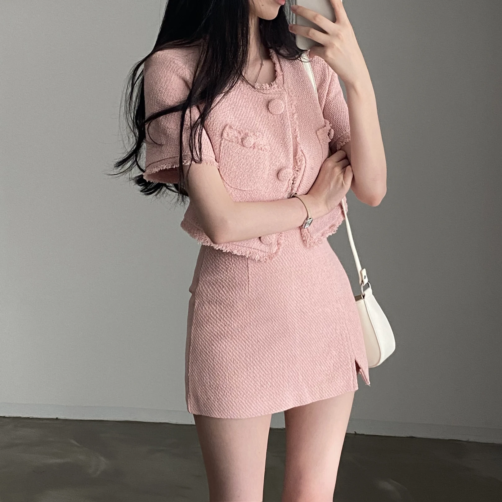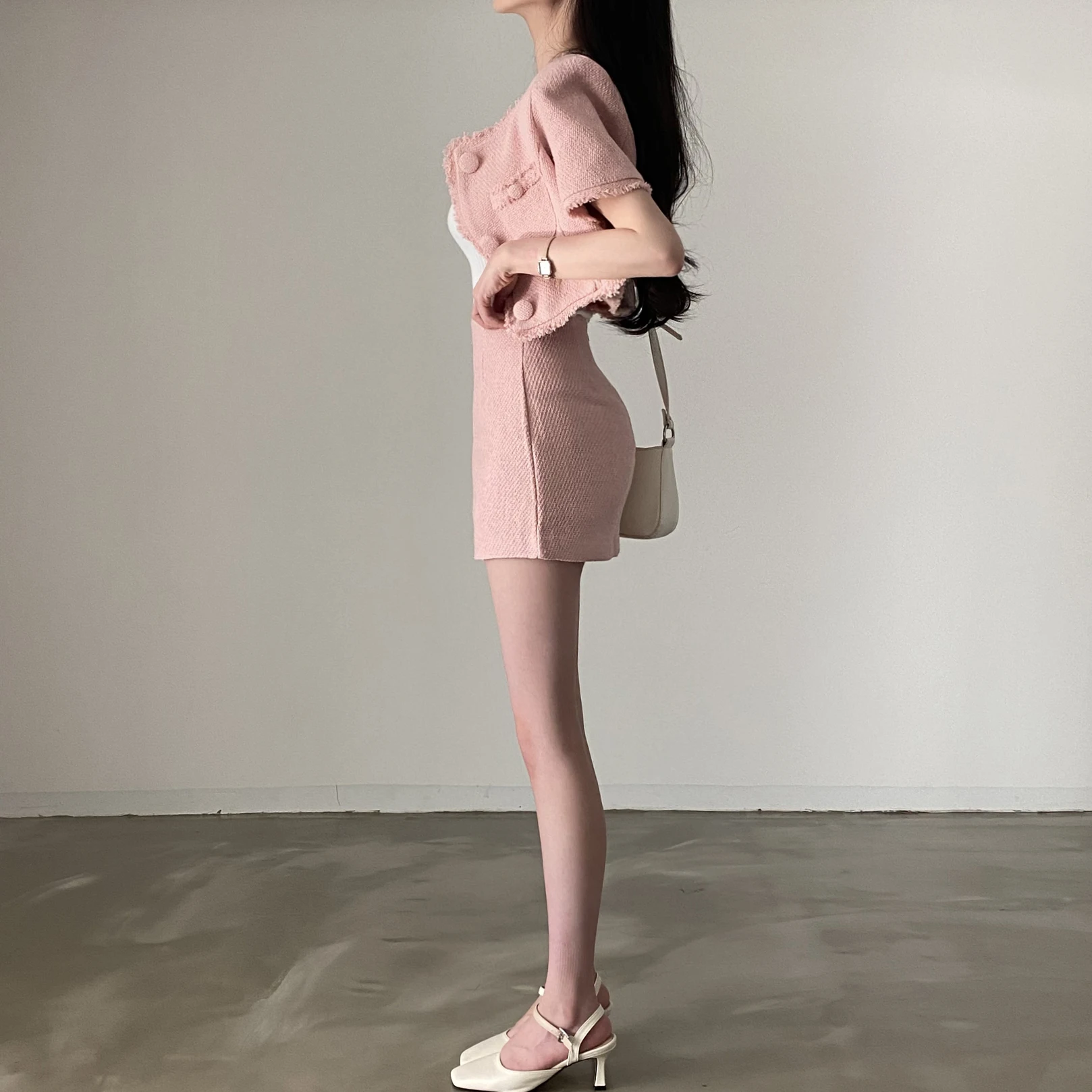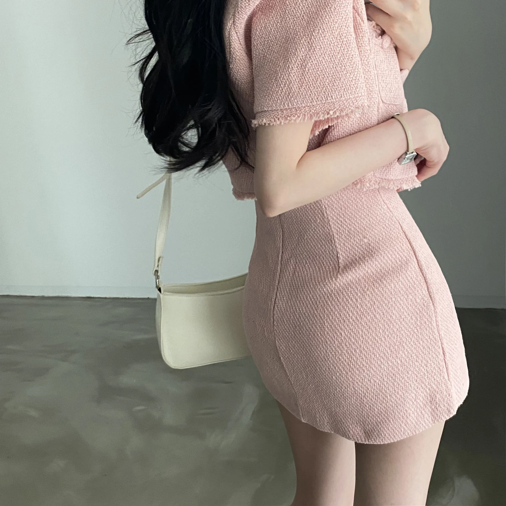 Yipinpay Chic Summer Elegant Round Short Sleeve Pink Tweed Jacket Short Tassel Shirt Mini Skirt Sets 2023 Fashion