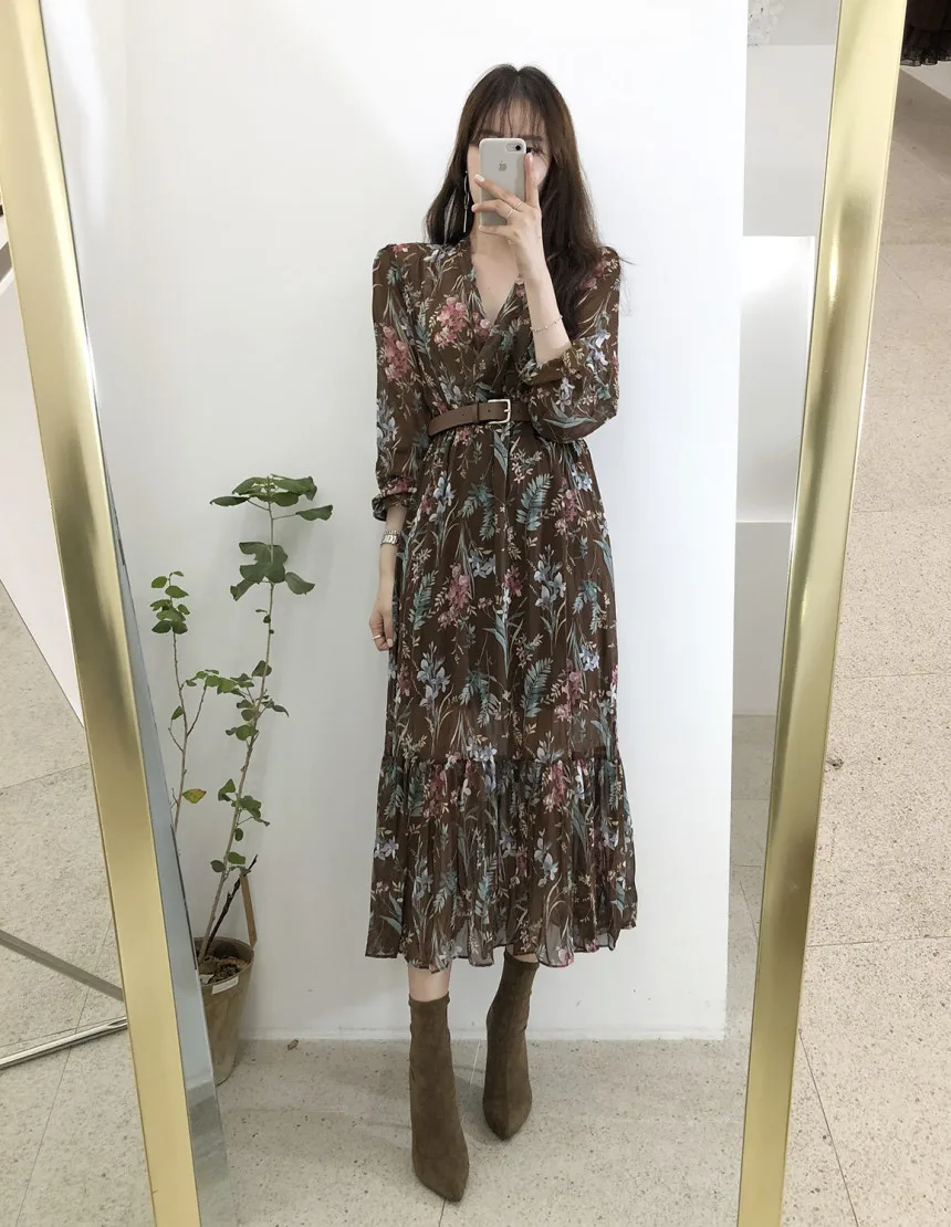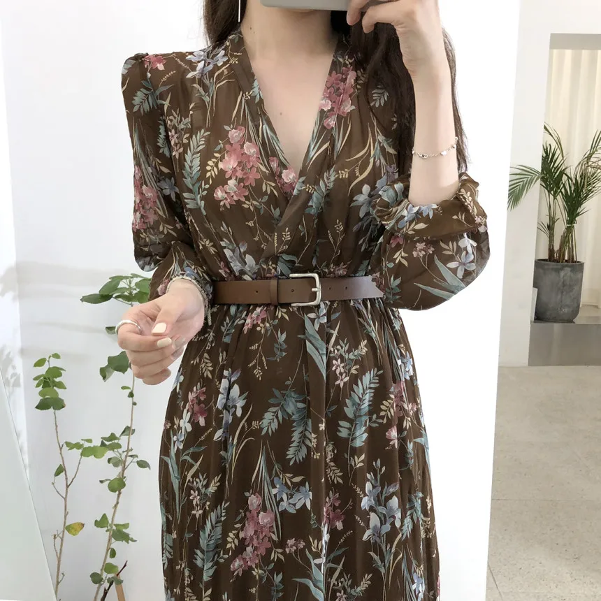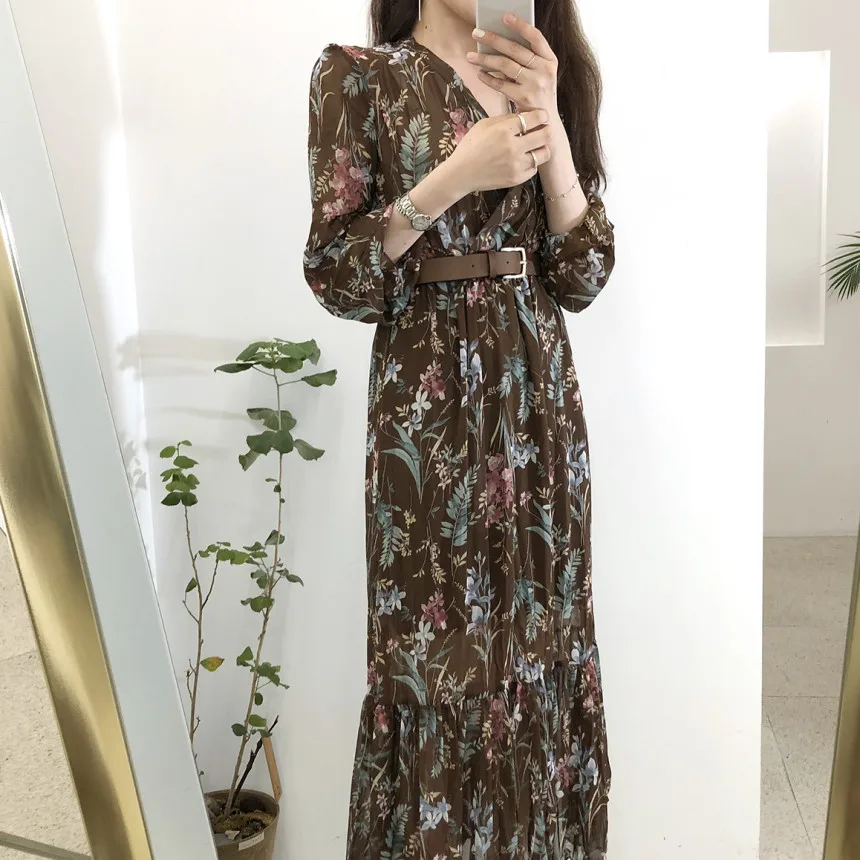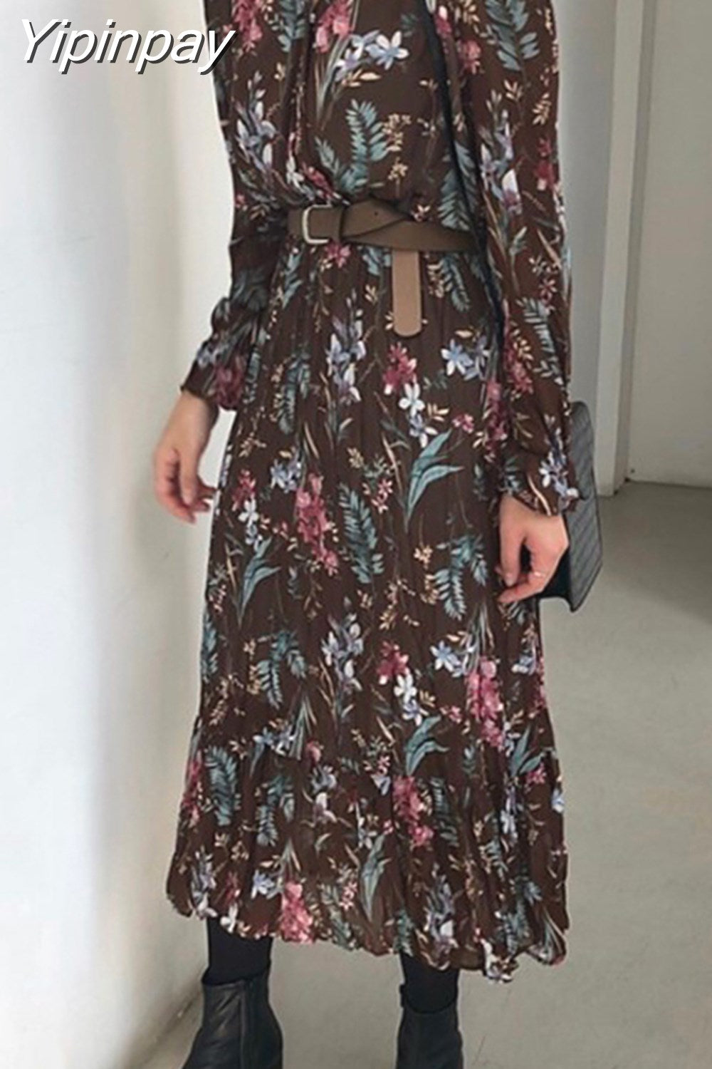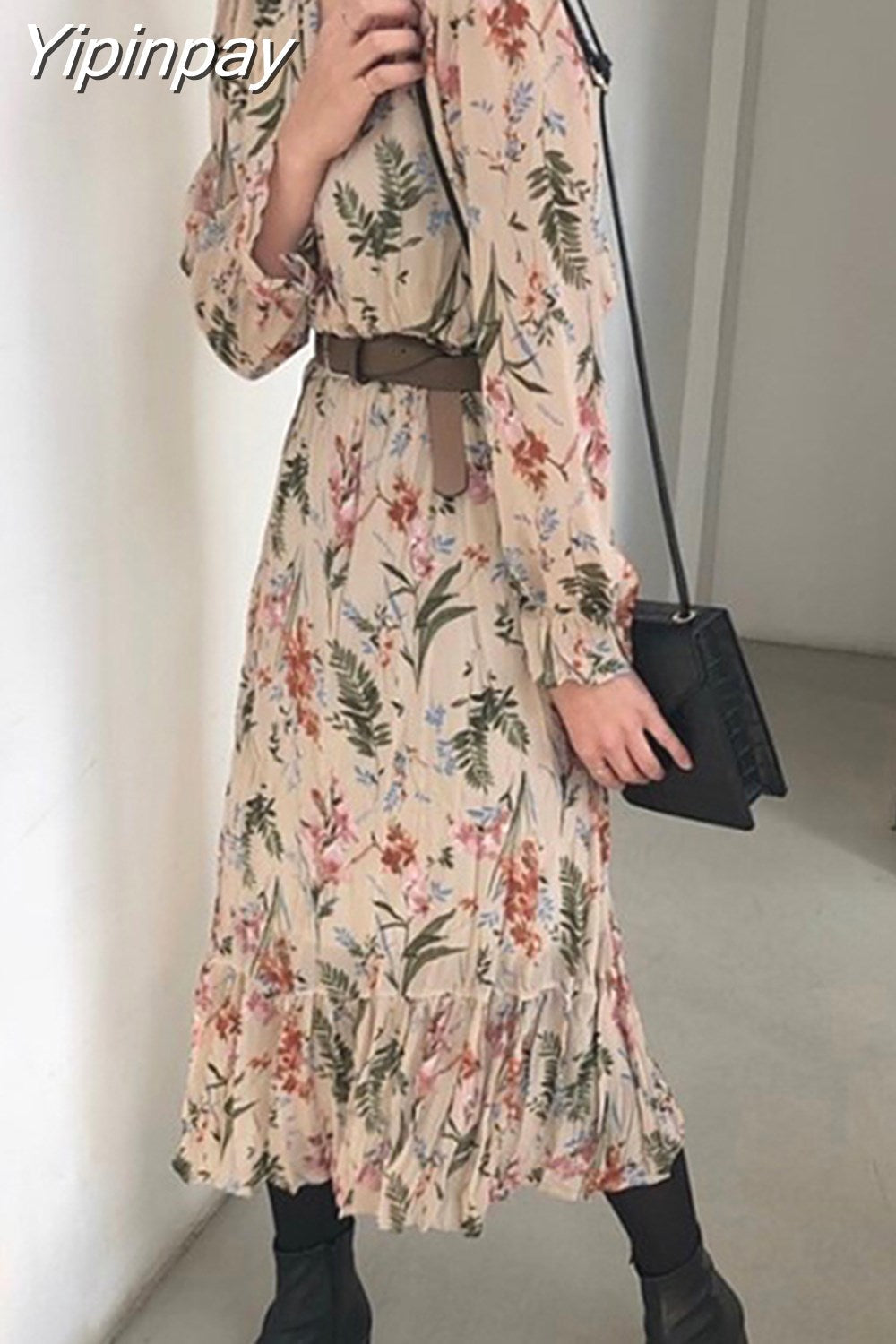 Yipinpay Chiffon Floral Dress Maxi v Neck Long Sleeve Flower Retro Elegant Korean Summer Beach Vestidos Primavera Verano 2023
