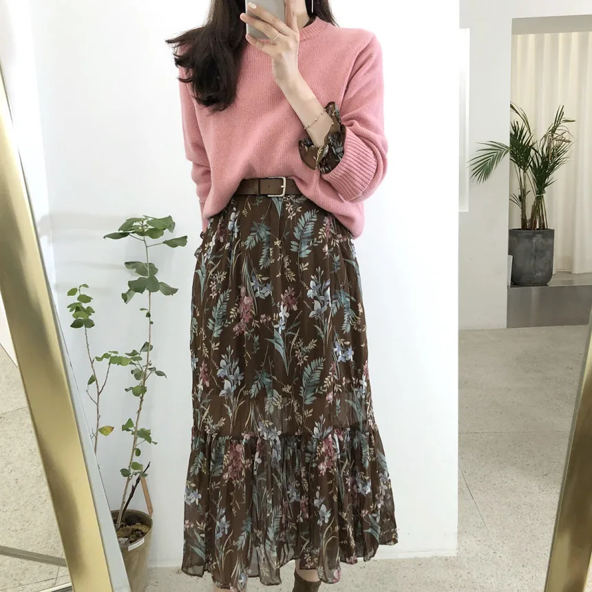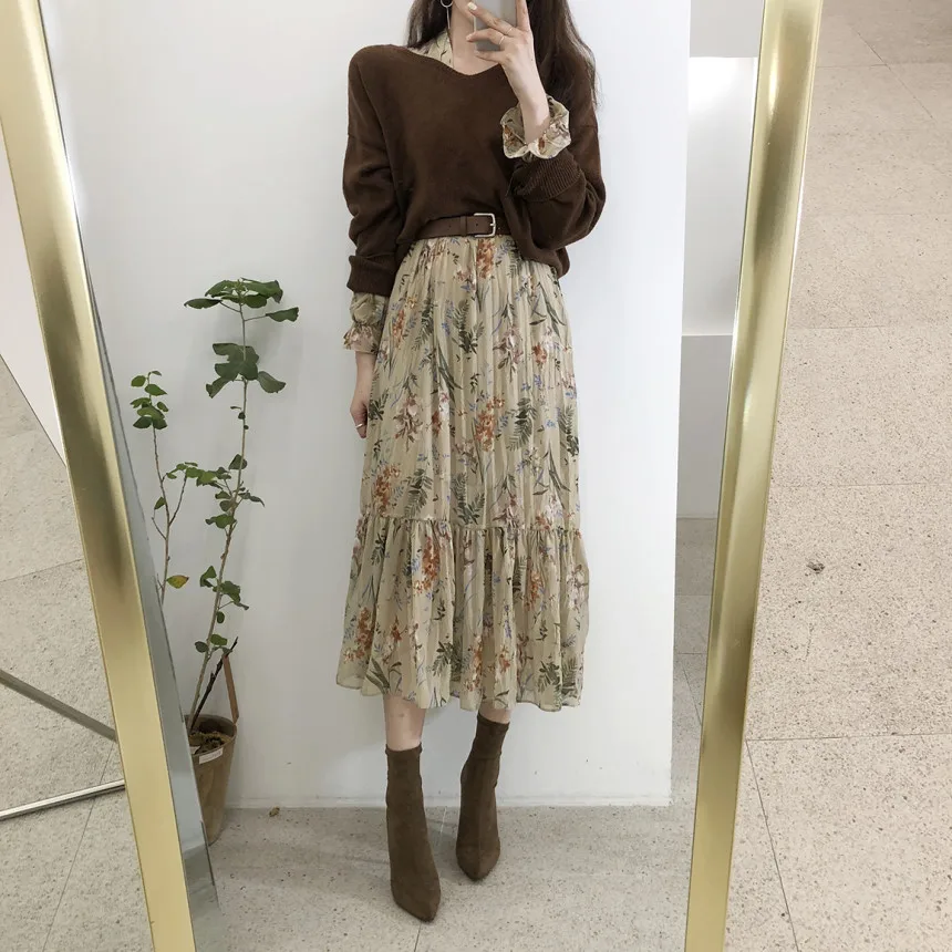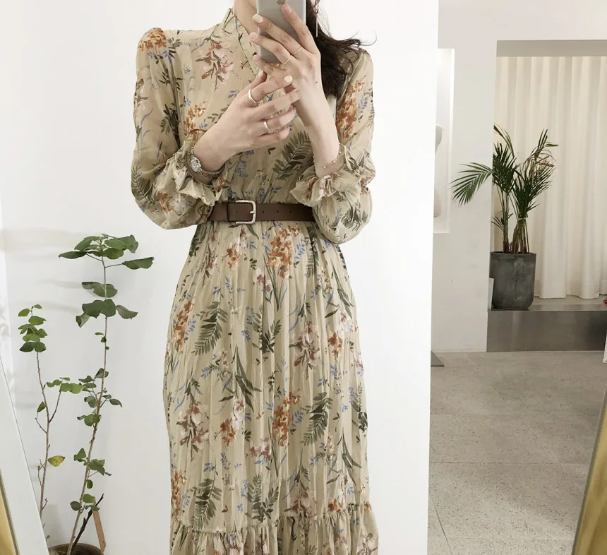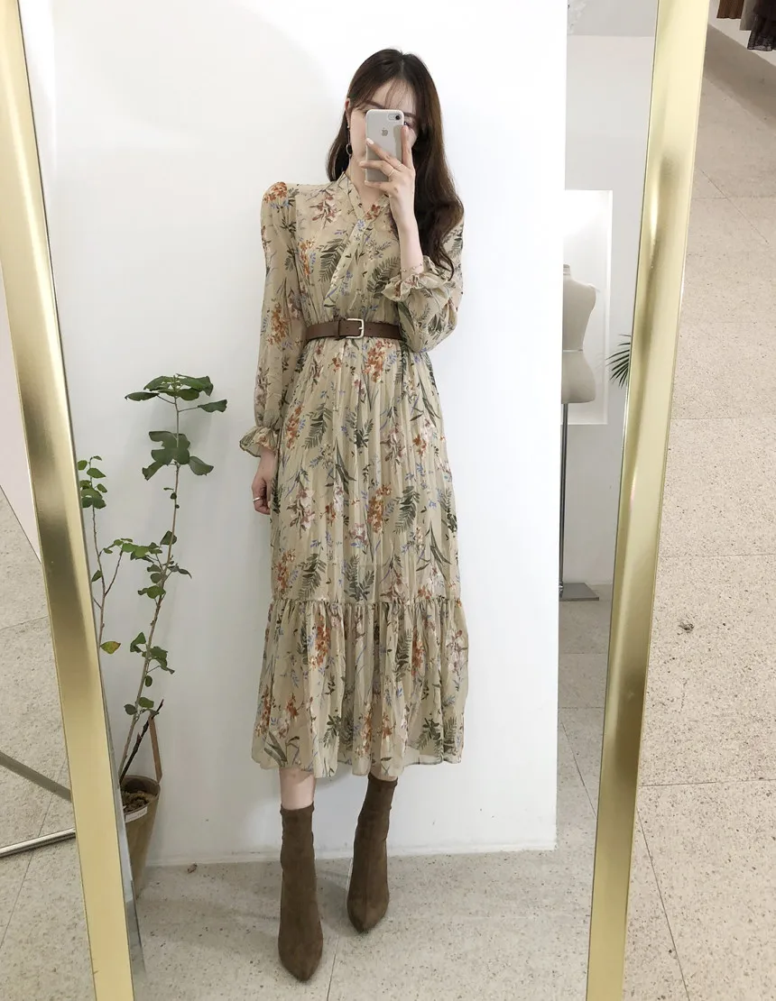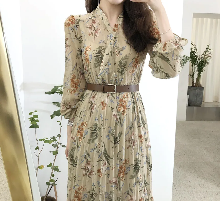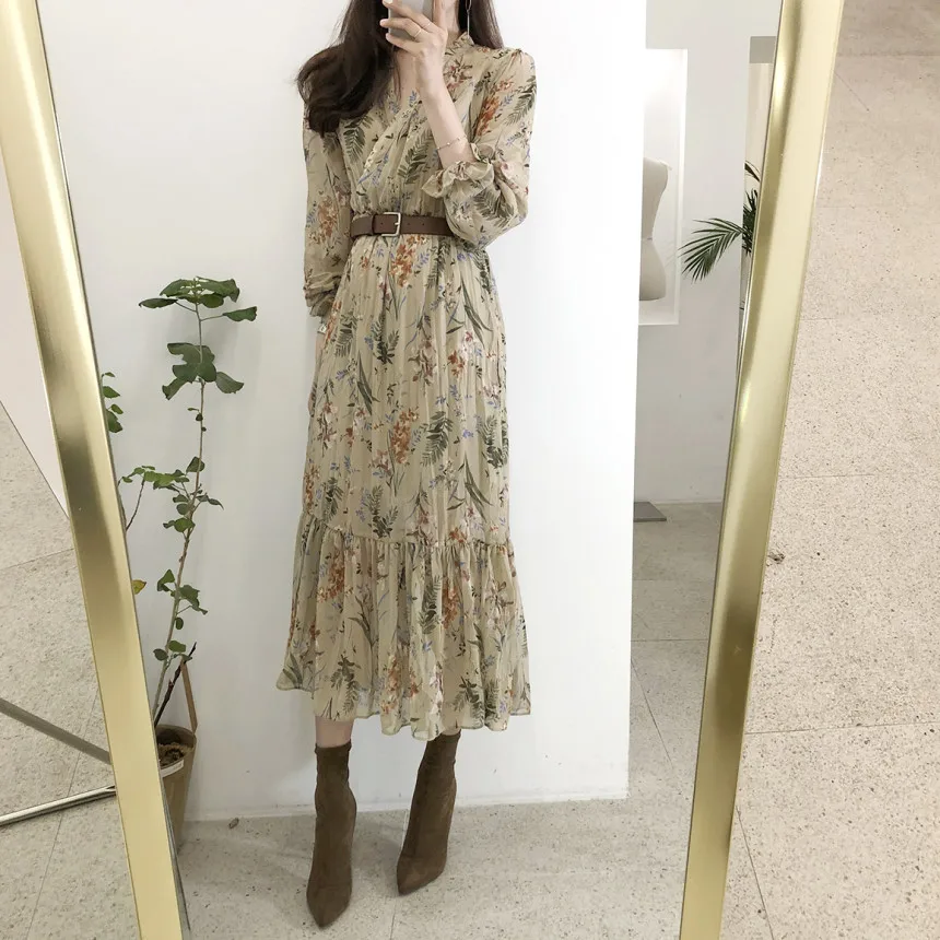 Yipinpay Chiffon Floral Dress Maxi v Neck Long Sleeve Flower Retro Elegant Korean Summer Beach Vestidos Primavera Verano 2023