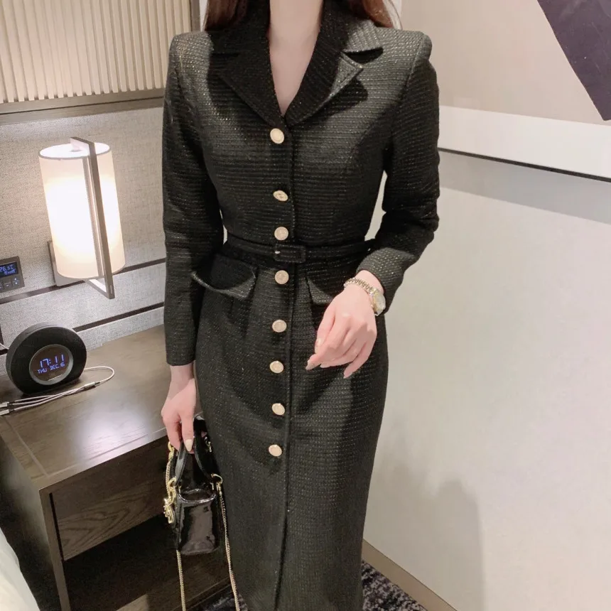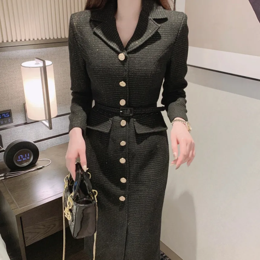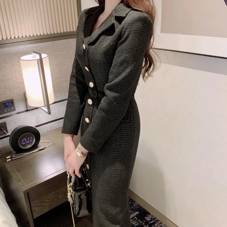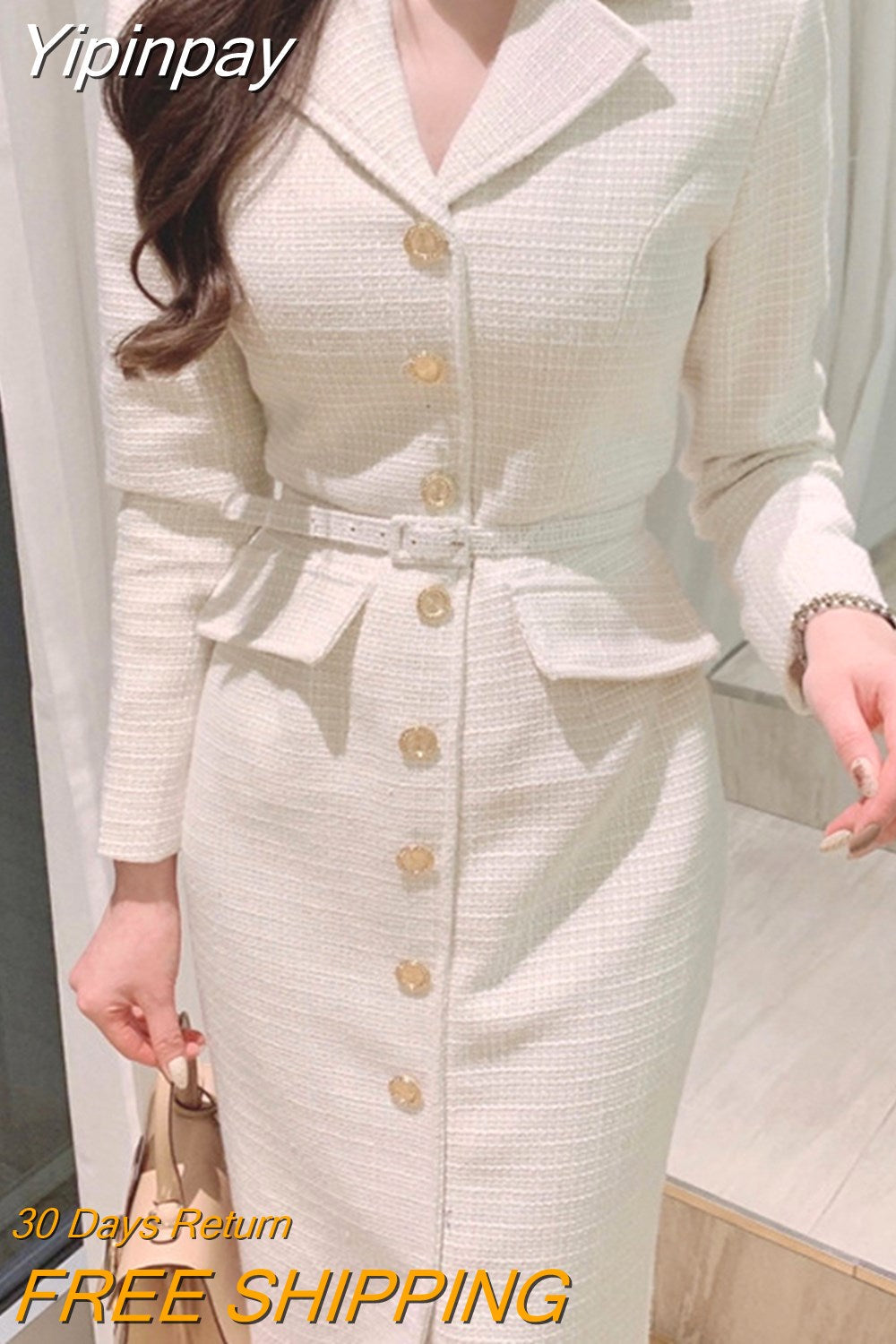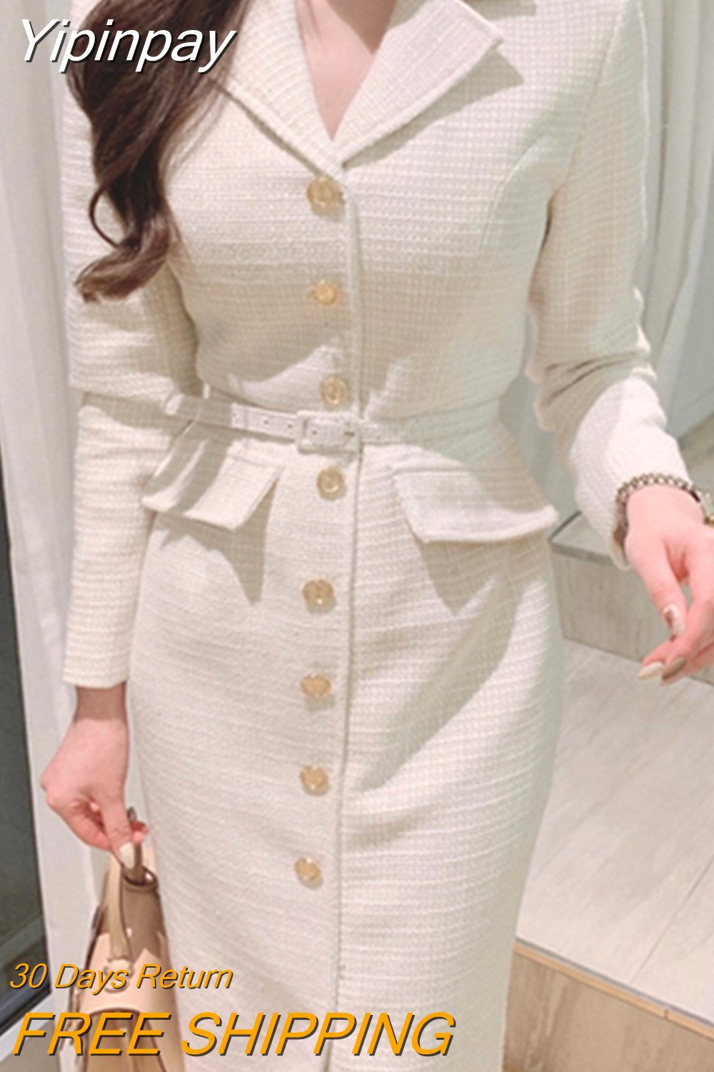 Yipinpay Collar Metal Single Breasted Lace Up Waist Black Tweed Dress Vestidos De Mujer Autumn Winter A Line Elgeant Plaid Dresses