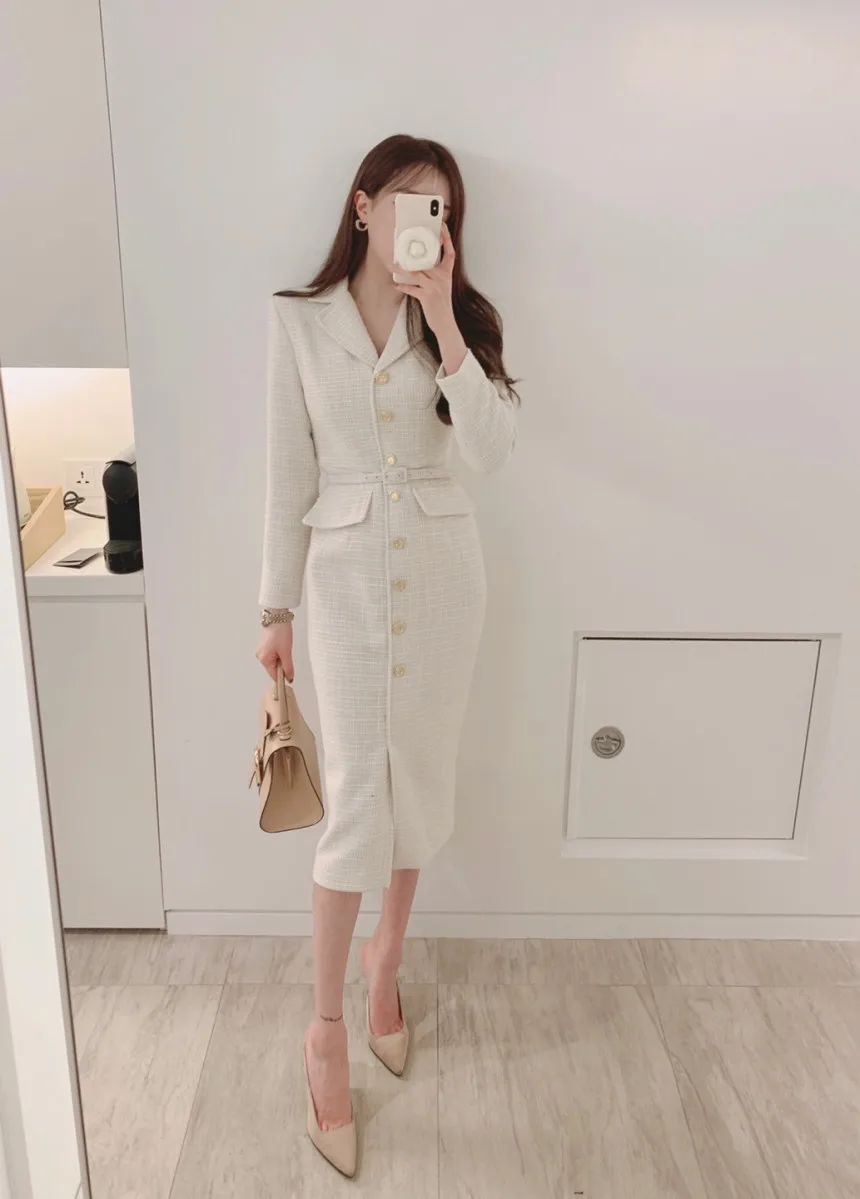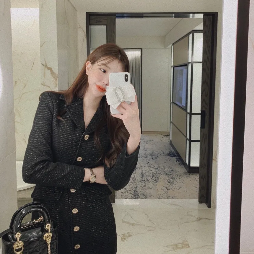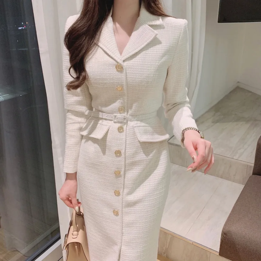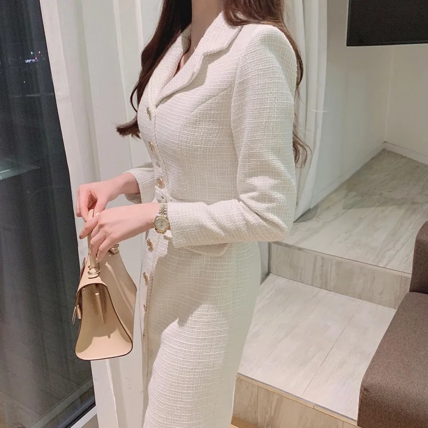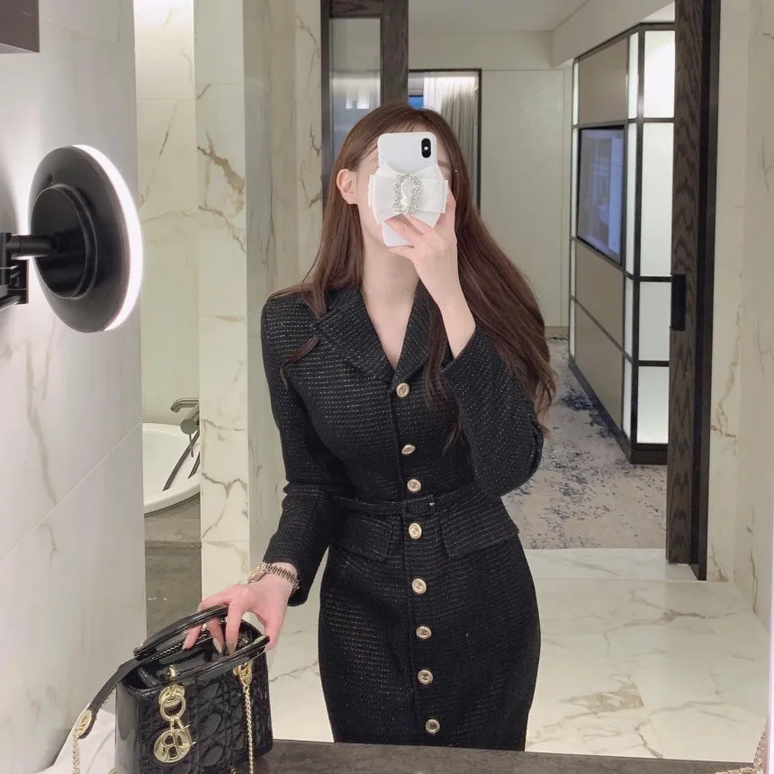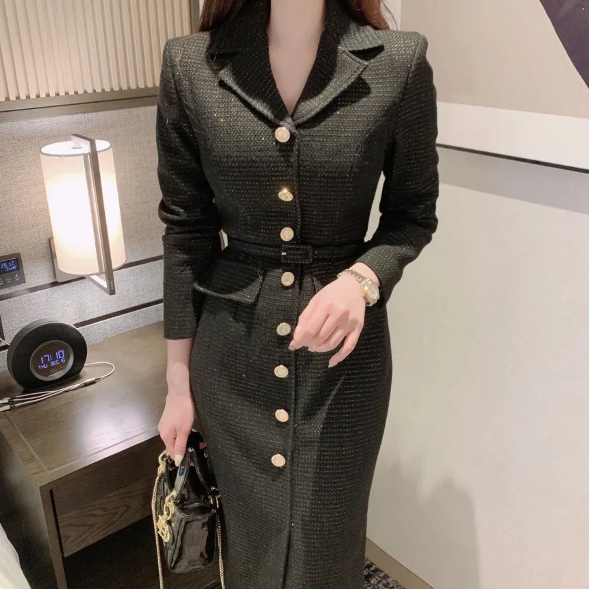 Yipinpay Collar Metal Single Breasted Lace Up Waist Black Tweed Dress Vestidos De Mujer Autumn Winter A Line Elgeant Plaid Dresses