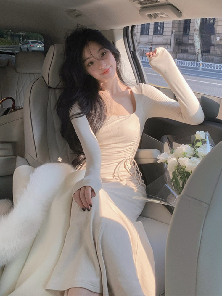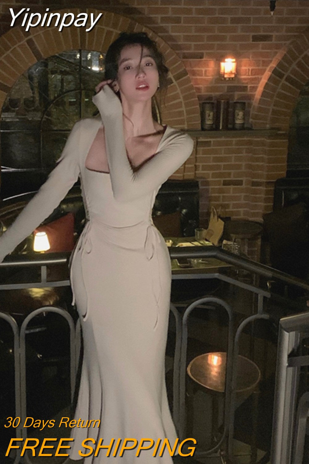Yipinpay Colo Elegant Midi Dress Slim Casual 2023 Autumn Korea Fashion Evening Party Dress Woman Long Sleeve Sexy Bodycon Dress