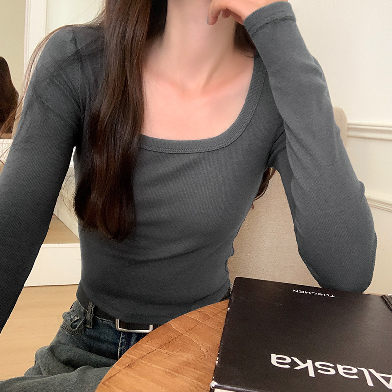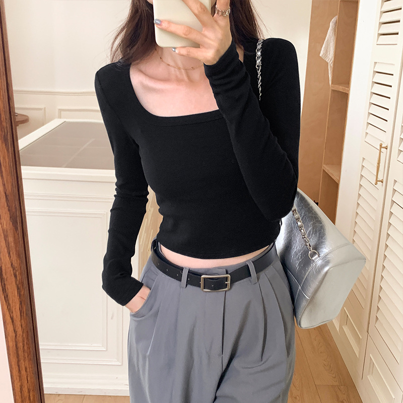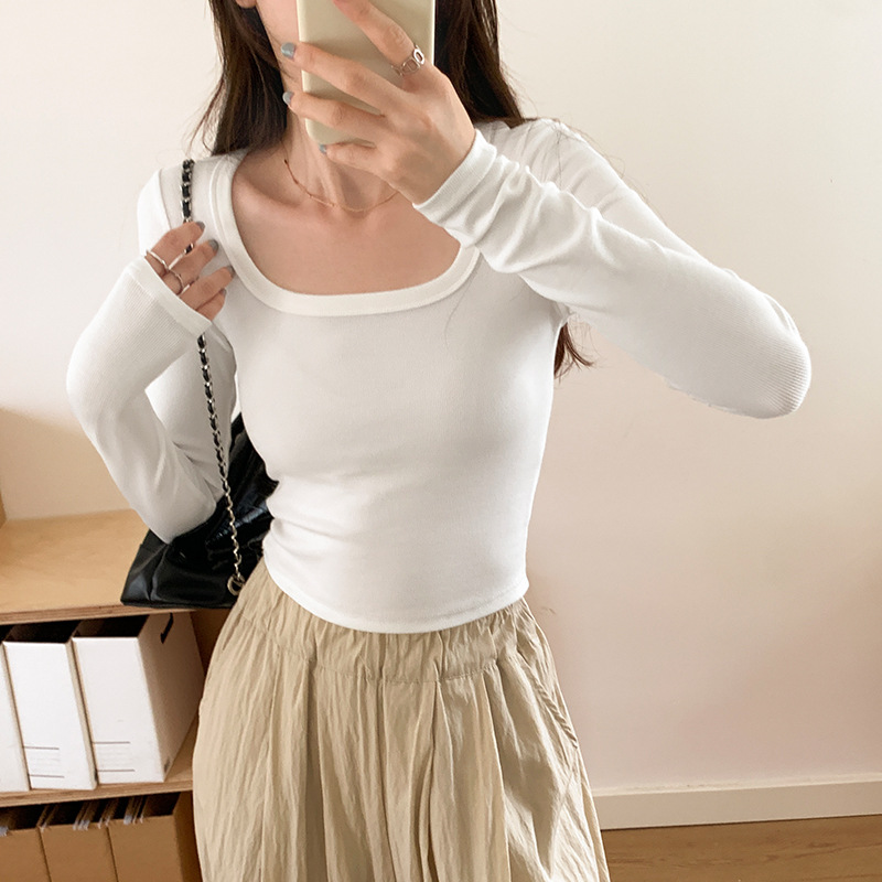 Yipinpay Color Straight Shoulder Slim Square Collar Threaded Short-Sleeved T-Shirt Early Autumn All Look Thin Undershirt