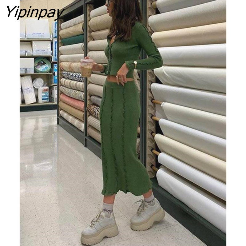 Yipinpay Convex Strip Solid 2 Piece Set Women Fashion Cropped Shirts And Slim Skirt Suits Spring Female Button Tops Skirts Outfits