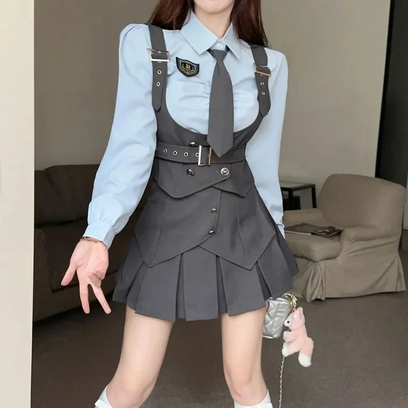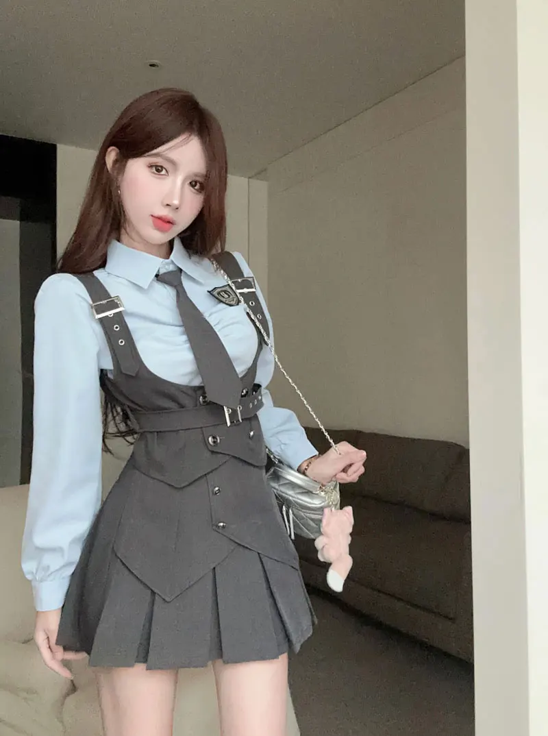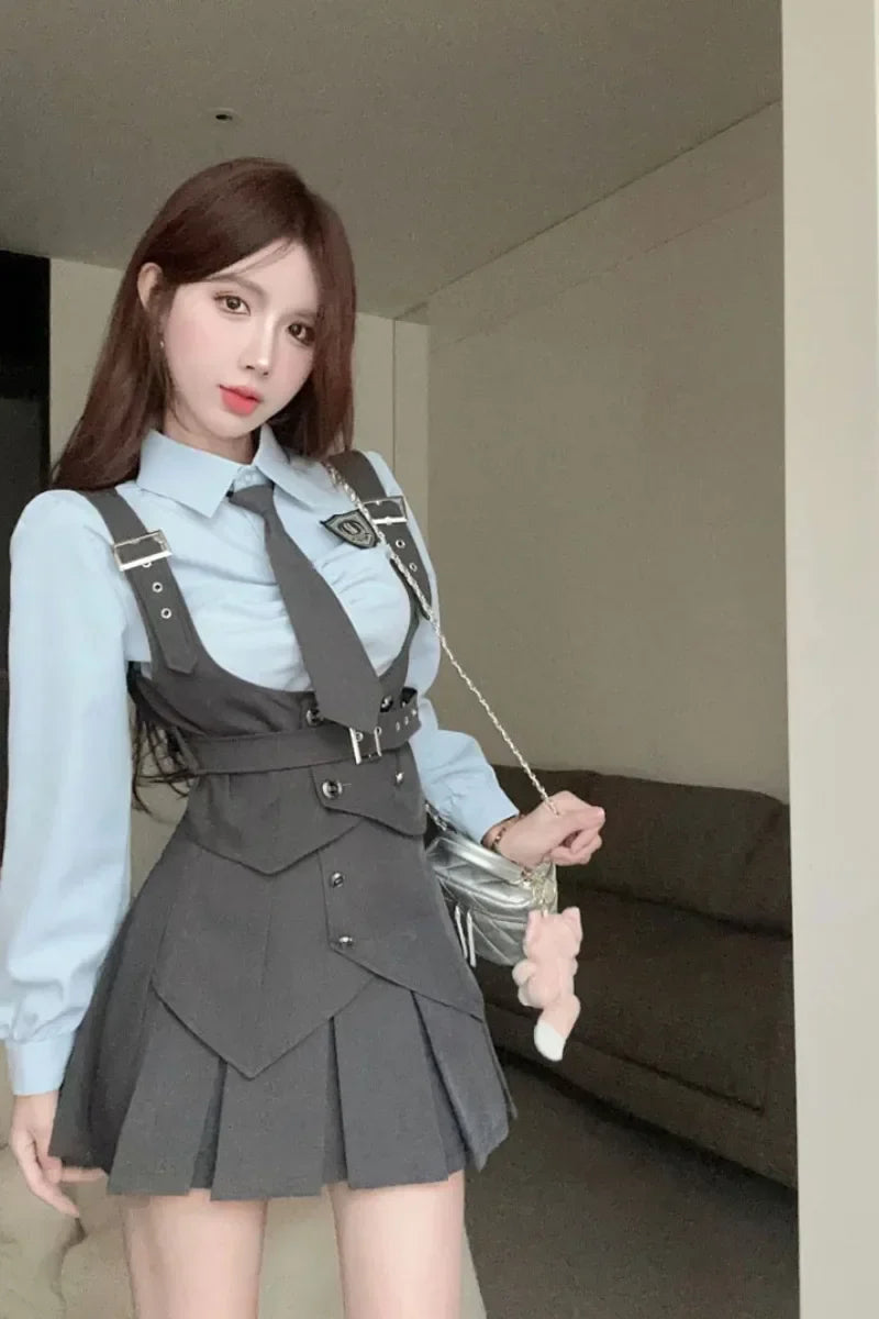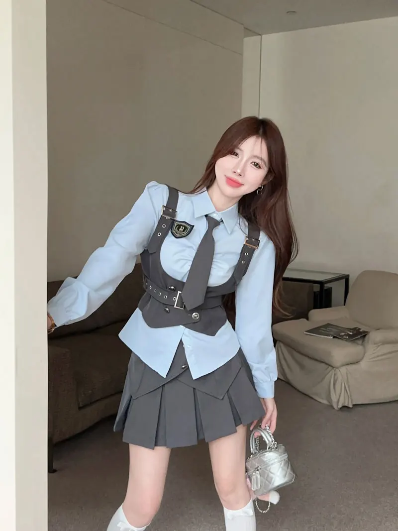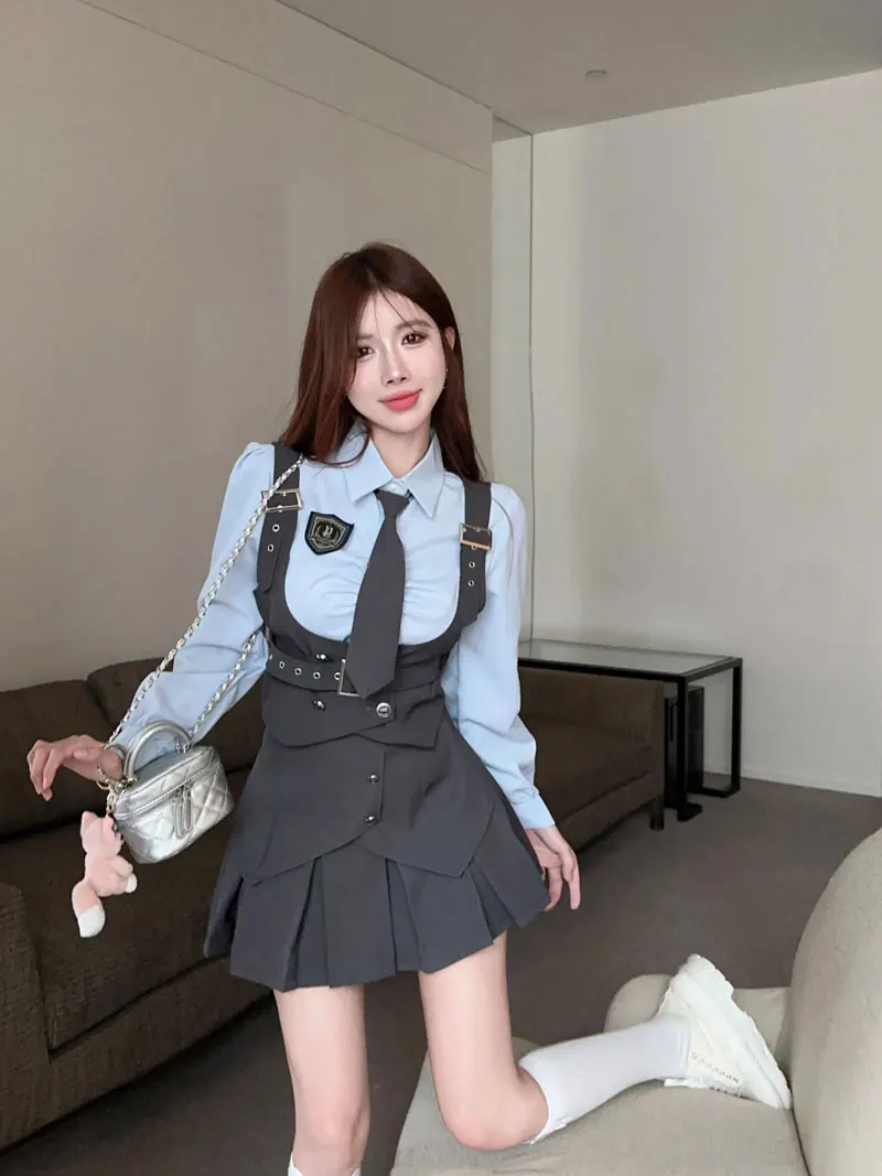 Yipinpay Cool Hot Girls College Style Suit Women's Autumn Slim Shirt High Waist Pleated Skirt Strap Vest Fashion Three-piece Set