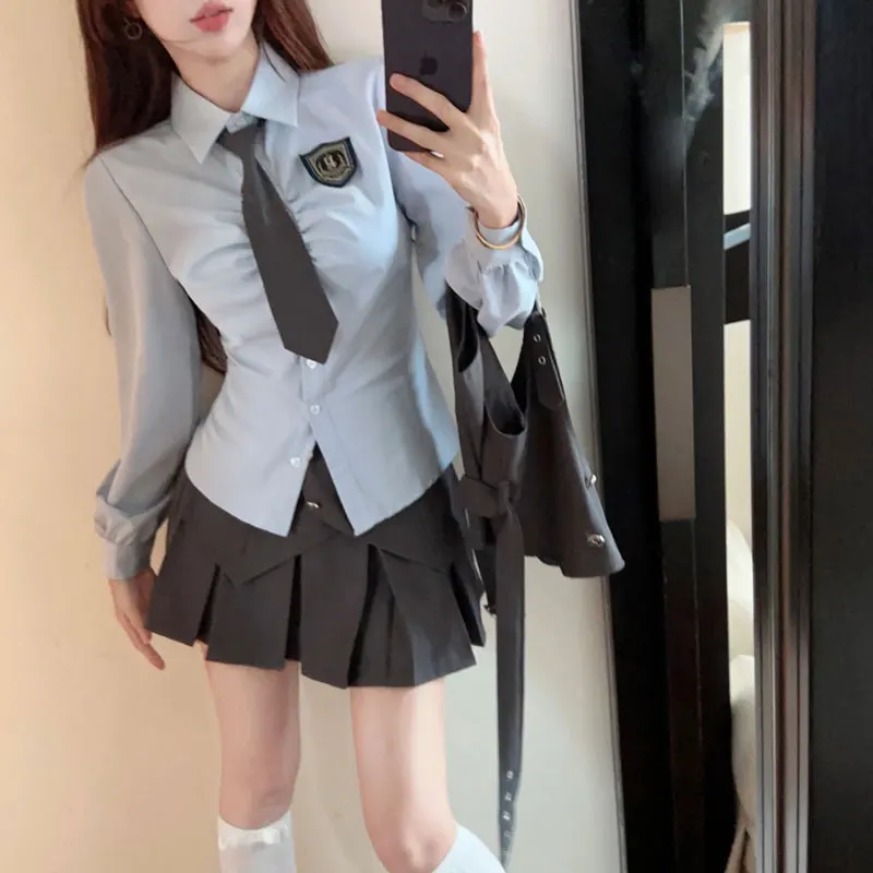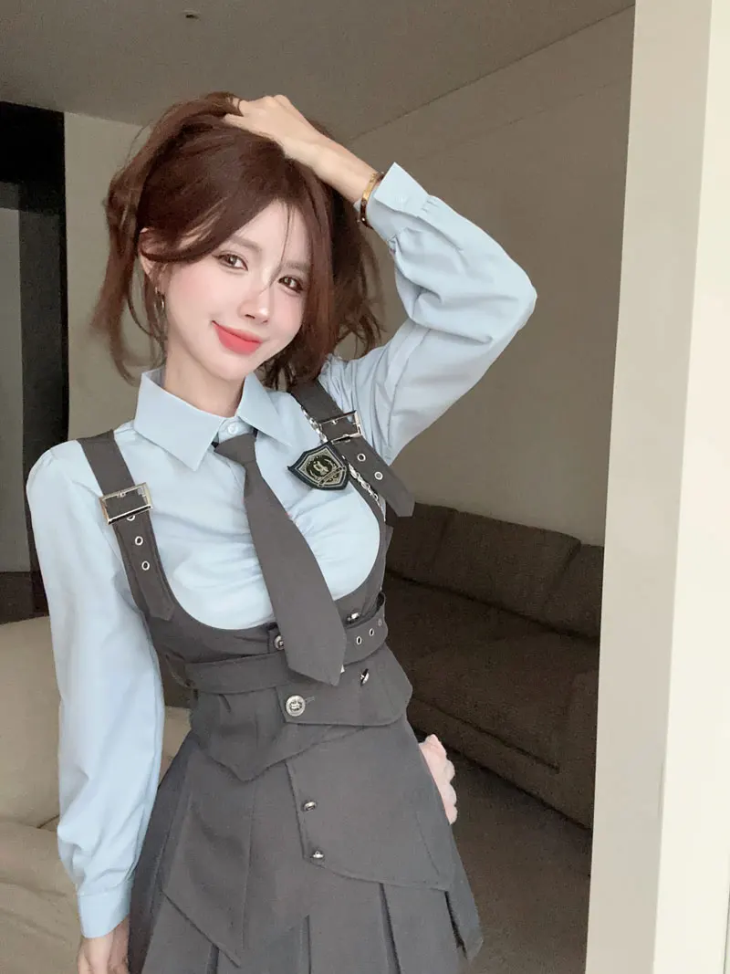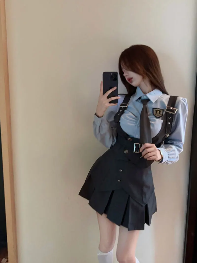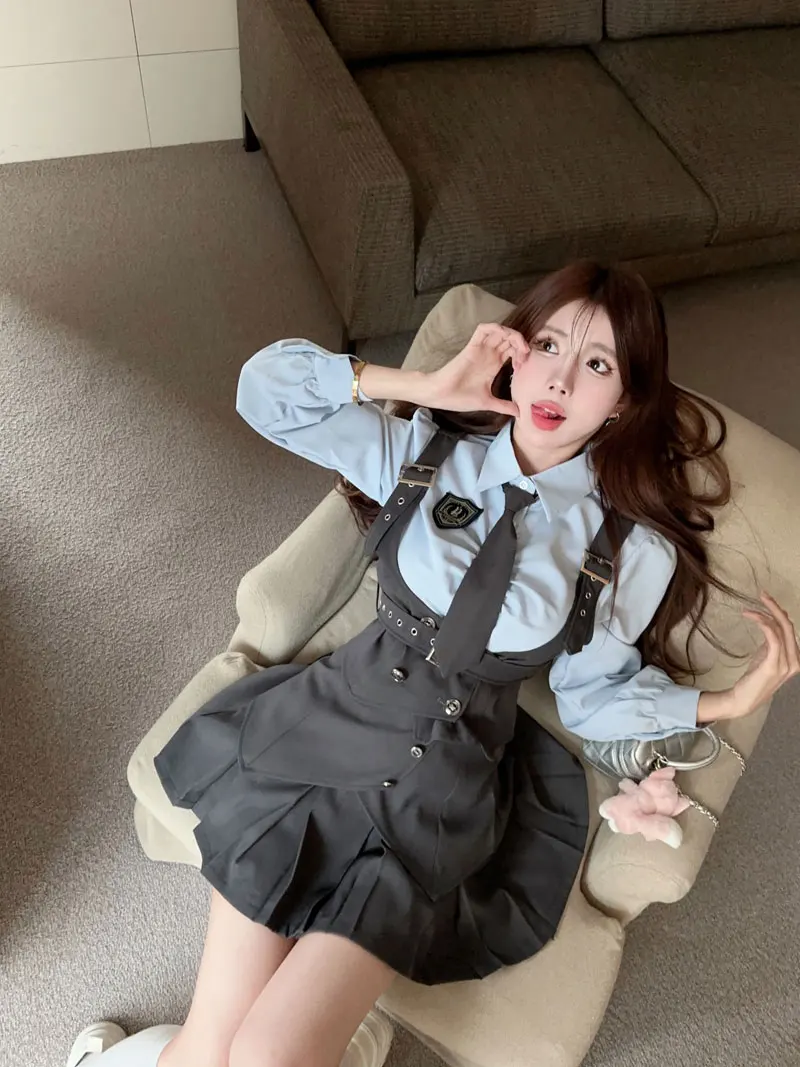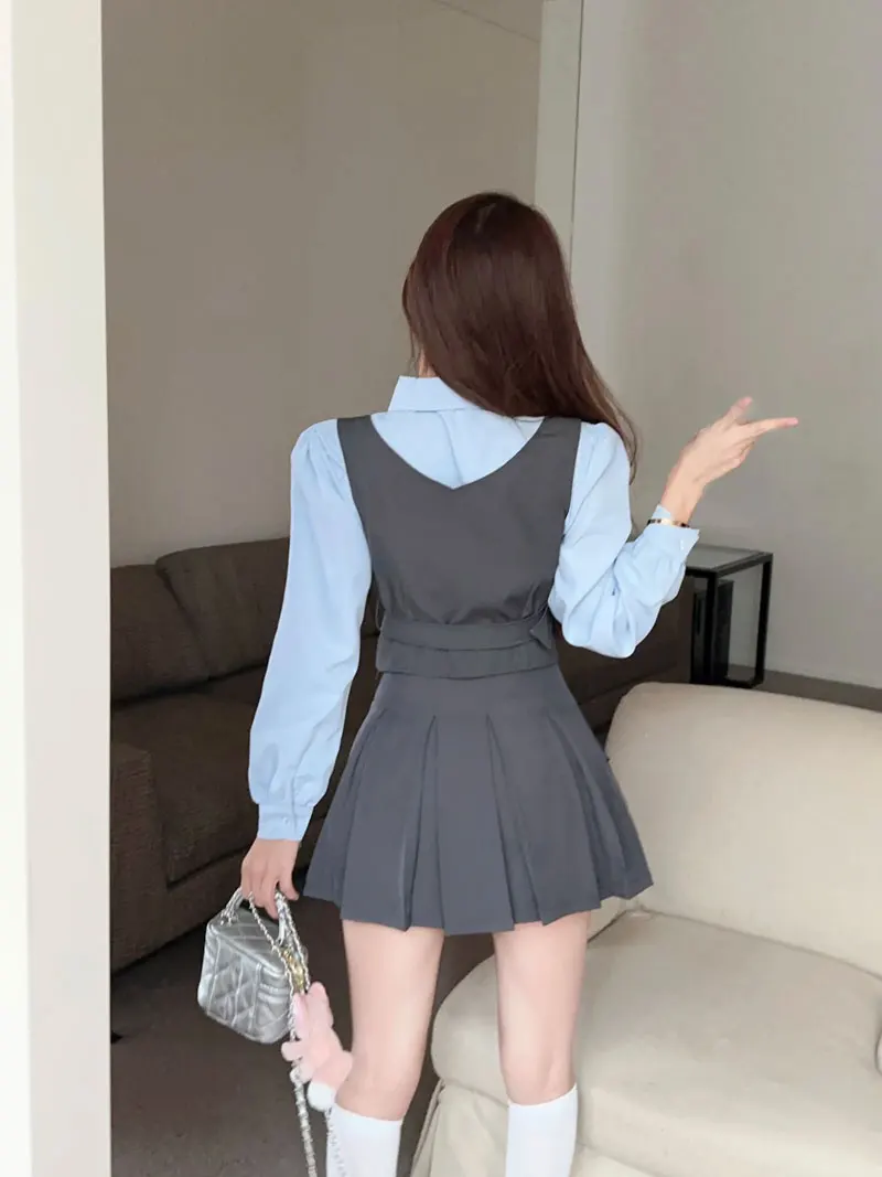 Yipinpay Cool Hot Girls College Style Suit Women's Autumn Slim Shirt High Waist Pleated Skirt Strap Vest Fashion Three-piece Set