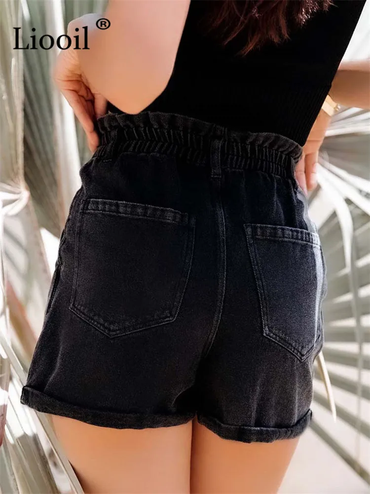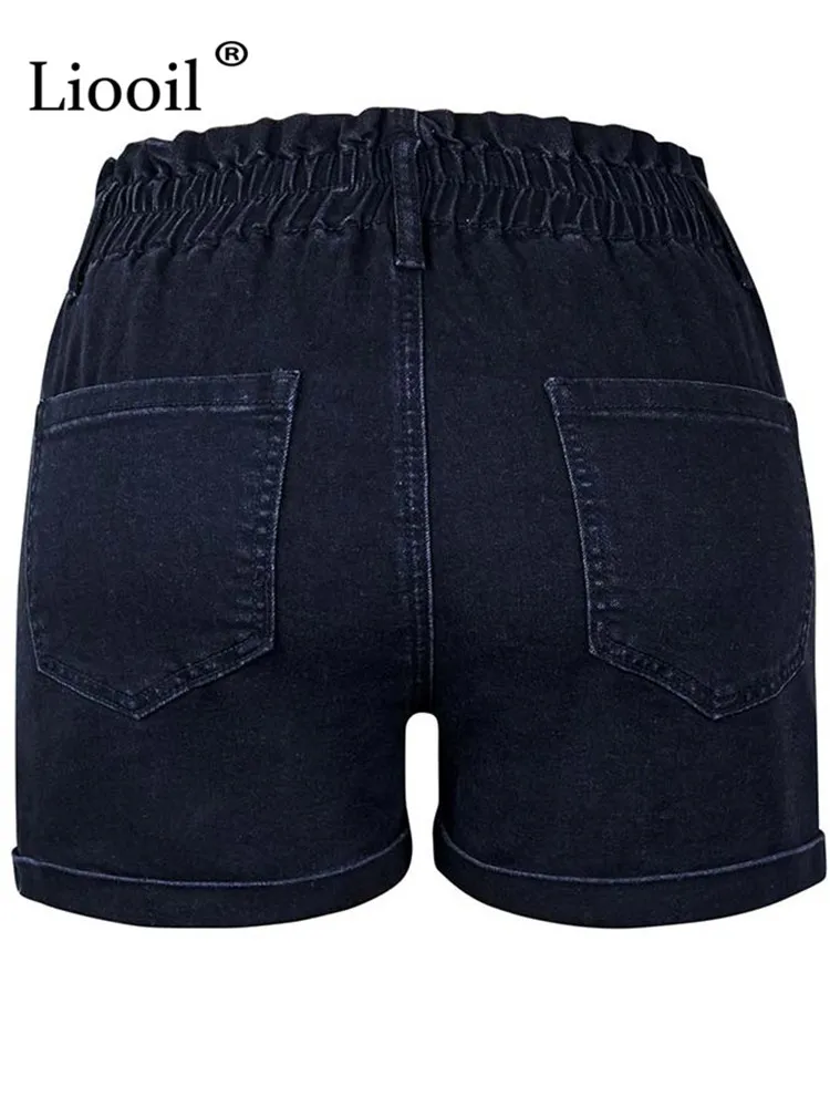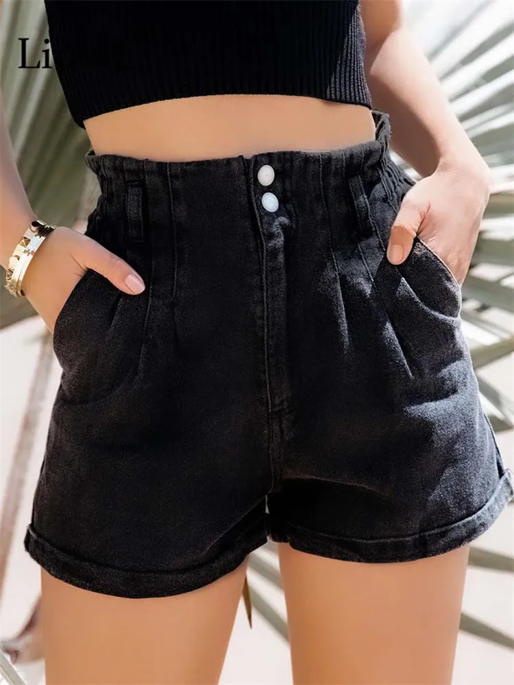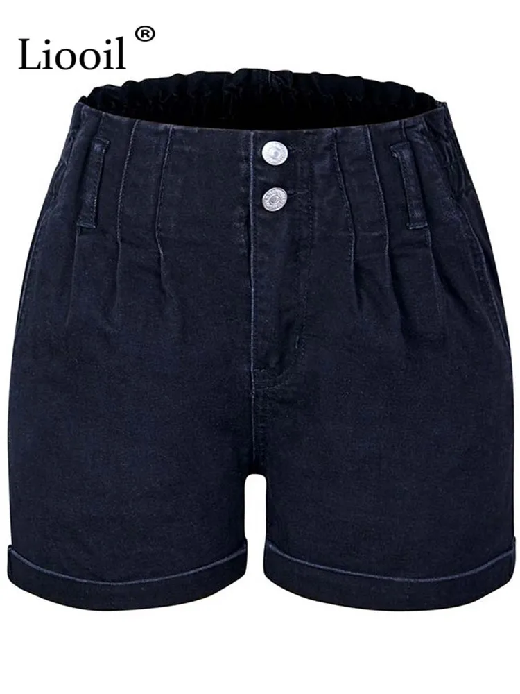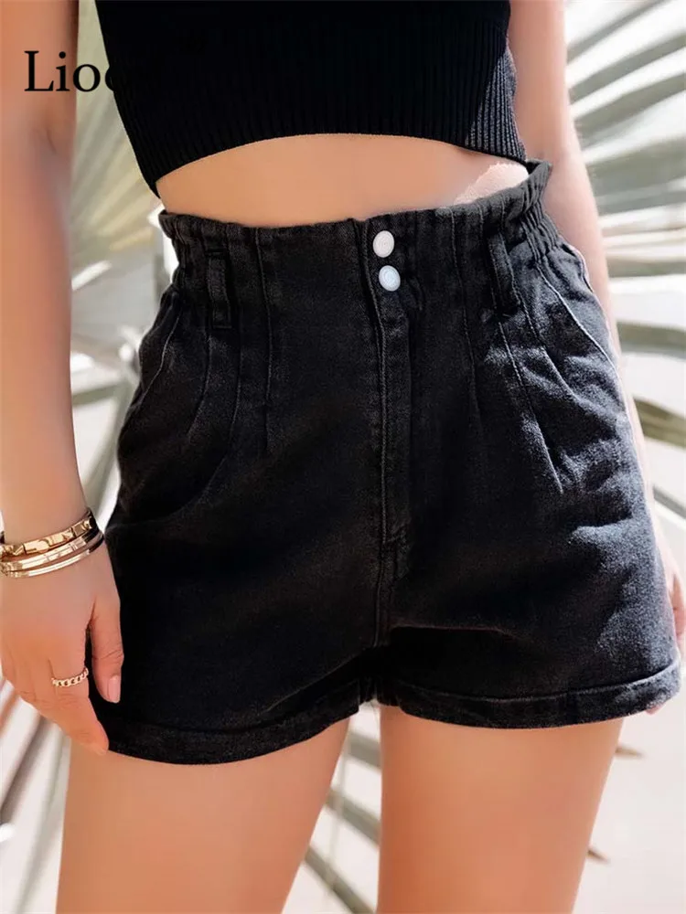 Yipinpay Cotton Button Elastic Waist Stretch Denim Shorts Woman High Waist Bottoms With Pockets Trendy High-Waisted Denim Shorts