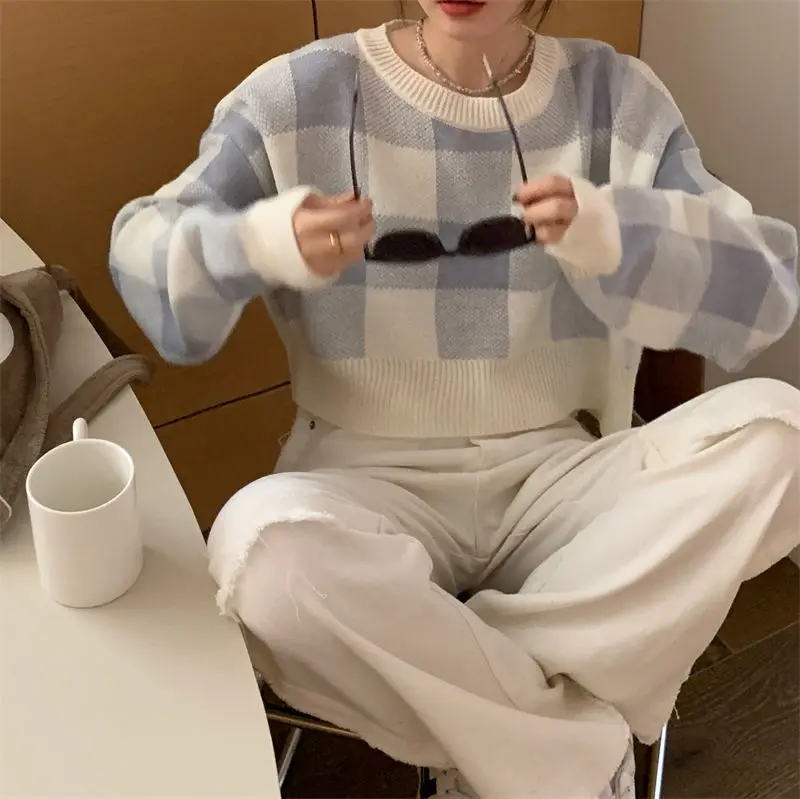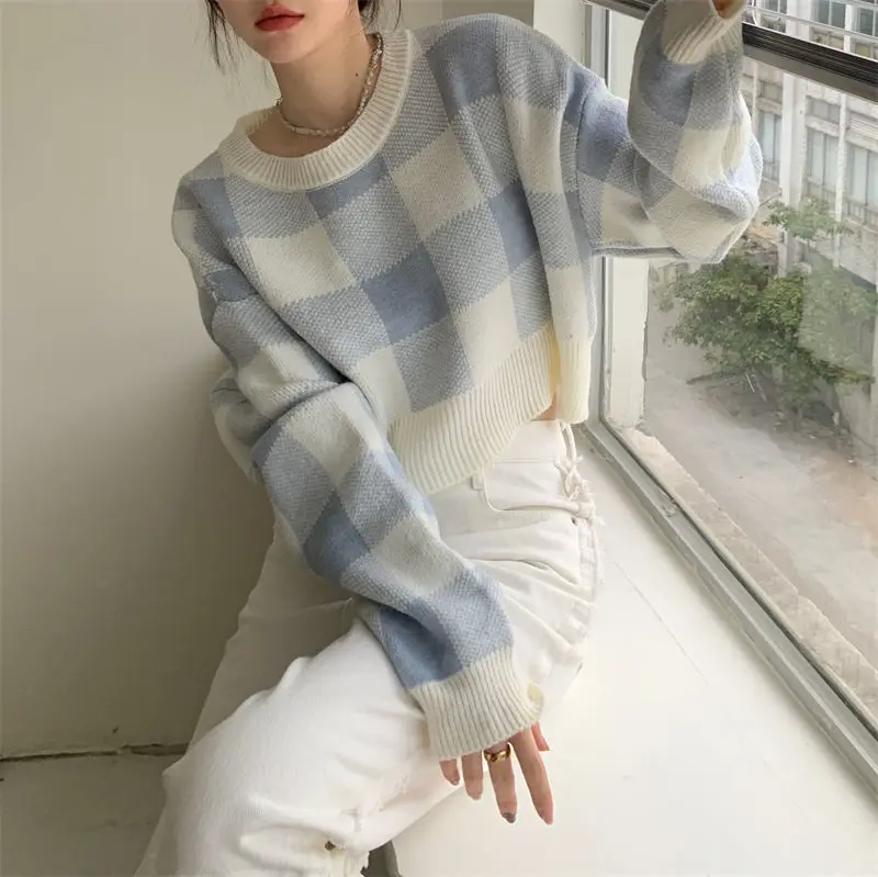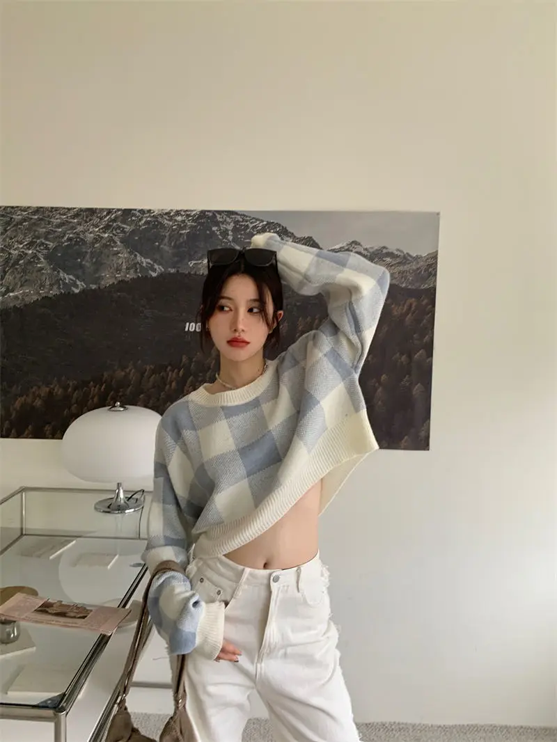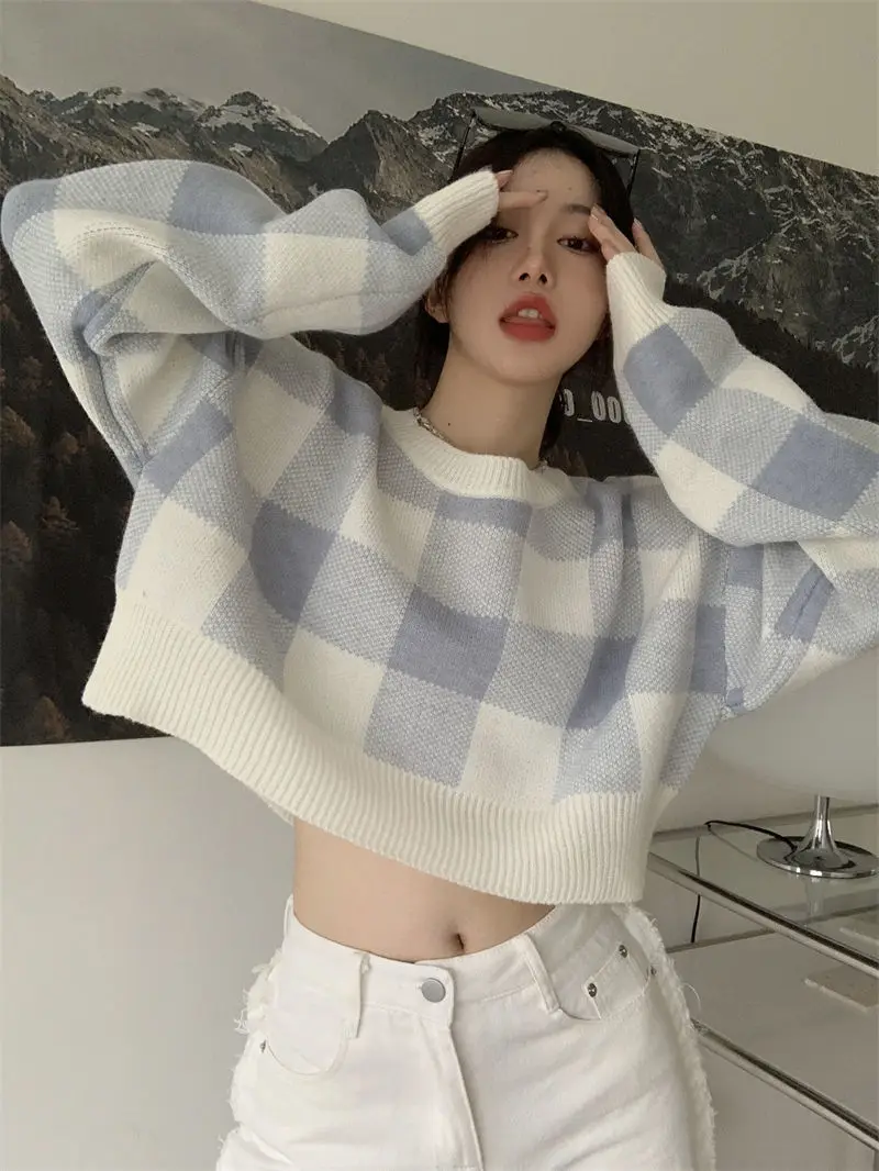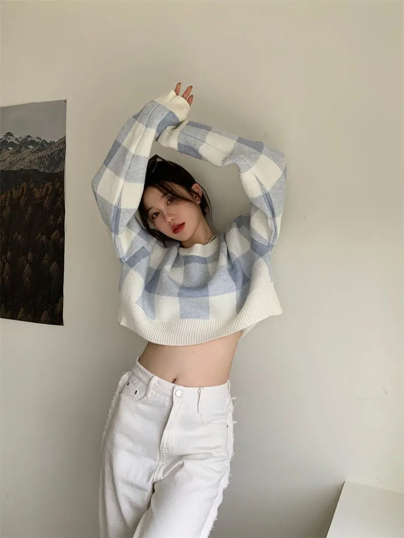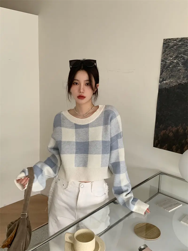 Yipinpay Crop Contrast Check Sweater Women Sueter Mujer Casual Knit Outwear Top 2023 Shirts for Women Blue Plaid Sweaters