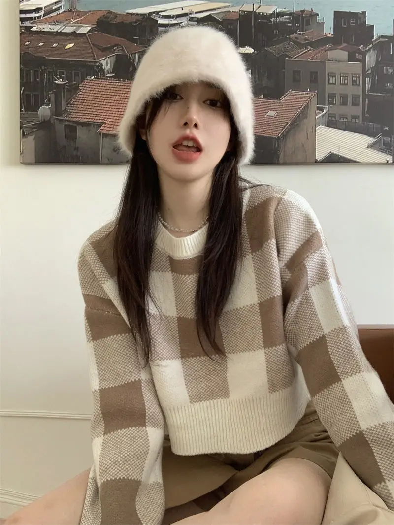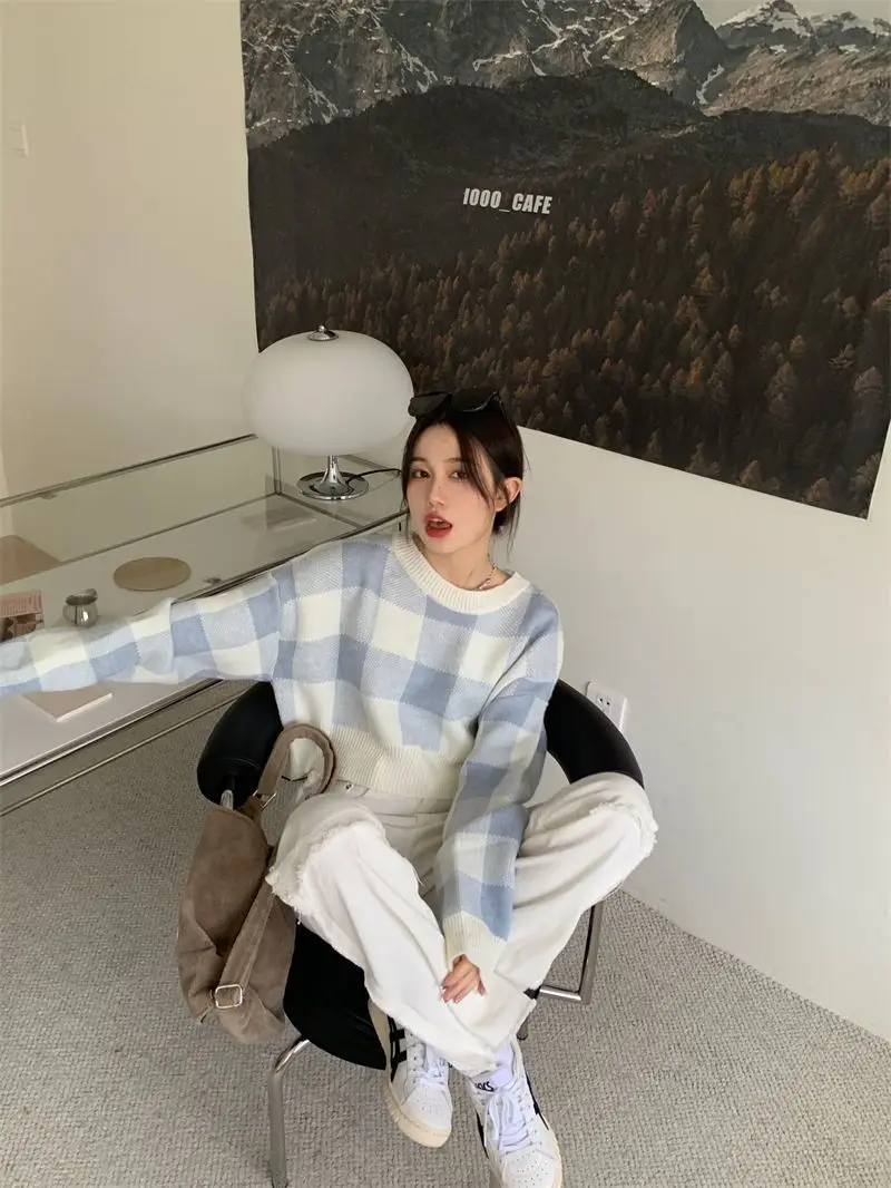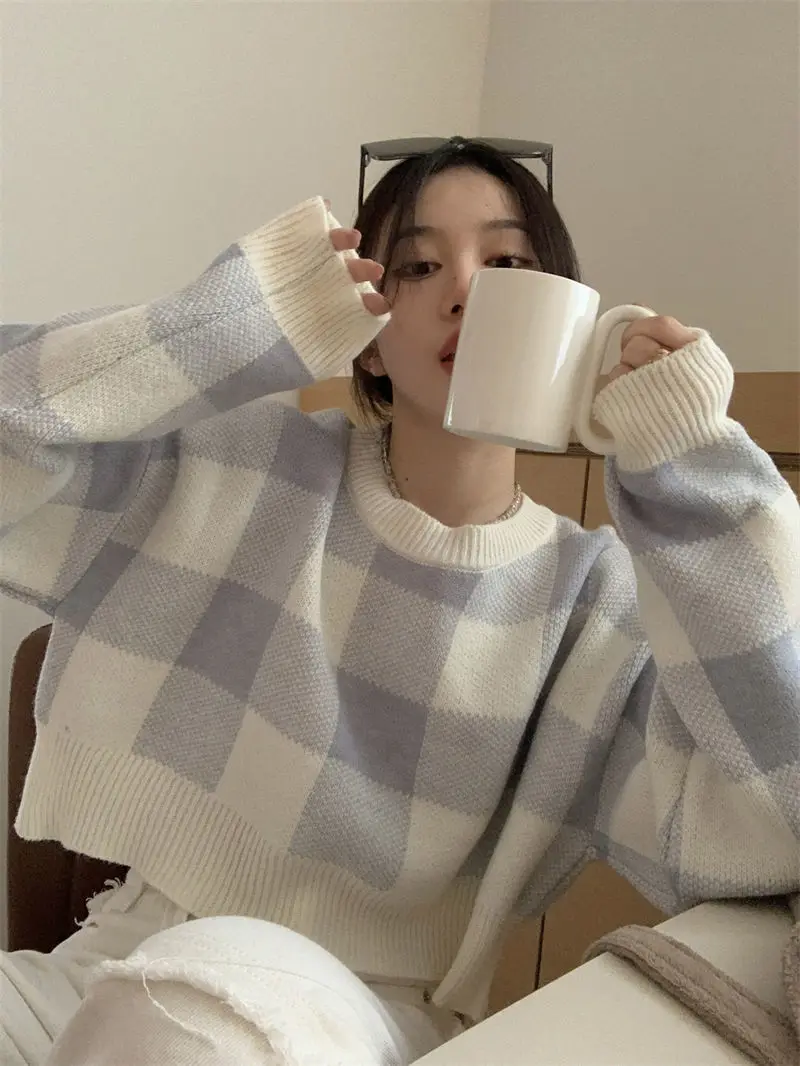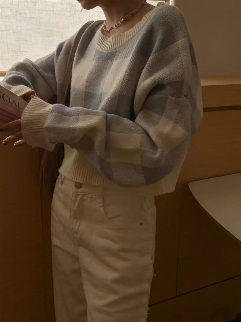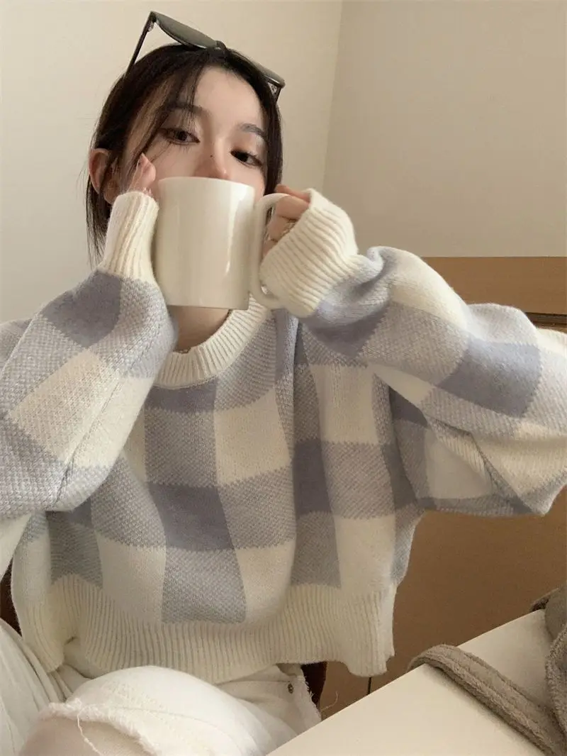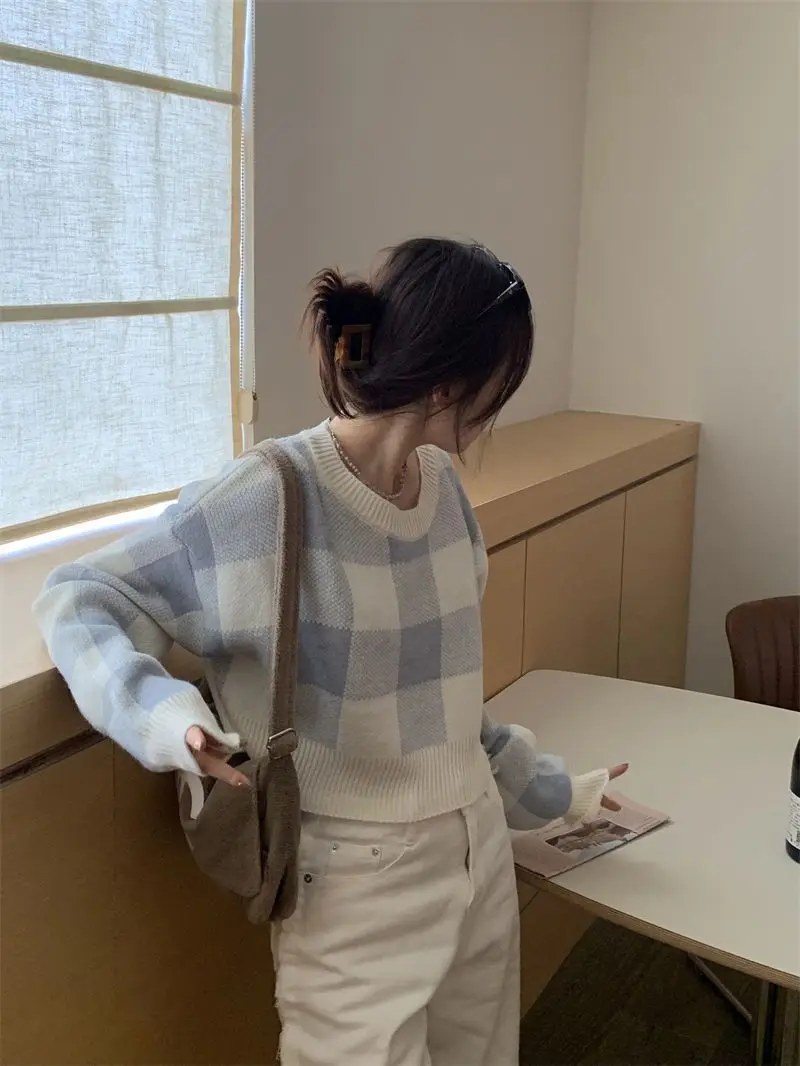 Yipinpay Crop Contrast Check Sweater Women Sueter Mujer Casual Knit Outwear Top 2023 Shirts for Women Blue Plaid Sweaters