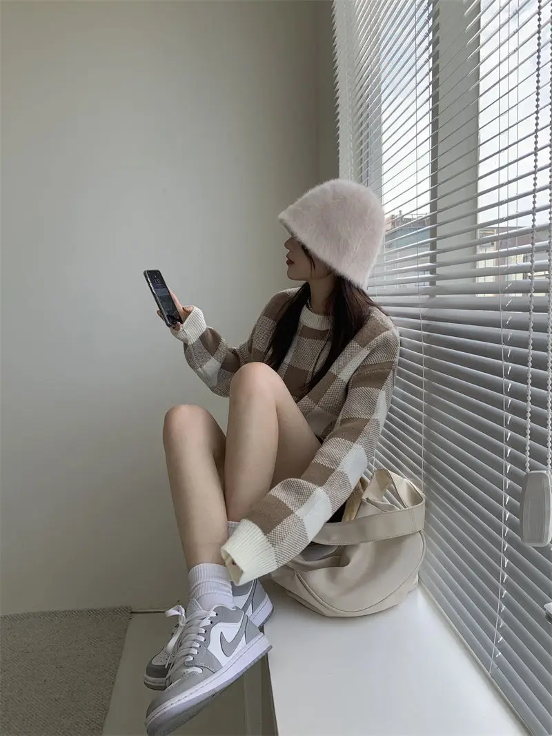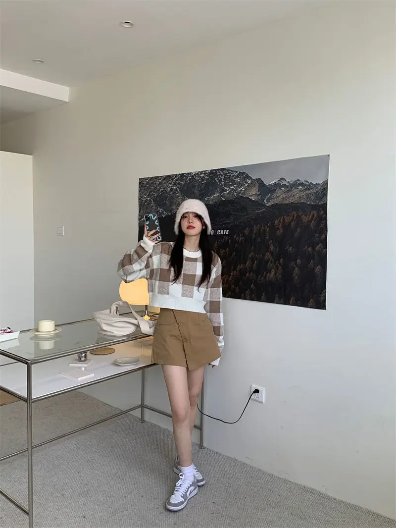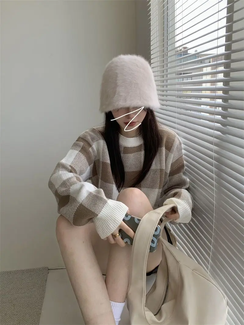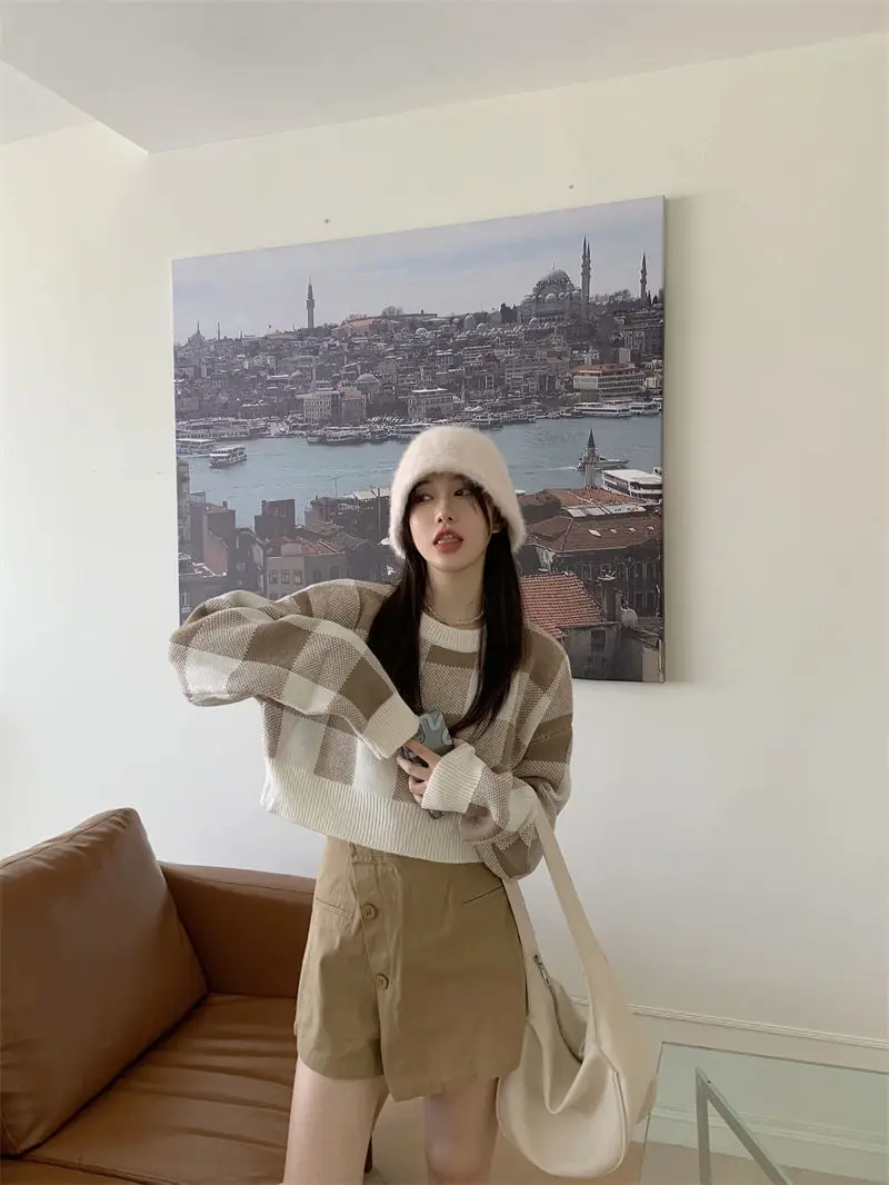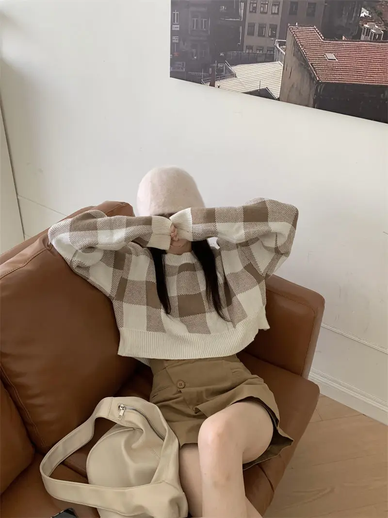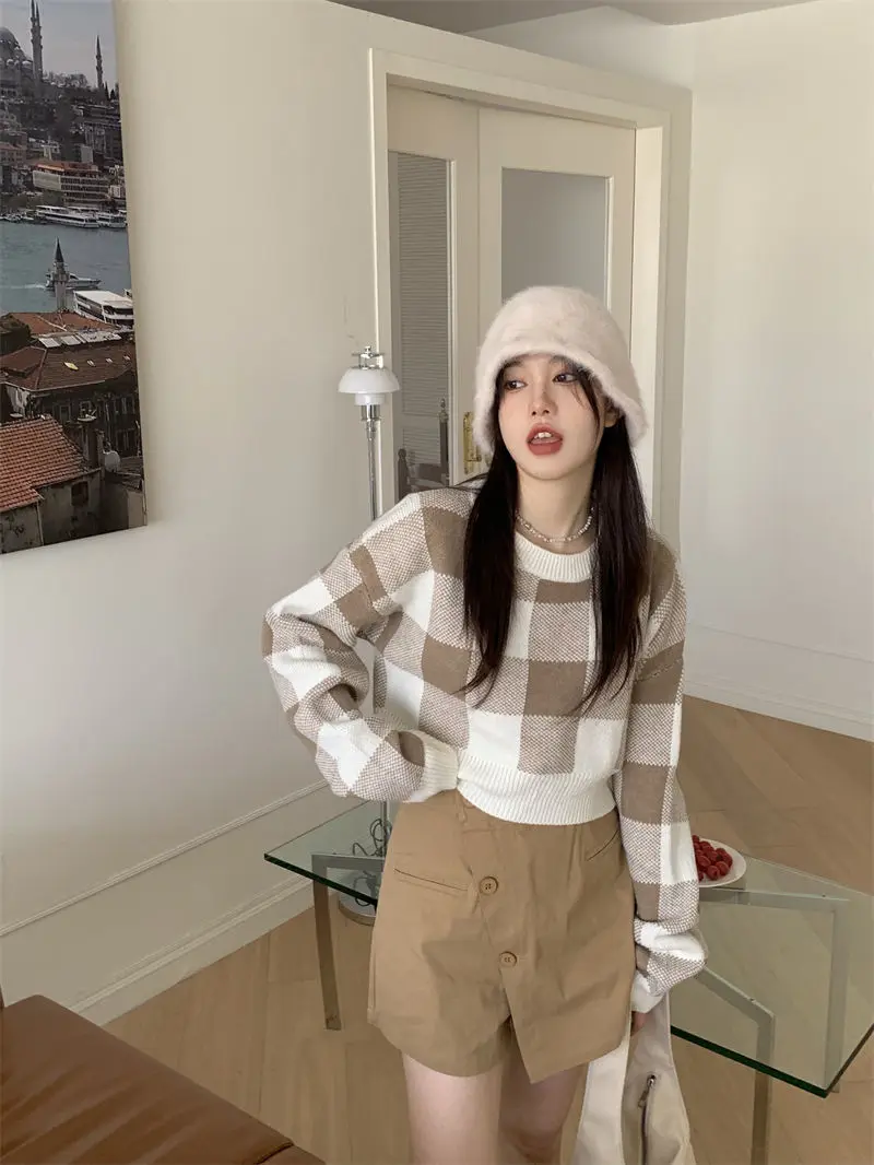 Yipinpay Crop Contrast Check Sweater Women Sueter Mujer Casual Knit Outwear Top 2023 Shirts for Women Blue Plaid Sweaters