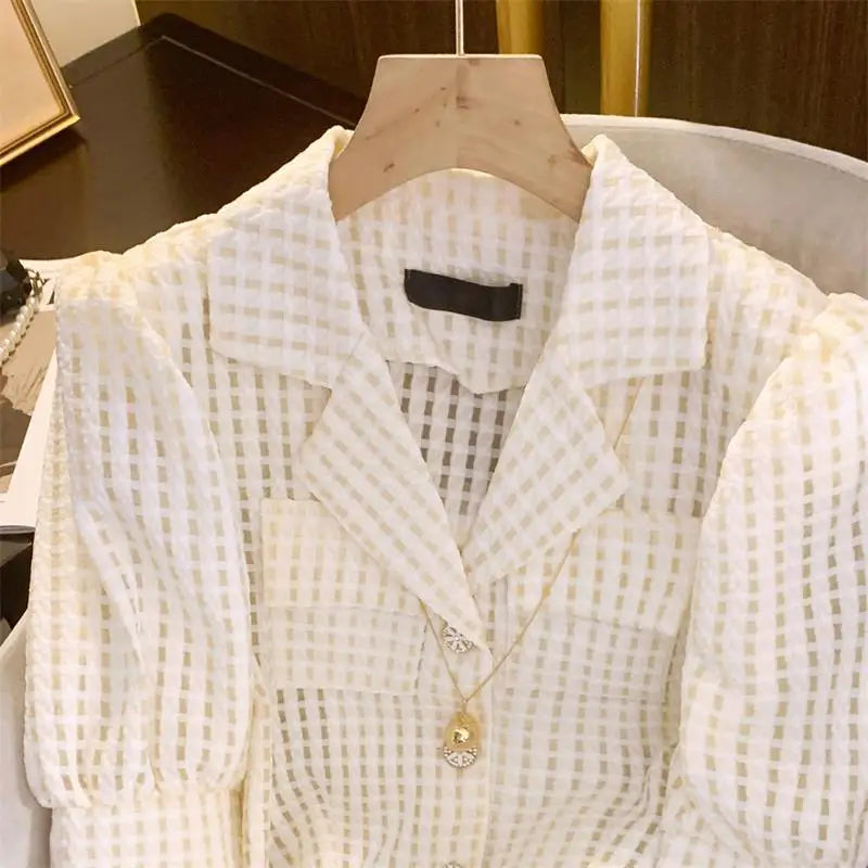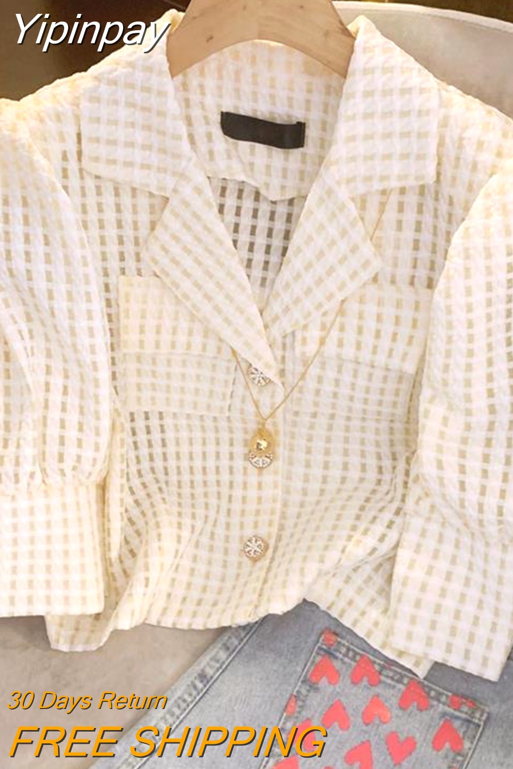Yipinpay Crop Top Short Sleeve Blusas Mujer Puff Plaid Shirt Female Casual Suit Camisas Femme Striped Blouse Summer New Elegant