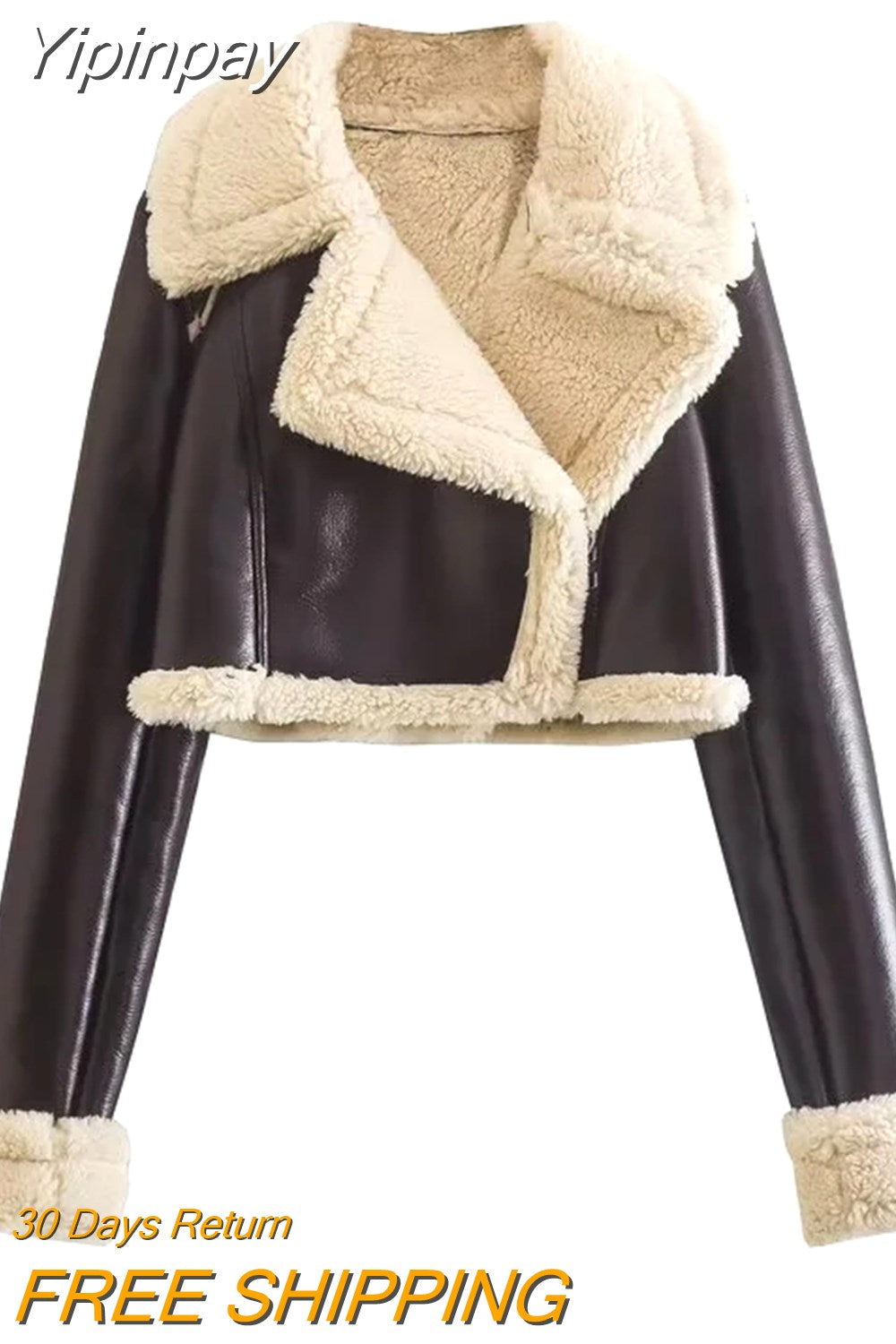 Yipinpay Cropped Fleece Jacket Women Black Faux Leather Jacket Woman 2023 Double Faced Women's Winter Jackets Warm Zip Up Short Coat