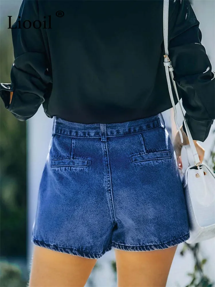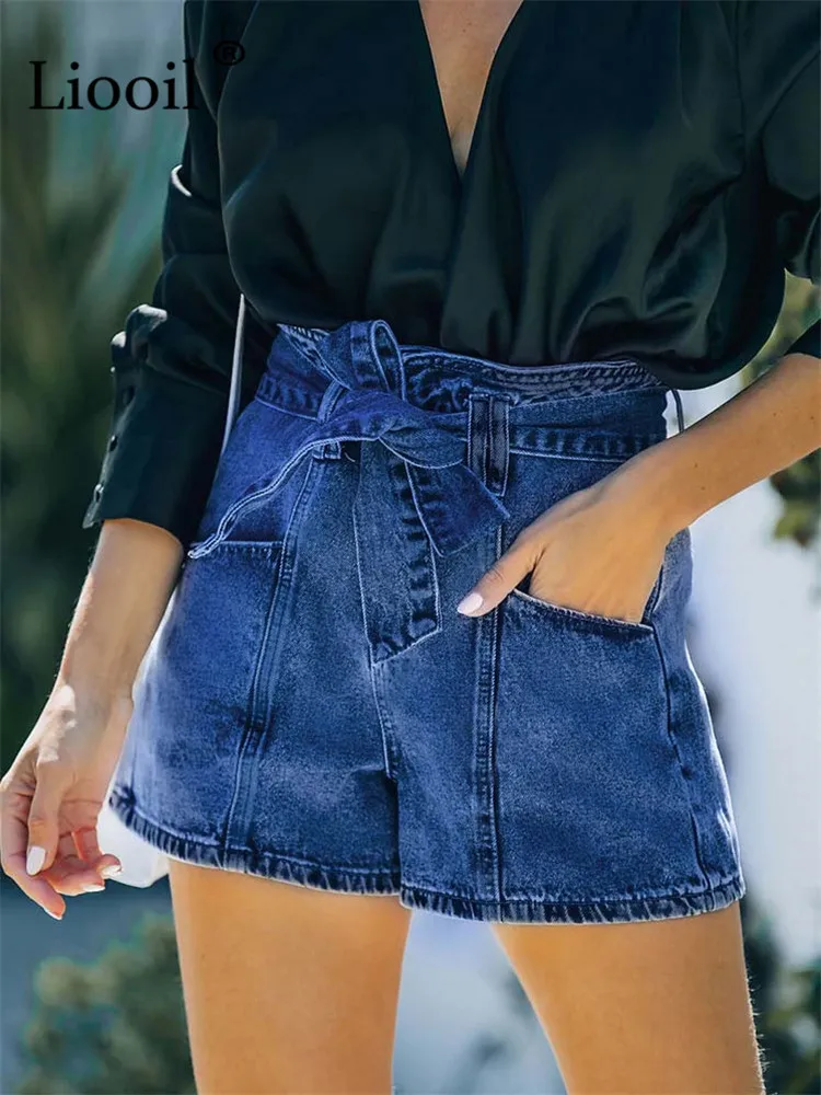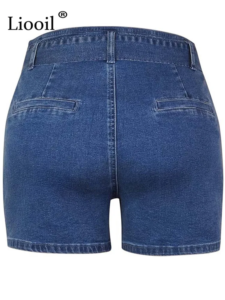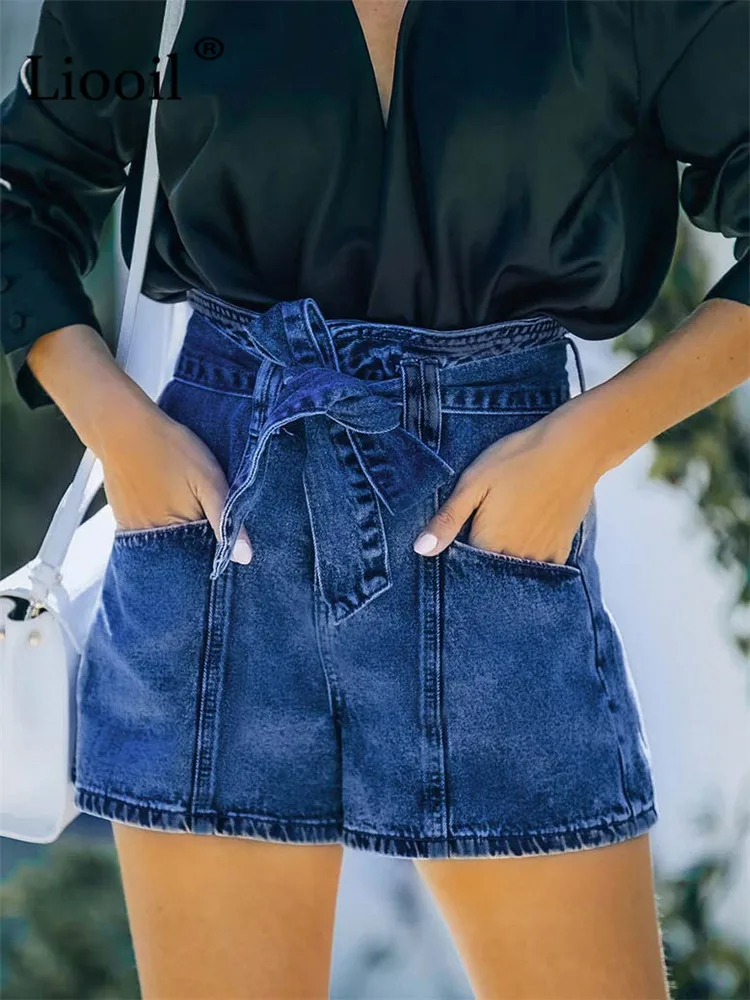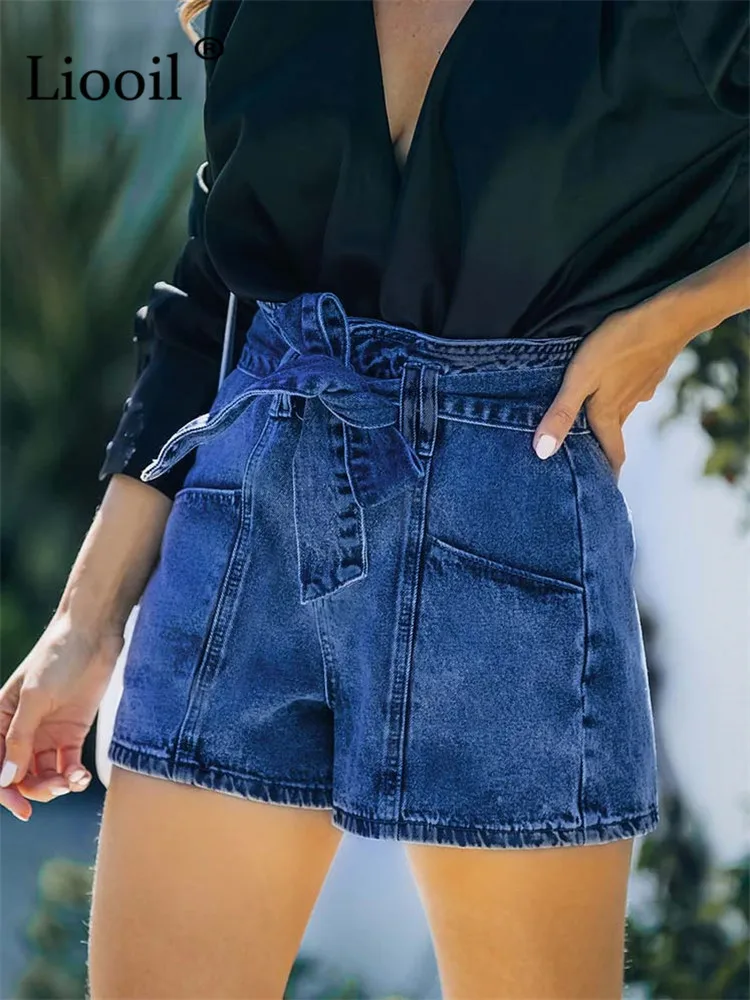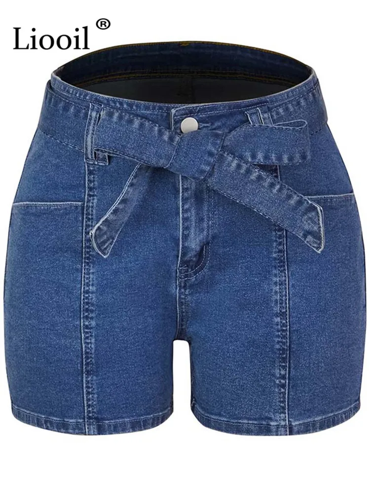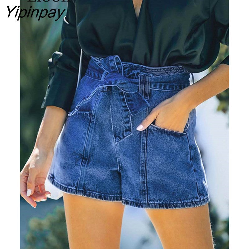 Yipinpay Dark Blue Cotton Skinny Jean Shorts With Belts Pockets Women High Waist Trousers Streetwear Drawstring Sexy Denim Shorts